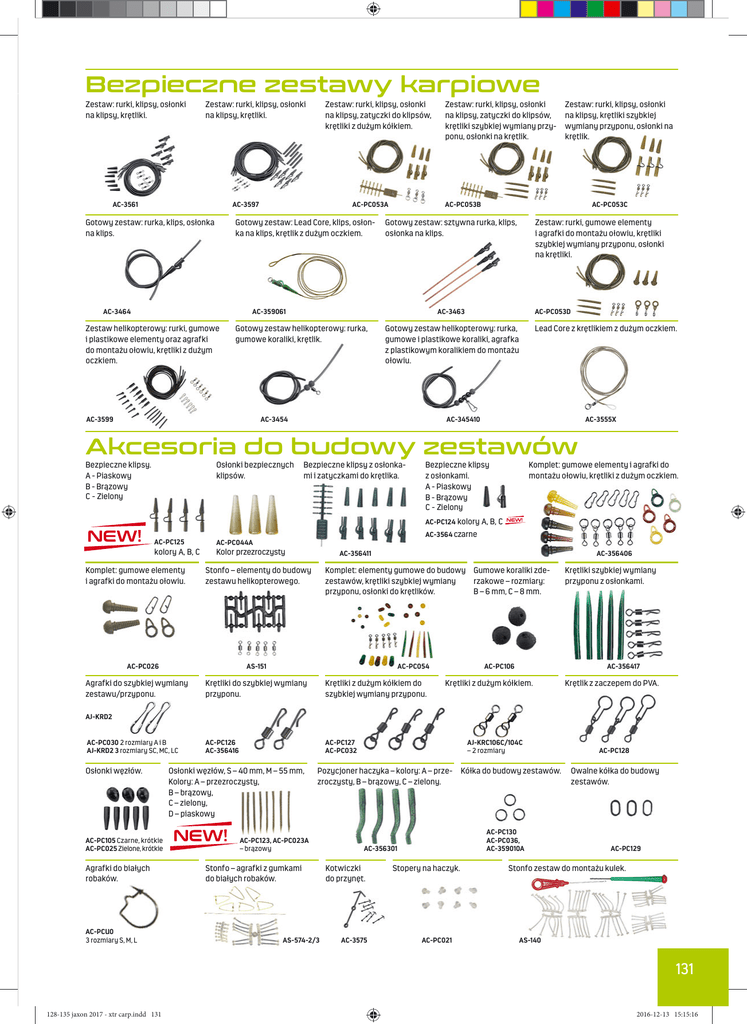 Bezpieczne zestawy karpiowe Zestaw: rurki, klipsy, osłonki na klipsy, krętliki. Zestaw: rurki, klipsy, osłonki na klipsy, krętliki. AC-3561 Zestaw: rurki, klipsy, osłonki na klipsy, zatyczki do klipsów, krętliki z dużym kółkiem. AC-PC053A AC-3597 Gotowy zestaw: rurka, klips, osłonka na klips. Gotowy zestaw: Lead Core, klips, osłonka na klips, krętlik z dużym oczkiem. AC-3464 AC-3599 AC-PC053C Gotowy zestaw: sztywna rurka, klips, osłonka na klips. Zestaw: rurki, gumowe elementy i agrafki do montażu ołowiu, krętliki szybkiej wymiany przyponu, osłonki na krętliki. AC-PC053D AC-3463 Gotowy zestaw helikopterowy: rurka, gumowe koraliki, krętlik. Zestaw: rurki, klipsy, osłonki na klipsy, krętliki szybkiej wymiany przyponu, osłonki na krętlik. AC-PC053B AC-359061 Zestaw helikopterowy: rurki, gumowe i plastikowe elementy oraz agrafki do montażu ołowiu, krętliki z dużym oczkiem. Zestaw: rurki, klipsy, osłonki na klipsy, zatyczki do klipsów, krętliki szybkiej wymiany przyponu, osłonki na krętlik. Gotowy zestaw helikopterowy: rurka, gumowe i plastikowe koraliki, agrafka z plastikowym koralikiem do montażu ołowiu. AC-3454 Lead Core z krętlikiem z dużym oczkiem. AC-345410 AC-3555X Akcesoria do budowy zestawów Bezpieczne klipsy. A - Piaskowy B - Brązowy C - Zielony Osłonki bezpiecznych klipsów. Bezpieczne klipsy z osłonkami i zatyczkami do krętlika. Bezpieczne klipsy z osłonkami. A - Piaskowy B - Brązowy C - Zielony Komplet: gumowe elementy i agrafki do montażu ołowiu, krętliki z dużym oczkiem. AC-PC124 kolory A, B, C AC-3564 czarne AC-PC125 AC-PC044A kolory A, B, C Kolor przezroczysty Komplet: gumowe elementy i agrafki do montażu ołowiu. AC-356411 Stonfo – elementy do budowy zestawu helikopterowego. AC-PC026 AC-356406 Komplet: elementy gumowe do budowy Gumowe koraliki zdezestawów, krętliki szybkiej wymiany rzakowe – rozmiary: przyponu, osłonki do krętlików. B – 6 mm, C – 8 mm. AS-151 Agrafki do szybkiej wymiany zestawu/przyponu. AC-PC054 Krętliki do szybkiej wymiany przyponu. Krętliki z dużym kółkiem do szybkiej wymiany przyponu. AC-PC126 AC-356416 AC-PC127 AC-PC032 Krętliki szybkiej wymiany przyponu z osłonkami. AC-356417 AC-PC106 Krętliki z dużym kółkiem. Krętlik z zaczepem do PVA. AJ-KRD2 AC-PC030 2 rozmiary A i B AJ-KRD2 3 rozmiary SC, MC, LC Osłonki węzłów. AC-PC105 Czarne, krótkie AC-PC025 Zielone, krótkie Agrafki do białych robaków. AC-PCU0 3 rozmiary S, M, L Osłonki węzłów, S – 40 mm, M – 55 mm, Kolory: A – przezroczysty, B – brązowy, C – zielony, D – piaskowy AJ-KRC106C/104C – 2 rozmiary Pozycjoner haczyka – kolory: A – prze- Kółka do budowy zestawów. zroczysty, B – brązowy, C – zielony. AC-PC123, AC-PC023A – brązowy Stonfo – agrafki z gumkami do białych robaków. AS-574-2/3 AC-PC130 AC-PC036, AC-359010A AC-356301 Kotwiczki do przynęt. AC-3575 Stopery na haczyk. AC-PC021 AC-PC128 Owalne kółka do budowy zestawów. AC-PC129 Stonfo zestaw do montażu kulek. AS-140 131 128-135 jaxon 2017 - xtr carp.indd 131 2016-12-13 15:15:16
