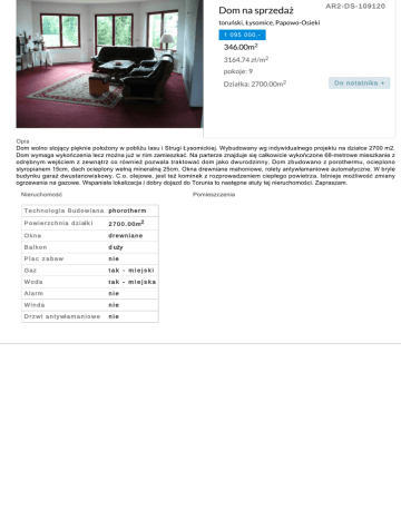 Dom na sprzedaż AR2-DS-109120 toruński, Łysomice, Papowo-Osieki 1 095 000,- 346.00m2 3164.74 zł/m2 pokoje: 9 Działka: 2700.00m2 Do notatnika + Opis Dom wolno stojący pięknie położony w pobliżu lasu i Strugi Łysomickiej. Wybudowany wg indywidualnego projektu na działce 2700 m2. Dom wymaga wykończenia lecz można już w nim zamieszkać. Na parterze znajduje się całkowicie wykończone 68-metrowe mieszkanie z odrębnym wejściem z zewnątrz co również pozwala traktować dom jako dwurodzinny. Dom zbudowano z porothermu, ocieplono styropianem 15cm, dach ocieplony wełną mineralną 25cm. Okna drewniane mahoniowe, rolety antywłamaniowe automatyczne. W bryle budynku garaż dwustanowiskowy. C.o. olejowe, jest też kominek z rozprowadzeniem ciepłego powietrza. Istnieje możliwość zmiany ogrzewania na gazowe. Wspaniała lokalizacja i dobry dojazd do Torunia to następne atuty tej nieruchomości. Zapraszam. Nieruchomość Pomieszczenia Technologia Budowlana phorotherm P o w i e r z c h n i a d z i ał k i 2 7 0 0 . 0 0 m2 Okna drewniane Balkon d uży Plac zabaw nie Gaz tak - miejski Woda tak - miejska Alarm nie Winda nie D r z w i a n t y wł a m a n i o w e nie