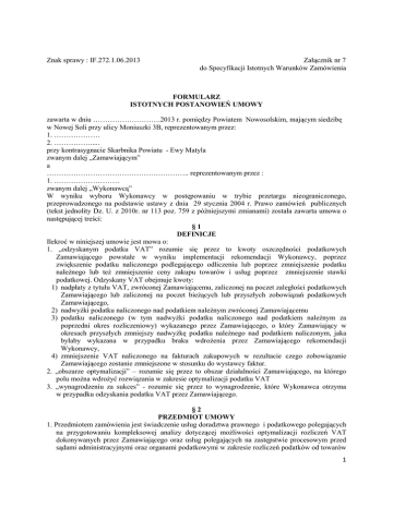 Znak sprawy : IF.272.1.06.2013 Załącznik nr 7 do Specyfikacji Istotnych Warunków Zamówienia FORMULARZ ISTOTNYCH POSTANOWIEŃ UMOWY zawarta w dniu ……………………….2013 r. pomiędzy Powiatem Nowosolskim, mającym siedzibę w Nowej Soli przy ulicy Moniuszki 3B, reprezentowanym przez: 1. ………………. 2. ……………..... przy kontrasygnacie Skarbnika Powiatu - Ewy Matyla zwanym dalej „Zamawiającym” a ………………………………………………….. reprezentowanym przez : 1. ……………………… zwanym dalej „Wykonawcą” W wyniku wyboru Wykonawcy w postępowaniu w trybie przetargu nieograniczonego, przeprowadzonego na podstawie ustawy z dnia 29 stycznia 2004 r. Prawo zamówień publicznych (tekst jednolity Dz. U. z 2010r. nr 113 poz. 759 z późniejszymi zmianami) została zawarta umowa o następującej treści: §1 DEFINICJE Ilekroć w niniejszej umowie jest mowa o: 1. „odzyskanym podatku VAT” rozumie się przez to kwoty oszczędności podatkowych Zamawiającego powstałe w wyniku implementacji rekomendacji Wykonawcy, poprzez zwiększenie podatku naliczonego podlegającego odliczeniu lub poprzez zmniejszenie podatku należnego lub też zmniejszenie ceny zakupu towarów i usług poprzez zmniejszenie stawki podatkowej. Odzyskany VAT obejmuje kwoty: 1) nadpłaty z tytułu VAT, zwróconej Zamawiającemu, zaliczonej na poczet zaległości podatkowych Zamawiającego lub zaliczonej na poczet bieżących lub przyszłych zobowiązań podatkowych Zamawiającego, 2) nadwyżki podatku naliczonego nad podatkiem należnym zwróconej Zamawiającemu 3) podatku naliczonego (w tym nadwyżki podatku naliczonego nad podatkiem należnym za poprzedni okres rozliczeniowy) wykazanego przez Zamawiającego, o który Zamawiający w okresach przyszłych zmniejszy nadwyżkę podatku należnego nad podatkiem naliczonym, jaka byłaby wykazana w przypadku braku wdrożenia przez Zamawiającego rekomendacji Wykonawcy, 4) zmniejszenie VAT naliczonego na fakturach zakupowych w rezultacie czego zobowiązanie Zamawiającego zostanie zmniejszone w stosunku do wystawcy faktur. 2. „obszarze optymalizacji” – rozumie się przez to obszar działalności Zamawiającego, na którego polu można wdrożyć rozwiązania w zakresie optymalizacji podatku VAT 3. „wynagrodzeniu za sukces” - rozumie się przez to wynagrodzenie, które Wykonawca otrzyma w przypadku odzyskania podatku VAT przez Zamawiającego. §2 PRZEDMIOT UMOWY 1. Przedmiotem zamówienia jest świadczenie usług doradztwa prawnego i podatkowego polegających na przygotowaniu kompleksowej analizy dotyczącej możliwości optymalizacji rozliczeń VAT dokonywanych przez Zamawiającego oraz usług polegających na zastępstwie procesowym przed sądami administracyjnymi oraz organami podatkowymi w zakresie rozliczeń podatków od towarów 1 i usług oraz doradztwie w zakresie przedmiotowego zastępstwa procesowego, zgodnie ze złożoną ofertą, która stanowi załącznik do umowy. 2. Przedmiot niniejszej umowy obejmuje zdarzenia i transakcje, które : 1) miały miejsce w przeszłości, 2) są dokonywane obecnie, 3) będą realizowane w budżecie obecnym oraz przyszłym, a także 4) inne przyszłe zdarzenia, o ile takie żądanie zgłosi Zamawiający w trakcie trwania niniejszej umowy 3. Zastosowanie wskazanych przez Wykonawcę rozwiązań będzie każdorazowo wymagało zgody Zamawiającego. Zamawiający może podjąć decyzję o: 1) pełnej akceptacji rekomendacji Wykonawcy, 2) akceptacji jedynie wybranych rekomendacji, 3) zawieszeniu realizacji fazy wdrożeniowej, 4) rezygnacji z realizacji fazy, wdrożeniowej. 3. Usługi o których mowa w ust. 1podzielone są na dwie fazy: 1)Fazę wstępną-diagnostyczną – zakończoną pisemnym raportem o którym mowa w § 3 ust. 1 pkt.3) 2) Fazę wdrożeniową – zakończona odzyskaniem VAT przez Zamawiającego w wyniku czynności zarekomendowanych przez Wykonawcę, a także czynności podjętych przez Wykonawcę w imieniu i na rzecz Zamawiającego. §3 FAZA WSTĘPNA - DIAGNOSTYCZNA Usługi świadczone w ramach fazy wstępnej będą polegać w szczególności na : 1) przeglądzie podstawowych obszarów działalności Zamawiającego oraz jednostek organizacyjnych Zamawiającego, które mogą przyczynić się do optymalizacji rozliczeń VAT przez Zamawiającego, 2) identyfikacji możliwości optymalizacji VAT i oceny szans na skuteczne i bezpieczne przeprowadzenie optymalizacji, 3) sporządzeniu raportu zawierającego ocenę istniejącego stanu rozliczeń VAT oraz rekomendacje Wykonawcy, w szczególności: a) prezentację możliwych obszarów optymalizacji rozliczeń VAT dokonanych przez Zamawiającego, b) wstępne oszacowanie możliwej do odzyskania przez Zamawiającego kwoty VAT, c) oszacowanie prawdopodobieństwa skutecznego wdrożenia proponowanych rozwiązań optymalizacyjnych, d) oszacowanie, zgodnie z najlepszą wiedzą i doświadczeniem zawodowym Wykonawcy, poziomu ryzyka zakwestionowania przez organy podatkowe zaprezentowanych rozwiązań optymalizacyjnych, e) rekomendacje oraz wskazanie praktycznych działań zmierzających do wdrożenia rozwiązań optymalizacji, w tym zmian w strukturze organizacyjnej Zamawiającego, f) rekomendacje oraz wskazanie praktycznych działań zmierzających do zminimalizowania ryzyka zakwestionowania przez organy podatkowe zaprezentowanych i wdrażanych rozwiązań optymalizacyjnych. §4 FAZA WDROŻENIOWA 1.Faza wdrożeniowa polega na zrealizowaniu oszczędności we wskazanych w raporcie obszarach rozliczeń VAT dokonywanych przez Zamawiającego , tj. na odzyskaniu kwot podatku VAT w tym w drodze postępowania podatkowego lub sądowo-administracyjnego. 2. Zakres fazy wdrożeniowej zostanie szczegółowo ustalony po zakończeniu fazy wstępnej zgodnie z potrzebami i oczekiwaniami Zamawiającego. 2 3. Zamawiający w formie pisemnej, w terminie uzgodnionym z Wykonawcą, poinformuje czy akceptuje rekomendacje Wykonawcy przedstawione w raporc