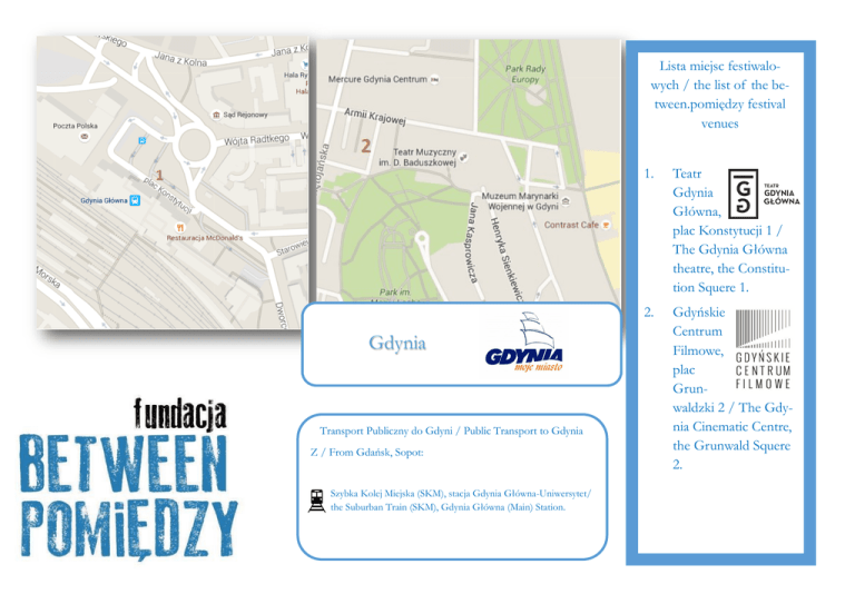 Lista miejsc festiwalowych / the list of the between.pomiędzy festival venues Gdynia Transport Publiczny do Gdyni / Public Transport to Gdynia Z / From Gdańsk, Sopot: Szybka Kolej Miejska (SKM), stacja Gdynia Główna-Uniwersytet/ the Suburban Train (SKM), Gdynia Główna (Main) Station. 1. Teatr Gdynia Główna, plac Konstytucji 1 / The Gdynia Główna theatre, the Constitution Squere 1. 2. Gdyńskie Centrum Filmowe, plac Grunwaldzki 2 / The Gdynia Cinematic Centre, the Grunwald Squere 2.