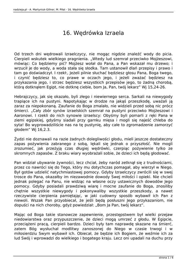 nadzieja.pl - A. Martyniuk-Gillner, M. Piłat - 16. Wędrówka Izraela 16. Wędrówka Izraela Od trzech dni wędrowali Izraelczycy, nie mogąc nigdzie znaleźć wody do picia. Cierpieli wskutek wielkiego pragnienia. „Wtedy lud szemrał przeciwko Mojżeszowi, mówiąc: Co będziemy pić? Mojżesz wołał do Pana, a Pan wskazał mu drzewo; i wrzucił je do wody, a woda stała się słodka. Tam ustanowił dlań przepisy i prawo i tam go doświadczył. I rzekł:, Jeżeli pilnie słuchać będziesz głosu Pana, Boga twego, i czynić będziesz to, co prawe w oczach jego, i jeżeli zważać będziesz na przykazania jego, i strzec będziesz wszystkich przepisów jego, to żadną chorobą, którą dotknąłem Egipt, nie dotknę ciebie, bom Ja, Pan, twój lekarz” Wj 15,24-26. Hebrajczycy, jak się okazało, byli złego i niewiernego serca. Sarkali na niewygody trapiące ich na pustyni. Napotykając w drodze na jakąś przeszkodę, uważali ją zaraz za niepokonaną. Zaufanie do Boga zmalało, nie widzieli przed sobą nic prócz śmierci. „Cały zbór synów izraelskich szemrał na pustyni przeciwko Mojżeszowi i Aaronowi. I rzekli do nich synowie izraelscy: Obyśmy byli pomarli z ręki Pana w ziemi egipskiej, gdyśmy siadali przy garnku mięsa i mogli się najeść chleba do syta! Bo wyprowadziliście nas na tę pustynię, aby całe to zgromadzenie zamorzyć głodem” Wj 16,2.3. Żydzi nie doznawali na razie żadnych dolegliwości głodu, mieli jeszcze dostateczny zapas pożywienia zabranego z sobą, lękali się jednak o przyszłość. Nie mogli zrozumieć, jak przeżyją czas długiej wędrówki, czerpiąc pożywienie tylko ze skromnych zapasów. Z braku wiary wyobrażali sobie, że dzieci ich będą głodować. Pan widział ubywanie żywności, lecz chciał, żeby naród zetknął się z trudnościami, przez co nawróci się do Tego, który mu dotychczas pomagał, aby wierzył w Niego. Był gotów udzielić natychmiastowej pomocy. Gdyby Izraelczycy zwrócili się w swej trosce do Pana, okazałby im niezawodnie dowody Swej miłości i opieki. Nie chcieli jednak polegać na Panu, nie widząc na własne oczy ustawicznych dowodów Jego pomocy. Gdyby posiadali prawdziwą wiarę i mocne zaufanie do Boga, znosiliby chętnie wszystkie niewygody i pokonywaliby wszystkie przeszkody, a nawet rzeczywiste cierpienia pamiętając, w jaki cudowny sposób wybawił ich Pan z niewoli. Wszak Pan przyobiecał, że jeśli będą posłuszni Jego przykazaniom, nie dopuści na nich choroby, gdyż powiedział: „Bom Ja Pan, twój lekarz”. Mając od Boga takie stanowcze zapewnienie, przestępstwem był wielki przejaw niedowiarstwa oraz przypuszczenie, że dzieci mogą umrzeć z głodu. W Egipcie, przeciążeni pracą, cierpieli bardzo. Dzieci były tam naprawdę skazane na śmierć, zatem Bóg wysłuchał modlitwy zanoszonej do Niego w czasie trwogi i w miłosierdziu Swym wybawił ich. Obiecał, że będzie ich Bogiem, że weźmie ich za lud Swój i wprowadzi do wielkiego i bogatego kraju. Lecz oni upadali na duchu przy strona 1 / 6 nadzieja.pl - A. Martyniuk-Gillner, M. Piłat - 16. Wędrówka Izraela każdym cierpieniu, jakie musieli znosić w drodze do tego obiecanego kraju. W służbie Egipcjan cierpieli dużo, teraz nie chcieli cierpieć w służbie Boga. Skoro tylko przychodziła jakakolwiek próba, wpadali natychmiast w ponure zwątpienie i zniechęcenie. Szemrali wówczas przeciwko wiernemu słudze Bożemu, przypisując jemu winę za wszystkie swoje niepowodzenia i wypowiadali bluźniercze uwagi, że woleliby zostać w Egipcie, gdzie zasiadali przy kotłach z mięsem i mieli chleba do syta. NAUKA NA NASZ CZAS Niesprawiedliwość i szemranie synów izraelskich przedstawia lud Boży na ziemi w ostatnim czasie. Wielu czytających historię starotestamentowego Izraela dziwi się jego niedowiarstwu i ustawicznemu szemraniu, mimo tak wielkich dowodów bezustannej miłości i troskliwości Boga. Tymczasem ci, którzy tak myślą, sami szemrzą i narzekają na rzeczy jeszcze mniej znaczące. Nie znają siebie. Bóg często doświadcza i próbuje wiarę w małych rzeczach, lecz często, tak jak Izrael w dawnych czasach, nie wytrzymuje się próby. Wielu ma wszystko, co jest potrzebne do utrzymania życia, jednak nie ufa Panu, jeśli chodzi o przyszłość. Okazuje niedowiarstwo, kłopocze się i martwi tym, co będzie. Wielu ustawicznie lęka się, że przyjdzie niedostatek i dzieci będą cierpiały. Gdy przychodzą chwile trudne i trzeba się ograniczyć, gdy doświadczone bywają wiara i miłość do Boga, cofają się przed próbą i szemrzą przeciwko sposobom, jakich używa Bóg, by człowieka oświecić. Wtedy miłość okazuje się nie dość wielka i doskonała, aby można było wytrwać. Wiara ludu Bożego powinna być silna, skuteczna i wytrwała. Ma być gruntem rzeczy, których oczekujemy. Wtedy będziemy mogli zawsze powiedzieć: „Błogosław, duszo moja, Panu i wszystko, co we mnie, imieniu jego świętemu!” Ps 13,1, gdyż obdarzył nas wszelką obfitością. Niektórzy traktują każde ograniczenie jako cierpienie. Dogadzają swemu złemu smakowi. Poskromienie niezdrowego apetytu może doprowadzić niektórych chrześcijan z nazwy, nawet do cofnięcia się z drogi prawdy, bowiem uważają oni dietę za śmiertelną głodówkę. Podobnie jak synowie izraelscy wybraliby raczej niewolę, chorobę a nawet śmierć, niż wyrzeczenie się garnków z mięsem. Chleb i woda, to wszystko, co jest obiecane ostatkom w czasie ucisku. MANNA „A gdy warstwa rosy się podniosła, oto na powierzchni pustyni było coś drobnego, ziarnistego, drobnego niby szron na ziemi. Gdy to ujrzeli synowie izraelscy, mówili jeden do drugiego: Co to jest? — bo nie wiedzieli co to było. A Mojżesz rzekł do nich: To jest chleb, który Pan dał wam do jedzenia. Oto, co rozkazał Pan: Zbierajcie z niego, każdy według tego, ile potrzebuje do jedzenia, omer na głowę. Niechaj każdy zbierze według liczby osób, które 
