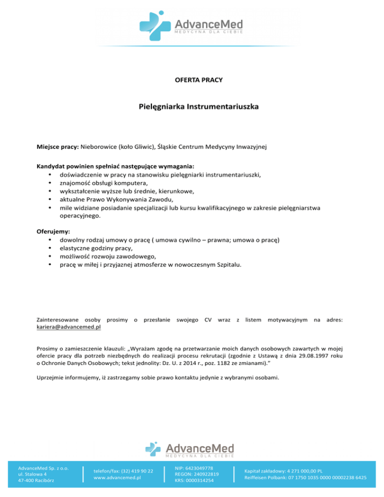 OFERTAPRACY PielęgniarkaInstrumentariuszka Miejscepracy:Nieborowice(kołoGliwic),ŚląskieCentrumMedycynyInwazyjnej Kandydatpowinienspełniaćnastępującewymagania: • doświadczeniewpracynastanowiskupielęgniarkiinstrumentariuszki, • znajomośćobsługikomputera, • wykształceniewyższelubśrednie,kierunkowe, • aktualnePrawoWykonywaniaZawodu, • milewidzianeposiadaniespecjalizacjilubkursukwalifikacyjnegowzakresiepielęgniarstwa operacyjnego. Oferujemy: • dowolnyrodzajumowyopracę(umowacywilno–prawna;umowaopracę) • elastycznegodzinypracy, • możliwośćrozwojuzawodowego, • pracęwmiłejiprzyjaznejatmosferzewnowoczesnymSzpitalu. Zainteresowane osoby prosimy o przesłanie swojego CV wraz z listem motywacyjnym na adres: [email protected] Prosimyozamieszczenieklauzuli:„Wyrażamzgodęnaprzetwarzaniemoichdanychosobowychzawartychwmojej ofercie pracy dla potrzeb niezbędnych do realizacji procesu rekrutacji (zgodnie z Ustawą z dnia 29.08.1997 roku oOchronieDanychOsobowych;tekstjednolity:Dz.U.z2014r.,poz.1182zezmianami).” Uprzejmieinformujemy,iżzastrzegamysobieprawokontaktujedyniezwybranymiosobami. AdvanceMedSp.zo.o. ul.Stalowa4 47-400Racibórz telefon/fax:(32)4199022 www.advancemed.pl NIP:6423049778 REGON:240922819 KRS:0000314254 Kapitałzakładowy:4271000,00PL ReiffeisenPolbank:07175010350000000022386425