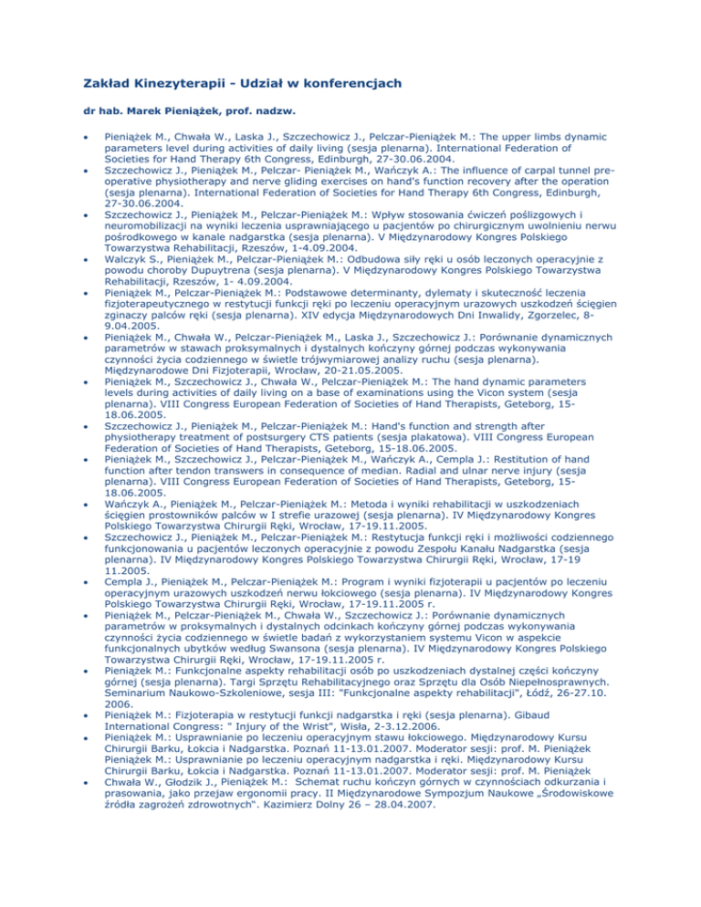 Zakład Kinezyterapii - Udział w konferencjach dr hab. Marek Pieniążek, prof. nadzw. • • • • • • • • • • • • • • • • • Pieniążek M., Chwała W., Laska J., Szczechowicz J., Pelczar-Pieniążek M.: The upper limbs dynamic parameters level during activities of daily living (sesja plenarna). International Federation of Societies for Hand Therapy 6th Congress, Edinburgh, 27-30.06.2004. Szczechowicz J., Pieniążek M., Pelczar- Pieniążek M., Wańczyk A.: The influence of carpal tunnel preoperative physiotherapy and nerve gliding exercises on hand's function recovery after the operation (sesja plenarna). International Federation of Societies for Hand Therapy 6th Congress, Edinburgh, 27-30.06.2004. Szczechowicz J., Pieniążek M., Pelczar-Pieniążek M.: Wpływ stosowania ćwiczeń poślizgowych i neuromobilizacji na wyniki leczenia usprawniającego u pacjentów po chirurgicznym uwolnieniu nerwu pośrodkowego w kanale nadgarstka (sesja plenarna). V Międzynarodowy Kongres Polskiego Towarzystwa Rehabilitacji, Rzeszów, 1-4.09.2004. Walczyk S., Pieniążek M., Pelczar-Pieniążek M.: Odbudowa siły ręki u osób leczonych operacyjnie z powodu choroby Dupuytrena (sesja plenarna). V Międzynarodowy Kongres Polskiego Towarzystwa Rehabilitacji, Rzeszów, 1- 4.09.2004. Pieniążek M., Pelczar-Pieniążek M.: Podstawowe determinanty, dylematy i skuteczność leczenia fizjoterapeutycznego w restytucji funkcji ręki po leczeniu operacyjnym urazowych uszkodzeń ścięgien zginaczy palców ręki (sesja plenarna). XIV edycja Międzynarodowych Dni Inwalidy, Zgorzelec, 89.04.2005. Pieniążek M., Chwała W., Pelczar-Pieniążek M., Laska J., Szczechowicz J.: Porównanie dynamicznych parametrów w stawach proksymalnych i dystalnych kończyny górnej podczas wykonywania czynności życia codziennego w świetle trójwymiarowej analizy ruchu (sesja plenarna). Międzynarodowe Dni Fizjoterapii, Wrocław, 20-21.05.2005. Pieniążek M., Szczechowicz J., Chwała W., Pelczar-Pieniążek M.: The hand dynamic parameters levels during activities of daily living on a base of examinations using the Vicon system (sesja plenarna). VIII Congress European Federation of Societies of Hand Therapists, Geteborg, 1518.06.2005. Szczechowicz J., Pieniążek M., Pelczar-Pieniążek M.: Hand's function and strength after physiotherapy treatment of postsurgery CTS patients (sesja plakatowa). VIII Congress European Federation of Societies of Hand Therapists, Geteborg, 15-18.06.2005. Pieniążek M., Szczechowicz J., Pelczar-Pieniążek M., Wańczyk A., Cempla J.: Restitution of hand function after tendon transwers in consequence of median. Radial and ulnar nerve injury (sesja plenarna). VIII Congress European Federation of Societies of Hand Therapists, Geteborg, 1518.06.2005. Wańczyk A., Pieniążek M., Pelczar-Pieniążek M.: Metoda i wyniki rehabilitacji w uszkodzeniach ścięgien prostowników palców w I strefie urazowej (sesja plenarna). IV Międzynarodowy Kongres Polskiego Towarzystwa Chirurgii Ręki, Wrocław, 17-19.11.2005. Szczechowicz J., Pieniążek M., Pelczar-Pieniążek M.: Restytucja funkcji ręki i możliwości codziennego funkcjonowania u pacjentów leczonych operacyjnie z powodu Zespołu Kanału Nadgarstka (sesja plenarna). IV Międzynarodowy Kongres Polskiego Towarzystwa Chirurgii Ręki, Wrocław, 17-19 11.2005. Cempla J., Pieniążek M., Pelczar-Pieniążek M.: Program i wyniki fizjoterapii u pacjentów po leczeniu operacyjnym urazowych uszkodzeń nerwu łokciowego (sesja plenarna). IV Międzynarodowy Kongres Polskiego Towarzystwa Chirurgii Ręki, Wrocław, 17-19.11.2005 r. Pieniążek M., Pelczar-Pieniążek M., Chwała W., Szczechowicz J.: Porównanie dynamicznych parametrów w proksymalnych i dystalnych odcinkach kończyny górnej podczas wykonywania czynności życia codziennego w świetle badań z wykorzystaniem systemu Vicon w aspekcie funkcjonalnych ubytków według Swansona (sesja plenarna). IV Międzynarodowy Kongres Polskiego Towarzystwa Chirurgii Ręki, Wrocław, 17-19.11.2005 r. Pieniążek M.: Funkcjonalne aspekty rehabilitacji osób po uszkodzeniach dystalnej części kończyny górnej (sesja plenarna). Targi Sprzętu Rehabilitacyjnego oraz Sprzętu dla Osób Niepełnosprawnych. Seminarium Naukowo-Szkoleniowe, sesja III: "Funkcjonalne aspekty rehabilitacji", Łódź, 26-27.10. 2006. Pieniążek M.: Fizjoterapia w restytucji funkcji nadgarstka i ręki (sesja plenarna). Gibaud International Congress: " Injury of the Wrist", Wisła, 2-3.12.2006. Pieniążek M.: Usprawnianie po leczeniu operacyjnym stawu łokciowego. Międzynarodowy Kursu Chirurgii Barku, Łokcia i Nadgarstka. Poznań 11-13.01.2007. Moderator sesji: prof. M. Pieniążek Pieniążek M.: Usprawnianie po leczeniu operacyjnym nadgarstka i ręki. Międzynarodowy Kursu Chirurgii Barku, Łokcia i Nadgarstka. Poznań 11-13.01.2007. Moderator sesji: prof. M. Pieniążek Chwała W., Głodzik J., Pieniążek M.: Schemat ruchu kończyn górnych w czynnościach odkurzania i prasowania, jako przejaw ergonomii pracy. II Międzynarodowe Sympozjum Naukowe „Środowiskowe źródła zagrożeń zdrowotnych“. Kazimierz Dolny 26 – 28.04.2007. • • • • • • • • • Pieniążek M., Pelczar – Pieniążek M.: Wybrane aspekty rehabilitacji ręki. V Zjazd Naukowy Polskiego Towarzystwa Chirurgii Ręki; II Zjazd Sekcji Terapeutów Ręki Polskiego Towarzystwa Fizjoterapii. Licheń 24 -26.05.2007. Prof. M. Pieniążek - członek Komitetu Naukowego Zjazdu, moderator sesji oraz organizator i współprowadzący workshopu na temat aparatowania Capenera. Pieniążek M., Pelczar – Pieniążek M., Kucia K., Szczechowicz J.: Metoda i wyniki restytucji funkcji stawu łokciowego po uszkodzeniach urazowych. V Zjazd Naukowy Polskiego Towarzystwa Chirurgii Ręki; II Zjazd Sekcji Terapeutów Ręki Polskiego Towarzystwa Fizjoterapii. Licheń 24 -26.05.2007. Prof. M. Pieniążek - członek Komitetu Naukowego Zjazdu, moderator s