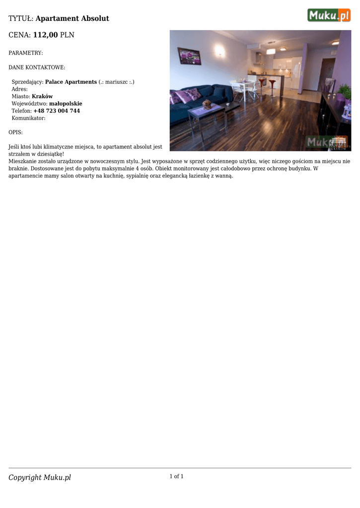 TYTUŁ: Apartament Absolut CENA: 112,00 PLN PARAMETRY: DANE KONTAKTOWE: Sprzedający: Palace Apartments (.: mariuszc :.) Adres: Miasto: Kraków Województwo: małopolskie Telefon: +48 723 004 744 Komunikator: OPIS: Jeśli ktoś lubi klimatyczne miejsca, to apartament absolut jest strzałem w dziesiątkę! Mieszkanie zostało urządzone w nowoczesnym stylu. Jest wyposażone w sprzęt codziennego użytku, więc niczego gościom na miejscu nie braknie. Dostosowane jest do pobytu maksymalnie 4 osób. Obiekt monitorowany jest całodobowo przez ochronę budynku. W apartamencie mamy salon otwarty na kuchnię, sypialnię oraz elegancką łazienkę z wanną. Copyright Muku.pl 1 of 1
