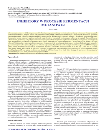dr in¿.Agnieszka PILARSKA Uniwersytet Przyrodniczy w Poznaniu, Instytut Technologii ¯ywnoœci Pochodzenia Roœlinnego e-mail: [email protected] mgr in¿. Kamil WITASZEK, prof. dr hab. in¿.Adam KRYSZTOFIAK, dr in¿. Krzysztof PILARSKI Uniwersytet Przyrodniczy w Poznaniu, Instytut In¿ynierii Biosystemów e-mail: [email protected] INHIBITORY W PROCESIE FERMENTACJI METANOWEJ Streszczenie Fermentacja metanowa (FM) jest procesem biochemicznym, podczas którego z substancji organicznej wytwarzany jest, przy udziale bakterii beztlenowych, biogaz. Proces ten jest jednoczeœnie jednym z bardziej ekonomicznych i przyjaznych œrodowisku sposobów zagospodarowania ró¿nego rodzaju odpadów organicznych. Mo¿na tutaj wymieniæ odpady z przemys³u rolno-spo¿ywczego, komunalne, zielone z terenów aglomeracyjnych, osady œciekowe czy odpady pochodz¹ce z rolnictwa, tj.: odpady lignocelulozowe, obornik oraz gnojowicê. FM jest procesem wieloetapowym, w którym wyró¿nia siê kolejno: hydrolizê, kwasogenezê, octanogenezê oraz metanogenezê. Fermentacja metanowa mo¿e zostaæ zak³ócona lub nawet zahamowana z ró¿-nych przyczyn. Jedn¹ z nich jest obecnoœæ inhibitorów w substratach i mieszaninach biogazowych. S¹ to substancje, które nawet w niewielkich stê¿eniach mog¹ byæ powodem nieprawid³owej pracy biogazowni. Obecnie rozpoznanych jest bardzo wiele rodzajów inhibitorów procesu FM. W niniejszej pracy zosta³y przedstawione najczêœciej wystêpuj¹ce, w postaci: amoniaku, metali ciê¿kich (Cu, Zn, Pb, Hg, Cr, Cd, Fe, Ni, Co oraz Mo), jonów metali lekkich (Na, K, Mg, Ca), zwi¹zków organicznych oraz zwi¹zków lignocelulozowych. Aby fermentacja mog³a przebiegaæ prawid³owo, nale¿y wyeliminowaæ dzia³anie inhibitorów zarówno tych, które dostaj¹ siê do komory fermentacyjnej z substratem, jak i tych, które generowane s¹ w procesie FM. S³owa kluczowe: inhibitory, fermentacja metanowa, produkcja biogazu Wprowadzenie Fermentacja metanowa (FM) jest procesem biochemicznym, w którym bakterie beztlenowe produkuj¹ gaz (zwany biogazem) z substancji organicznej. W sk³ad biogazu wchodzi miêdzy innymi metan, dwutlenek wêgla oraz œladowe iloœci siarkowodoru, amoniaku, pary wodnej i wodoru. Proces mo¿e odbywaæ siê w ró¿nych warunkach temperaturowych: psychrofilowych (<20°C), mezofilowych (25-40°C) lub termofilowych (50-65°C). W praktyce najczêœciej realizowan¹ jest fermentacja mezofilowa. Fermentacja metanowa jest jednym ze sposobów zagospodarowania ró¿nego rodzaju odpadów organicznych. Mo¿na tutaj wymieniæ odpady z przemys³u rolno-spo¿ywczego, komunalne, zielone z terenów aglomeracyjnych [1], osady œciekowe [2], odpady pochodz¹ce z rolnictwa, tj: odpady lignocelulozowe [3], obornik oraz gnojowicê [4]. FM jest procesem wieloetapowym, w którym wyró¿nia siê kolejno: hydrolizê, kwasogenezê, octanogenezê oraz metanogenezê [5]. W typowej biogazowni wymienione etapy przebiegaj¹ w jednym fermentorze. Bakterie z poszczególnych etapów wymagaj¹ ró¿nych warunków œrodowiskowych, st¹d wa¿ne jest znalezienie odpowiedniego kompromisu. Bakterie bior¹ce udzia³ w metanogenezie s¹ najbardziej wra¿liwe na zak³ócenia, a ich namna¿anie przebiega bardzo wolno, dlatego warunki panuj¹ce w fermentorze nale¿y dostosowaæ w³aœnie do nich. Fermentacja metanowa mo¿e zostaæ zak³ócona lub nawet zahamowana z ró¿nych przyczyn. Tak¹ przyczyn¹ mog¹ byæ b³êdy operatora instalacji biogazowej, wynikaj¹ce z braku doœwiadczenia oraz niewiedzy lub problemy techniczne. Drug¹ przyczyn¹ jest obecnoœæ inhibitorów w substratach i mieszaninach biogazowych. S¹ to substancje, które nawet w niewielkich stê¿eniach s¹ powodem nieprawid³owej pracy biogazowni. Inhibitory mog¹ byæ dostarczone do fermentora z pod³o¿em (zwi¹zki organiczne, metale ciê¿kie) lub mog¹ powstawaæ w procesach biochemicznych, zachodz¹cych wewn¹trz fermentora podczas FM (amoniak NH3, siarkowodór SO2). Inhibitory nawet w niewielkich stê¿eniach powoduj¹ zaburzenie w pracy biogazowni [6]. Rodzaje inhibitorów Obecnie znanych jest wiele rodzajów inhibitorów procesu fermentacji metanowej. W niniejszej pracy zosta³y przedstawione TECHNIKA ROLNICZA OGRODNICZA LEŒNA najczêœciej wystêpuj¹ce, takie jak: siarczki, amoniak, metale ciê¿kie, jony metali lekkich, zwi¹zki organiczne oraz zwi¹zki powsta³e podczas obróbki termiczno-ciœnieniowej substratów lignocelulozowych. Siarczki 2 - Siarczki (S , H2S) s¹ zwi¹zkami powszechnie wystêpuj¹cymi w: osadach œciekowych, poddawanych beztlenowemu oczyszczaniu [7], odpadach z garbarni, przemys³u petrochemicznego oraz w odpadach z rzeŸni. Bakterie, które bior¹ udzia³ w tworzeniu 2 siarczków z siarczanów (SO4 ), to bakterie redukuj¹ce siarczany (Sulfate Reducing Bacteria, SRB). Sulfate Reducing Bacteria odgrywaj¹ rolê jako inhibitor w czwartym etapie FM, czyli w metanogenezie. Doœwiadczenia dowiod³y, ¿e dzia³anie inhibituj¹ce SRB zwi¹zanie jest z konkurowaniem o wêgiel oraz wodór z bakteriami metanowymi. Jednym z siarczków hamuj¹cych proces fermentacji anaerobowej jest siarczek w formie niezdysocjowanej, czyli siarkowodór (H2S), powstaj¹cy w reakcji siar2 czanu SO4 z wodorem (H2) lub z kwasem octowym. Siarkowodór ze wzglêdu na swoj¹ obojêtn¹ postaæ, mo¿e ³atwo przenikaæ przez b³ony komórkowe. Ponadto wykazuje du¿¹ reaktywnoœæ z komórkami bakterii anaerobowych, które bior¹ udzia³ w tworzeniu metanu [7]. Oprócz tego, siarczki uczestnicz¹ w denaturacji bia³ka na skutek powstawania wi¹zañ poprzecznych miêdzy ³añcuchami polipeptydowymi, co prowadzi do zatrzymania produkcji enzymów metabolicznych w komórkach. Siarczki mog¹ tak¿e wp³ywaæ na asymilacjê siarki i wewn¹trzkomórkowe pH. Stê¿enia, które powoduj¹ zahamowanie procesu lub jego inhibicjê, 2 to dla H2S wartoœci powy¿ej 50 mg/l, dla S od 100 mg/l, natomiast dla Na2S od 160 mg/l. Je¿eli w fermentorze wystêpuj¹ ba