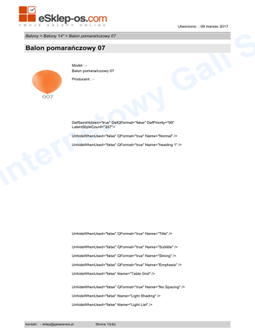 Utworzono : 08 marzec 2017 S li Balony > Balony 14" > Balon pomarańczowy 07 Balon pomarańczowy 07 a G y w o t e n r Model : - Balon pomarańczowy 07 Producent : - DefSemiHidden="true" DefQFormat="false" DefPriority="99" LatentStyleCount="267"> UnhideWhenUsed="false" QFormat="true" Name="Normal" /> e t in UnhideWhenUsed="false" QFormat="true" Name="heading 1" /> UnhideWhenUsed="false" QFormat="true" Name="Title" /> UnhideWhenUsed="false" QFormat="true" Name="Subtitle" /> UnhideWhenUsed="false" QFormat="true" Name="Strong" /> UnhideWhenUsed="false" QFormat="true" Name="Emphasis" /> UnhideWhenUsed="false" Name="Table Grid" /> UnhideWhenUsed="false" QFormat="true" Name="No Spacing" /> UnhideWhenUsed="false" Name="Light Shading" /> UnhideWhenUsed="false" Name="Light List" /> kontakt : - [email protected] Strona 1/{nb} Utworzono : 08 marzec 2017 S li Balony > Balony 14" > Balon pomarańczowy 07 Balon pomarańczowy 07 a G y w o t e n r UnhideWhenUsed="false" Name="Light Grid" /> UnhideWhenUsed="false" Name="Medium Shading 1" /> UnhideWhenUsed="false" Name="Medium Shading 2" /> UnhideWhenUsed="false" Name="Medium List 1" /> UnhideWhenUsed="false" Name="Medium List 2" /> UnhideWhenUsed="false" Name="Medium Grid 1" /> UnhideWhenUsed="false" Name="Medium Grid 2" /> UnhideWhenUsed="false" Name="Medium Grid 3" /> e t in UnhideWhenUsed="false" Name="Dark List" /> UnhideWhenUsed="false" Name="Colorful Shading" /> UnhideWhenUsed="false" Name="Colorful List" /> UnhideWhenUsed="false" Name="Colorful Grid" /> UnhideWhenUsed="false" Name="Light Shading Accent 1" /> UnhideWhenUsed="false" Name="Light List Accent 1" /> UnhideWhenUsed="false" Name="Light Grid Accent 1" /> UnhideWhenUsed="false" Name="Medium Shading 1 Accent 1" /> UnhideWhenUsed="false" Name="Medium Shading 2 Accent 1" /> UnhideWhenUsed="false" Name="Medium List 1 Accent 1" /> UnhideWhenUsed="false" QFormat="true" Name="List Paragraph" /> UnhideWhenUsed="false" QFormat="true" Name="Quote" /> UnhideWhenUsed="false" QFormat="true" Name="Intense Quote" /> UnhideWhenUsed="false" Name="Medium List 2 Accent 1" /> UnhideWhenUsed="false" Name="Medium Grid 1 Accent 1" /> UnhideWhenUsed="false" Name="Medium Grid 2 Accent 1" /> UnhideWhenUsed="false" Name="Medium Grid 3 Accent 1" /> UnhideWhenUsed="false" Name="Dark List Accent 1" /> UnhideWhenUsed="false" Name="Colorful Shading Accent 1" /> kontakt : - [email protected] Strona 2/{nb} Utworzono : 08 marzec 2017 S li Balony > Balony 14" > Balon pomarańczowy 07 Balon pomarańczowy 07 a G y w o t e n r UnhideWhenUsed="false" Name="Colorful List Accent 1" /> UnhideWhenUsed="false" Name="Colorful Grid Accent 1" /> UnhideWhenUsed="false" Name="Light Shading Accent 2" /> UnhideWhenUsed="false" Name="Light List Accent 2" /> UnhideWhenUsed="false" Name="Light Grid Accent 2" /> UnhideWhenUsed="false" Name="Medium Shading 1 Accent 2" /> UnhideWhenUsed="false" Name="Medium Shading 2 Accent 2" /> UnhideWhenUsed="false" Name="Medium List 1 Accent 2" /> e t in UnhideWhenUsed="false" Name="Medium List 2 Accent 2" /> UnhideWhenUsed="false" Name="Medium Grid 1 Accent 2" /> UnhideWhenUsed="false" Name="Medium Grid 2 Accent 2" /> UnhideWhenUsed="false" Name="Medium Grid 3 Accent 2" /> UnhideWhenUsed="false" Name="Dark List Accent 2" /> UnhideWhenUsed="false" Name="Colorful Shading Accent 2" /> UnhideWhenUsed="false" Name="Colorful List Accent 2" /> UnhideWhenUsed="false" Name="Colorful Grid Accent 2" /> UnhideWhenUsed="false" Name="Light Shading Accent 3" /> UnhideWhenUsed="false" Name="Light List Accent 3" /> UnhideWhenUsed="false" Name="Light Grid Accent 3" /> UnhideWhenUsed="false" Name="Medium Shading 1 Accent 3" /> UnhideWhenUsed="false" Name="Medium Shading 2 Accent 3" /> UnhideWhenUsed="false" Name="Medium List 1 Accent 3" /> UnhideWhenUsed="false" Name="Medium List 2 Accent 3" /> UnhideWhenUsed="false" Name="Medium Grid 1 Accent 3" /> UnhideWhenUsed="false" Name="Medium Grid 2 Accent 3" /> UnhideWhenUsed="false" Name="Medium Grid 3 Accent 3" /> UnhideWhenUsed="false" Name="Dark List Accent 3" /> kontakt : - [email protected] Strona 3/{nb} Utworzono : 08 marzec 2017 S li Balony > Balony 14" > Balon pomarańczowy 07 Balon pomarańczowy 07 a G y w o t e n r UnhideWhenUsed="false" Name="Colorful Shading Accent 3" /> UnhideWhenUsed="false" Name="Colorful List Accent 3" /> UnhideWhenUsed="false" Name="Colorful Grid Accent 3" /> UnhideWhenUsed="false" Name="Light Shading Accent 4" /> UnhideWhenUsed="false" Name="Light List Accent 4" /> UnhideWhenUsed="false" Name="Light Grid Accent 4" /> UnhideWhenUsed="false" Name="Medium Shading 1 Accent 4" /> UnhideWhenUsed="false" Name="Medium Shading 2 Accent 4" /> UnhideWhenUsed="false" Name="Medium List 1 Accent 4" /> i e t n UnhideWhenUsed="false" Name="Medium List 2 Accent 4" /> UnhideWhenUsed="false" Name="Medium Grid 1 Accent 4" /> UnhideWhenUsed="false" Name="Medium Grid 2 Accent 4" /> UnhideWhenUsed="false" Name="Medium Grid 3 Accent 4" /> UnhideWhenUsed="false" Name="Dark List Accent 4" /> UnhideWhenUsed="false" Name="Colorful Shading Accent 4" /> UnhideWhenUsed="false" Name="Colorful List Accent 4" /> UnhideWhenUsed="false" Name="Colorful Grid Accent 4" /> UnhideWhenUsed="false" Name="Light Shading Accent 5" /> UnhideWhenUsed="false" Name="Light List Accent 5" /> UnhideWhenUsed="false" Name="Light Grid Accent 5" /> UnhideWhenUsed="false" Name="Medium Shading 1 Accent 5" /> UnhideWhenUsed="false" Name="Medium Shading 2 Accent 5" /> UnhideWhenUsed="false" Name="Medium List 1 Accent 5" /> UnhideWhenUsed="false" Name="Medium List 2 Accent 5" /> UnhideWhenUsed="false" Name="Medium Grid 1 Accent 5" /> UnhideWhenUsed="false" Name="Medium Grid 2 Accent 5" /> UnhideWhenUsed="false" Name="Medium Grid 3 Accent 5" /> UnhideWhenUsed="false" Name="Dark List Accent 5" /> kontakt : - [email protected] Strona 4/{nb} Utworzono : 08 marzec 2017 S li Balony > Balony 14" > Balon pomarańczowy 07 Balon pomarańczowy 07 a G y w o t e n r UnhideWhenUsed="false" Name="Colorful Shading Accent 5" />
