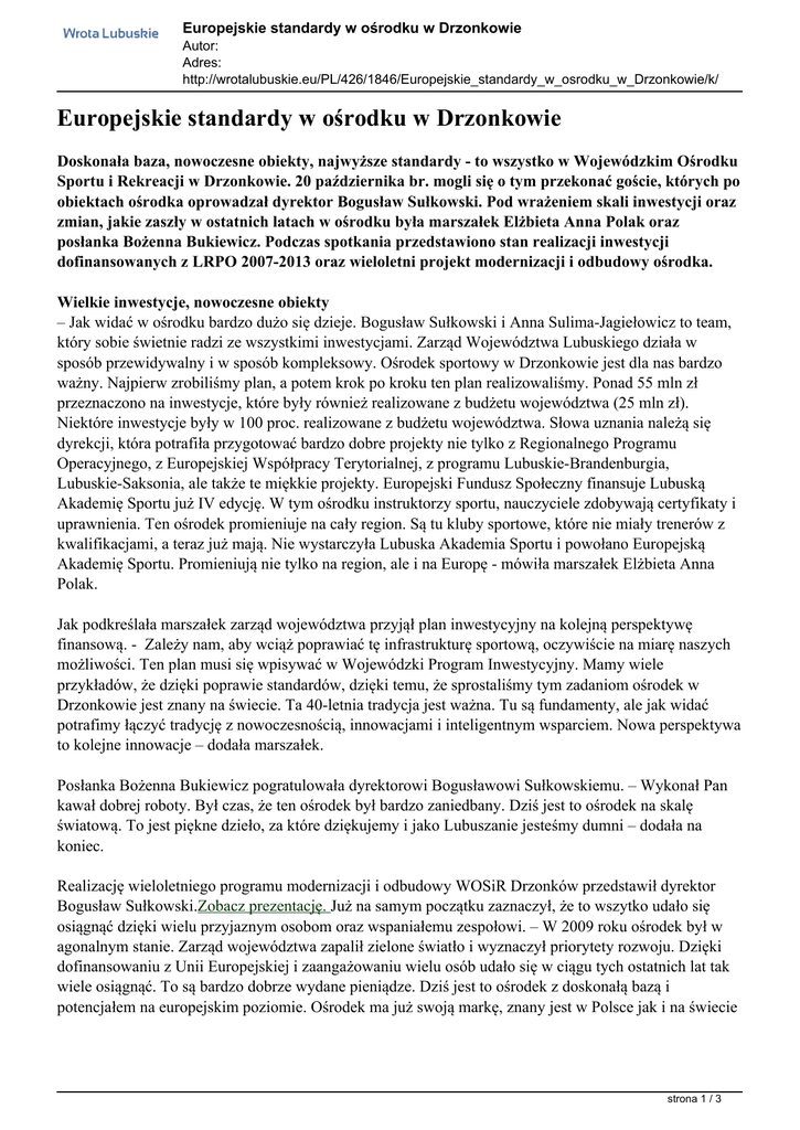 Europejskie standardy w ośrodku w Drzonkowie Autor: Adres: http://wrotalubuskie.eu/PL/426/1846/Europejskie_standardy_w_osrodku_w_Drzonkowie/k/ Europejskie standardy w ośrodku w Drzonkowie Doskonała baza, nowoczesne obiekty, najwyższe standardy - to wszystko w Wojewódzkim Ośrodku Sportu i Rekreacji w Drzonkowie. 20 października br. mogli się o tym przekonać goście, których po obiektach ośrodka oprowadzał dyrektor Bogusław Sułkowski. Pod wrażeniem skali inwestycji oraz zmian, jakie zaszły w ostatnich latach w ośrodku była marszałek Elżbieta Anna Polak oraz posłanka Bożenna Bukiewicz. Podczas spotkania przedstawiono stan realizacji inwestycji dofinansowanych z LRPO 2007-2013 oraz wieloletni projekt modernizacji i odbudowy ośrodka. Wielkie inwestycje, nowoczesne obiekty – Jak widać w ośrodku bardzo dużo się dzieje. Bogusław Sułkowski i Anna Sulima-Jagiełowicz to team, który sobie świetnie radzi ze wszystkimi inwestycjami. Zarząd Województwa Lubuskiego działa w sposób przewidywalny i w sposób kompleksowy. Ośrodek sportowy w Drzonkowie jest dla nas bardzo ważny. Najpierw zrobiliśmy plan, a potem krok po kroku ten plan realizowaliśmy. Ponad 55 mln zł przeznaczono na inwestycje, które były również realizowane z budżetu województwa (25 mln zł). Niektóre inwestycje były w 100 proc. realizowane z budżetu województwa. Słowa uznania należą się dyrekcji, która potrafiła przygotować bardzo dobre projekty nie tylko z Regionalnego Programu Operacyjnego, z Europejskiej Współpracy Terytorialnej, z programu Lubuskie-Brandenburgia, Lubuskie-Saksonia, ale także te miękkie projekty. Europejski Fundusz Społeczny finansuje Lubuską Akademię Sportu już IV edycję. W tym ośrodku instruktorzy sportu, nauczyciele zdobywają certyfikaty i uprawnienia. Ten ośrodek promieniuje na cały region. Są tu kluby sportowe, które nie miały trenerów z kwalifikacjami, a teraz już mają. Nie wystarczyła Lubuska Akademia Sportu i powołano Europejską Akademię Sportu. Promieniują nie tylko na region, ale i na Europę - mówiła marszałek Elżbieta Anna Polak. Jak podkreślała marszałek zarząd województwa przyjął plan inwestycyjny na kolejną perspektywę finansową. - Zależy nam, aby wciąż poprawiać tę infrastrukturę sportową, oczywiście na miarę naszych możliwości. Ten plan musi się wpisywać w Wojewódzki Program Inwestycyjny. Mamy wiele przykładów, że dzięki poprawie standardów, dzięki temu, że sprostaliśmy tym zadaniom ośrodek w Drzonkowie jest znany na świecie. Ta 40-letnia tradycja jest ważna. Tu są fundamenty, ale jak widać potrafimy łączyć tradycję z nowoczesnością, innowacjami i inteligentnym wsparciem. Nowa perspektywa to kolejne innowacje – dodała marszałek. Posłanka Bożenna Bukiewicz pogratulowała dyrektorowi Bogusławowi Sułkowskiemu. – Wykonał Pan kawał dobrej roboty. Był czas, że ten ośrodek był bardzo zaniedbany. Dziś jest to ośrodek na skalę światową. To jest piękne dzieło, za które dziękujemy i jako Lubuszanie jesteśmy dumni – dodała na koniec. Realizację wieloletniego programu modernizacji i odbudowy WOSiR Drzonków przedstawił dyrektor Bogusław Sułkowski.Zobacz prezentację. Już na samym początku zaznaczył, że to wszytko udało się osiągnąć dzięki wielu przyjaznym osobom oraz wspaniałemu zespołowi. – W 2009 roku ośrodek był w agonalnym stanie. Zarząd województwa zapalił zielone światło i wyznaczył priorytety rozwoju. Dzięki dofinansowaniu z Unii Europejskiej i zaangażowaniu wielu osób udało się w ciągu tych ostatnich lat tak wiele osiągnąć. To są bardzo dobrze wydane pieniądze. Dziś jest to ośrodek z doskonałą bazą i potencjałem na europejskim poziomie. Ośrodek ma już swoją markę, znany jest w Polsce jak i na świecie strona 1 / 3 Europejskie standardy w ośrodku w Drzonkowie Autor: Adres: http://wrotalubuskie.eu/PL/426/1846/Europejskie_standardy_w_osrodku_w_Drzonkowie/k/ – mówił dyrektor. - Wszystkie obiekty dostosowane są do potrzeb osób niepełnosprawnych. Pomyśleliśmy również o najmłodszych, dzieci są ważnymi gośćmi w naszych obiektach. Dyrektor omówił inwestycje dofinansowane ze środków Unii Europejskiej. Zwrócił uwagę na projekt pt. „Transgraniczna Akademia Sportu” realizowany w ramach Programu Operacyjnego Współpracy Transgranicznej Polska – Saksonia 2007-2013. Projekt zakłada stworzenie polsko – saksońskiej sieci współpracy jednostek zaangażowanych w tworzenie nowych metod szkolenia w zakresie rehabilitacji, sportu i turystyki. Na koniec dyrektor przypomniał, że w maju zarząd województwa przyjął „Plan Inwestycyjny Wojewódzkiego Ośrodka Sportu i Rekreacji w Drzonkowie na lata 2015-2020”. Zaprosił również gości na jubileusz 40-lecia ośrodka, który obchodzony będzie w czerwcu 2016 r. Modernizacja kompleksu obiektów – etap II i III Etap II zawierał modernizację obiektu budynku zaplecza pływalni z dostosowaniem do potrzeb noclegowych (powstał internat „Olimpijczyk”, 27 pokoi dwuosobowych dostosowanych do osób niepełnosprawnych), budowę basenu – brodzika dla dzieci, montaż ogrodzenia i oświetlenia terenu zespołu pływalni. Całkowita wartość projektu wynosi 6 000 000,00 zł (w tym 1 121 951,00 zł podatek VAT). Dofinansowanie z LRPO wynosi 3 524 144,00 zł (72 % ). Udział własny wynosi 1 353 905,00 zł. i został sfinansowany z budżetu województwa lubuskiego. Inwestycja była realizowana w okresie marzec – wrzesień 2015 r. Wykonawca firma Skanska S.A. Etap III pod nazwą „Remont i modernizacja układu komunikacyjnego w celu umożliwienia dostępu osobom niepełnosprawnym do obiektów Wojewódzkiego Ośrodka Sportu i Rekreacji imienia Zbigniewa Majewskiego w Drzonkowie” zawiera wymianę i modernizację większości ciągów pieszych i jezdnych na terenie Ośrodka z dostosowaniem dla osób niewidomych, likwidację krawężników, wyznac