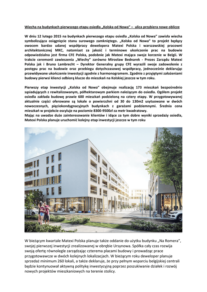 Wiecha na budynkach pierwszego etapu osiedla „Kolska od Nowa” – ulica przybiera nowe oblicze W dniu 12 lutego 2015 na budynkach pierwszego etapu osiedla „Kolska od Nowa” zawisła wiecha symbolizująca osiągnięcie stanu surowego zamkniętego. „Kolska od Nowa” to projekt będący owocem bardzo udanej współpracy dewelopera Matexi Polska i warszawskiej pracowni architektonicznej MKC, natomiast za jakość i terminowe ukończenie prac na budowie odpowiedzialna jest firma CFE Polska, podobnie jak Matexi mająca swoje korzenie w Belgii. W trakcie ceremonii zawieszenia „Wiechy” zarówno Mirosław Bednarek - Prezes Zarządu Matexi Polska jak i Bruno Lambrecht – Dyrektor Generalny grupy CFE wyrazili swoje zadowolenie z postępu prac na budowie oraz przebiegu dotychczasowej współpracy, jednocześnie deklarując przewidywane ukończenie inwestycji zgodnie z harmonogramem. Zgodnie z przyjętymi założeniami budowy pierwsi klienci odbiorą klucze do mieszkań na Kolskiej jeszcze w tym roku. Pierwszy etap inwestycji „Kolska od Nowa” obejmuje realizację 173 mieszkań bezpośrednio sąsiadujących z rewitalizowanym, półhektarowym parkiem należącym do osiedla. Ogółem projekt osiedla zakłada budowę prawie 600 mieszkań podzieloną na cztery etapy. W przygotowywanej aktualnie części oferowane są lokale o powierzchni od 30 do 130m2 usytuowane w dwóch nowoczesnych, pięciokondygnacyjnych budynkach z garażami podziemnymi. Średnia cena mieszkań w projekcie oscyluje na poziomie 8300-9500zł za metr kwadratowy. Mając na uwadze duże zainteresowanie klientów i idące za tym dobre wyniki sprzedaży osiedla, Matexi Polska planuje uruchomić kolejny etap inwestycji jeszcze w tym roku W bieżącym kwartale Matexi Polska planuje także oddanie do użytku budynku „Na Romera”, swojej pierwszej inwestycji zrealizowanej w obrębie Ursynowa. Spółka cały czas rozwija swoją ofertę równolegle zarządzając czterema placami budowy i prowadząc prace przygotowawcze w dwóch kolejnych lokalizacjach. W bieżącym roku deweloper planuje sprzedaż minimum 260 lokali, a także deklaruje, że przy pełnym wsparciu belgijskiej centrali będzie kontynuował aktywną politykę inwestycyjną poprzez poszukiwanie działek i rozwój nowych projektów mieszkaniowych na terenie stolicy. *** Holding Matexi to największa belgijska grupa deweloperska działająca w segmencie mieszkaniowym. Firma będąca rodzinnym przedsięwzięciem posiada blisko siedemdziesięcioletnie doświadczenia na europejskim rynku deweloperskim, portfolio ponad 30 000 zrealizowanych projektów a obrót firmy w 2013 roku to ponad 250mln euro. Grupa Matexi zatrudnia, na co dzień, 300 pracowników i współpracuje z ponad 2000 podwykonawców. Matexi to firma z pełną świadomością swojej społecznej roli, którą wypełnia, realizując trwałe i ekologiczne budynki, odpowiadające współczesnym potrzebom mieszkaniowym, oraz tworząc nowe miejsca pracy. Jednym z podstawowych celów grupy jest dynamiczny, konsekwentny rozwój na rynku polskim realizowany zgodnie z tymi samymi zasadami. Grupa Matexi jest obecna w Polsce od 2011 roku. Firma jest członkiem Polskiego Związku Firm Deweloperskich (PZFD).Polski oddział firmy to dynamiczny zespół ekspertów dysponujący długoletnim doświadczeniem na lokalnym rynku. Strategia Matexi zakłada długofalowe zaangażowanie na polskim rynku, w jego ramach firma planuje szybki, a zarazem zrównoważony rozwój oferty oraz dywersyfikację dostępnych lokalizacji realizowaną zgodnie z dewizą „Witamy w okolicy”. Aktualne portfolio przygotowywanych inwestycji obejmuje przeszło tysiąc mieszkań na terenie Warszawy, natomiast bank zabezpieczonych gruntów pozwala już na realizację kolejnych 350 lokali. Kontakt dla mediów: Marcin Kłosowski, BS Consulting Tel +48 600 890 133, [email protected]