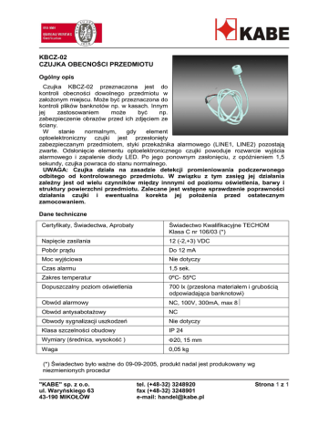 KBCZ-02 CZUJKA OBECNOŚCI PRZEDMIOTU Ogólny opis Czujka KBCZ-02 przeznaczona jest do kontroli obecności dowolnego przedmiotu w załoŜonym miejscu. MoŜe być przeznaczona do kontroli plików banknotów np. w kasach. Innym jej zastosowaniem moŜe być np. zabezpieczenie obrazów przed ich zdjęciem ze ściany. W stanie normalnym, gdy element optoelektroniczny czujki jest przesłonięty zabezpieczanym przedmiotem, styki przekaźnika alarmowego (LINE1, LINE2) pozostają zwarte. Odsłonięcie elementu optoelektronicznego czujki powoduje rozwarcie wyjścia alarmowego i zapalenie diody LED. Po jego ponownym zasłonięciu, z opóźnieniem 1,5 sekundy, czujka powraca do stanu normalnego. UWAGA: Czujka działa na zasadzie detekcji promieniowania podczerwonego odbitego od kontrolowanego przedmiotu. W związku z tym zasięg jej działania zaleŜny jest od wielu czynników między innnymi od poziomu oświetlenia, barwy i struktury powierzchni przedmiotu. Zalecane jest wstępne sprawdzenie poprawności działania czujki i ewentualna korekta jej połoŜenia przed ostatecznym zamocowaniem. Dane techniczne Certyfikaty, Świadectwa, Aprobaty Świadectwo Kwalifikacyjne TECHOM Klasa C nr 106/03 (*) Napięcie zasilania 12 (-2,+3) VDC Pobór prądu Do 12 mA Moc wyjściowa Nie dotyczy Czas alarmu 1,5 sek. Zakres temperatur 0ºC- 55ºC Dopuszczalny poziom oświetlenia 700 lx (przesłona materiałem i grubością odpowiadająca banknotowi) Obwód alarmowy NC, 100V, 300mA, max 8Ω Obwód antysabotaŜowy NC Obwody sygnalizacji uszkodzeń Nie dotyczy Klasa szczelności obudowy IP 24 Wymiary (średnica, wysokość ) Φ20, 15 mm Waga 0,05 kg (*) Świadectwo było waŜne do 09-09-2005, produkt nadal jest produkowany wg niezmienionych procedur "KABE" sp. z o.o. ul. Waryńskiego 63 43-190 MIKOŁÓW tel. (+48-32) 3248920 fax (+48-32) 3248901 e-mail: [email protected] Strona 1 z 1