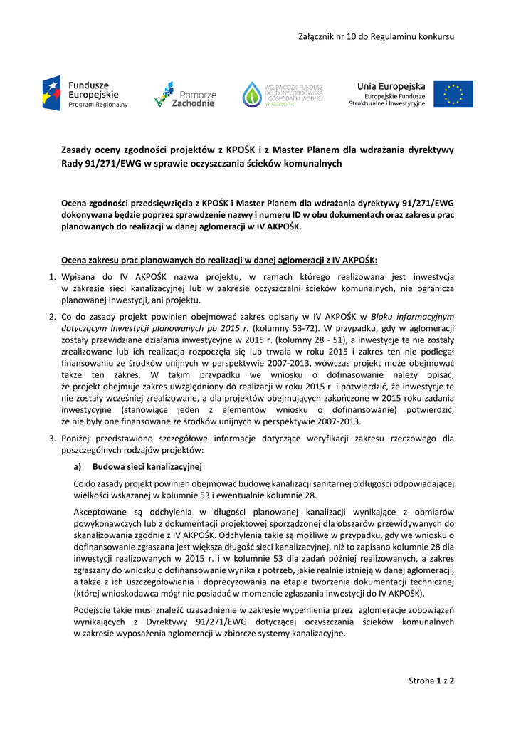 Załącznik nr 10 do Regulaminu konkursu Zasady oceny zgodności projektów z KPOŚK i z Master Planem dla wdrażania dyrektywy Rady 91/271/EWG w sprawie oczyszczania ścieków komunalnych Ocena zgodności przedsięwzięcia z KPOŚK i Master Planem dla wdrażania dyrektywy 91/271/EWG dokonywana będzie poprzez sprawdzenie nazwy i numeru ID w obu dokumentach oraz zakresu prac planowanych do realizacji w danej aglomeracji w IV AKPOŚK. Ocena zakresu prac planowanych do realizacji w danej aglomeracji z IV AKPOŚK: 1. Wpisana do IV AKPOŚK nazwa projektu, w ramach którego realizowana jest inwestycja w zakresie sieci kanalizacyjnej lub w zakresie oczyszczalni ścieków komunalnych, nie ogranicza planowanej inwestycji, ani projektu. 2. Co do zasady projekt powinien obejmować zakres opisany w IV AKPOŚK w Bloku informacyjnym dotyczącym Inwestycji planowanych po 2015 r. (kolumny 53-72). W przypadku, gdy w aglomeracji zostały przewidziane działania inwestycyjne w 2015 r. (kolumny 28 - 51), a inwestycje te nie zostały zrealizowane lub ich realizacja rozpoczęła się lub trwała w roku 2015 i zakres ten nie podlegał finansowaniu ze środków unijnych w perspektywie 2007-2013, wówczas projekt może obejmować także ten zakres. W takim przypadku we wniosku o dofinasowanie należy opisać, że projekt obejmuje zakres uwzględniony do realizacji w roku 2015 r. i potwierdzić, że inwestycje te nie zostały wcześniej zrealizowane, a dla projektów obejmujących zakończone w 2015 roku zadania inwestycyjne (stanowiące jeden z elementów wniosku o dofinansowanie) potwierdzić, że nie były one finansowane ze środków unijnych w perspektywie 2007-2013. 3. Poniżej przedstawiono szczegółowe informacje dotyczące weryfikacji zakresu rzeczowego dla poszczególnych rodzajów projektów: a) Budowa sieci kanalizacyjnej Co do zasady projekt powinien obejmować budowę kanalizacji sanitarnej o długości odpowiadającej wielkości wskazanej w kolumnie 53 i ewentualnie kolumnie 28. Akceptowane są odchylenia w długości planowanej kanalizacji wynikające z obmiarów powykonawczych lub z dokumentacji projektowej sporządzonej dla obszarów przewidywanych do skanalizowania zgodnie z IV AKPOŚK. Odchylenia takie są możliwe w przypadku, gdy we wniosku o dofinansowanie zgłaszana jest większa długość sieci kanalizacyjnej, niż to zapisano kolumnie 28 dla inwestycji realizowanych w 2015 r. i w kolumnie 53 dla zadań później realizowanych, a zakres zgłaszany do wniosku o dofinansowanie wynika z potrzeb, jakie realnie istnieją w danej aglomeracji, a także z ich uszczegółowienia i doprecyzowania na etapie tworzenia dokumentacji technicznej (której wnioskodawca mógł nie posiadać w momencie zgłaszania inwestycji do IV AKPOŚK). Podejście takie musi znaleźć uzasadnienie w zakresie wypełnienia przez aglomeracje zobowiązań wynikających z Dyrektywy 91/271/EWG dotyczącej oczyszczania ścieków komunalnych w zakresie wyposażenia aglomeracji w zbiorcze systemy kanalizacyjne. Strona 1 z 2 b) Modernizacja sieci kanalizacyjnej Długość sieci kanalizacyjnej podlegającej modernizacji (wyrażona w km) powinna być nie większa niż podana w IV AKPOŚK. Dopuszcza się zwiększenie długości sieci modernizowanej jedynie w przypadku, gdy wynika ono z obmiarów powykonawczych po zakończeniu realizacji inwestycji objętej IV AKPOŚK. c) Inwestycje dotyczące oczyszczalni ścieków Jeżeli w IV AKPOŚK nie umieszczono żadnych informacji na temat planowanych działań inwestycyjnych na oczyszczalni ścieków w aglomeracji kwalifikującej się do RPO (informacje zawarte w jednej z kolumn nr 61, 66, 69, 70, 71 lub ew. kolumna 36, 37, 48, 49, 50) wówczas inwestycje związane z oczyszczalnią ścieków nie wynikające z IV AKPOŚK a wskazane we wniosku o dofinansowanie, nie mogą być przedmiotem dofinansowania w ramach RPO 2014-2020. Jeżeli w IV AKPOŚK wskazano, że na oczyszczalni ścieków będą realizowane tylko inwestycje dotyczące modernizacji części osadowej, a we wniosku o dofinansowanie przedstawiono zakres prac wykraczający poza gospodarkę osadową, to inwestycja może zostać uznana za kwalifikowalną. Zasadnym jest bowiem, aby wnioskodawca w ramach jednego postępowania wykonał wszystkie niezbędne prace na terenie całej oczyszczalni. Ostateczna decyzja co do możliwości dofinansowania wnioskowanego zakresu, w każdym przypadku będzie podjęta przez IOK dopiero po weryfikacji zasadności realizacji proponowanego zakresu i spełnieniu pozostałych kryteriów wyboru projektów oraz zapisów regulaminu konkursu.