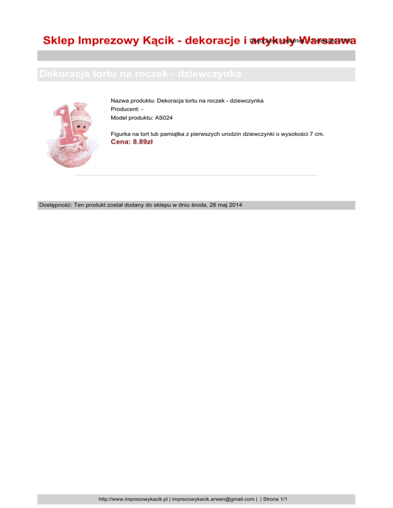 czwartek, 11 sierpień 2016 Sklep Imprezowy Kącik - dekoracje i Utworzono: artykuły Warszawa Dekoracja tortu na roczek - dziewczynka Nazwa produktu: Dekoracja tortu na roczek - dziewczynka Producent: Model produktu: AS024 Figurka na tort lub pamiątka z pierwszych urodzin dziewczynki o wysokości 7 cm. Cena: 8.89zł Dostępność: Ten produkt został dodany do sklepu w dniu środa, 28 maj 2014 http://www.imprezowykacik.pl | [email protected] | | Strona 1/1
