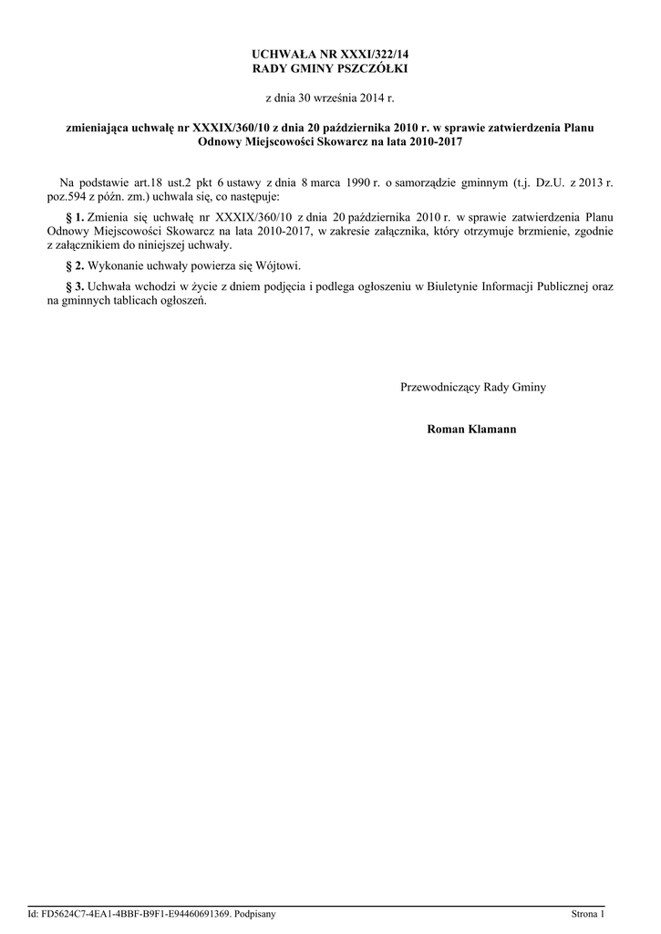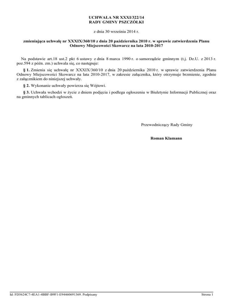 UCHWAŁA NR XXXI/322/14 RADY GMINY PSZCZÓŁKI z dnia 30 września 2014 r. zmieniająca uchwałę nr XXXIX/360/10 z dnia 20 października 2010 r. w sprawie zatwierdzenia Planu Odnowy Miejscowości Skowarcz na lata 2010-2017 Na podstawie art.18 ust.2 pkt 6 ustawy z dnia 8 marca 1990 r. o samorządzie gminnym (t.j. Dz.U. z 2013 r. poz.594 z późn. zm.) uchwala się, co następuje: § 1. Zmienia się uchwałę nr XXXIX/360/10 z dnia 20 października 2010 r. w sprawie zatwierdzenia Planu Odnowy Miejscowości Skowarcz na lata 2010-2017, w zakresie załącznika, który otrzymuje brzmienie, zgodnie z załącznikiem do niniejszej uchwały. § 2. Wykonanie uchwały powierza się Wójtowi. § 3. Uchwała wchodzi w życie z dniem podjęcia i podlega ogłoszeniu w Biuletynie Informacji Publicznej oraz na gminnych tablicach ogłoszeń. Przewodniczący Rady Gminy Roman Klamann Id: FD5624C7-4EA1-4BBF-B9F1-E94460691369. Podpisany Strona 1 Załącznik do uchwały nr XXXI/322/14 Rady Gminy Pszczółki z dnia 30 września 2014 r. Plan Odnowy Miejscowości Skowarcz na lata 2010 – 2017 Skowarcz, lipiec 2010 r. Aktualizacja: wrzesień 2014 r. 1 Id: FD5624C7-4EA1-4BBF-B9F1-E94460691369. Podpisany Strona 1 Metodologia Pierwotny Plan Odnowy Miejscowości Skowarcz na lata 2010 – 2017 został opracowany przez mieszkańców Skowarcza, którzy podczas spotkań dokonali inwentaryzacji zasobów miejscowości, zidentyfikowali występujące tu problemy i potrzeby, a także zaproponowali rozwiązania, które wpłynęłyby na odnowę i rozwój miejscowości. Aktualizacja POM została dokonana przez pracowników Urzędu Gminy w Pszczółkach, przy udziale mieszkańców. 2 Id: FD5624C7-4EA1-4BBF-B9F1-E94460691369. Podpisany Strona 2 Nasza miejscowość dziś Miejscowość Skowarcz leży w sercu Gminy Pszczółki. Bardzo dobrą komunikację zapewniają jej położenie przy drodze krajowej nr 91 oraz przy linii kolejowej (przystanek osobowy). Miejscowość prężnie się rozwija. Liczba jej mieszkańców wynosi 1209 osób (wg ewidencji ludności, stan na dzień 31.12.2013 r.). W ciągu ostatnich kilku lat zrealizowane zostały tu liczne inwestycje, które znacznie wpłynęły na poprawę atrakcyjności Skowarcza. Zagospodarowany został skwer w centrum wsi, powstał plac zabaw wraz boiskiem do koszykówki. Wyremontowana została również świetlica wiejska z dużą salą bankietową, zapleczem kuchennym oraz kawiarenką internetową. Ponadto w 2006 r. w Skowarczu zakończona została niezwykle ważna inwestycja dotycząca budowy kanalizacji sanitarnej. Ze względu na bliskość Trójmiasta, bardzo dobre warunki komunikacyjne oraz zasób terenów budowlanych, wieś stanowi atrakcyjną lokalizację dla inwestycji, jak i budownictwa indywidualnego. 3 Id: FD5624C7-4EA1-4BBF-B9F1-E94460691369. Podpisany Strona 3 Inwentaryzacja zasobów miejscowości: Ciekawi/ ważni mieszkańcy: Krzysztof Gębka – rzeźbiarz Edward Edut – wytwórca białej broni Monika Ambros-Zezula – historyk, opracowała monografię wsi Grupy mieszkańców/organizacje: Koło Gospodyń Wiejskich Rada Sołecka Tereny zielone: skwer w centrum wsi stawy i teren rekreacyjny dostępny dla mieszkańców (teren prywatny) Świetlice wiejskie: świetlica wiejska Place rekreacyjno-sportowe: plac zabaw i boisko na terenie przyszkolny plac rekreacyjny przy ul. Żuławskiej teren przygotowany pod plac rekreacyjno-sportowy Kapliczki/krzyże itd.: kapliczka przy ul. Łąkowej 3 krzyże Figura Najświętszej Marii Panny na ul. Spacerowej wraz z tablicą upamiętniającą śmierć Jana Pawła II Sklepy: 3 sklepy spożywczo-przemysłowe Atrakcje: zajęcia dla dzieci w świetlicy, szkole, itd. ćwiczenia fitness w świetlicy zajęcia biblioteczne kuligi spotkania koła gospodyń wiejskich Lokalne tradycje: opłatek wiejski wspólne malowanie pisanek dożynki 4 Id: FD5624C7-4EA1-4BBF-B9F1-E94460691369. Podpisany Strona 4 nabożeństwa majowe przy figurce NMP Lokalne imprezy: dzień kobiet dzień matki dzień dziecka festyn rodzinny dzień ziemniaka dożynki walentynki zabawy: andrzejkowa, sylwestrowa, karnawałowa Inne ważne zasoby: szkoła podstawowa torfowiska stawy hodowlane miejsce pamięci związane z istnieniem podobozu Stutthoff 5 Id: FD5624C7-4EA1-4BBF-B9F1-E94460691369. Podpisany Strona 5 Mocne strony naszej miejscowości: liczne inicjatywy społeczne kultywowanie nowych zwyczajów współpraca mieszkańców ze szkołą liczne zajęcia dla dzieci i młodzieży bogata historia (najstarsza wieś w gminie, liczne wykopaliska archeologiczne) aktywna Rada Rodziców przy szkole istniejące Muzeum Miodu dobre położenie (blisko aglomeracji trójmiejskiej) dobra komunikacja kanalizacja i sieć gazowa na terenie wsi przygotowany plan zagospodarowania przestrzennego nowo wyremontowana świetlica wiejska prężnie działające Koło Gospodyń Wiejskich, Rada Sołecka i aktywni Radni Słabe strony naszej miejscowości: zły stan dróg i brak chodników duży ruch samochodowy na drodze krajowej nr 91 brak terenów zielonych mało miejsc sportowo-rekreacyjnych mało przedsiębiorstw 6 Id: FD5624C7-4EA1-4BBF-B9F1-E94460691369. Podpisany Strona 6 Wizja rozwoju miejscowości: Mieszkamy w pięknej miejscowości Skowarcz, dumni ze wspólnej pracy i zaangażowania oraz zadbanego, reprezentacyjnego centrum wsi. A na obrzeżach miejscowości powstały osiedla domów jednorodzinnych. Posiadamy dobrze wyposażoną świetlicę wiejską, skwer z fontanną i plac rekreacyjno-sportowy. Organizujemy wiele różnorodnych imprez integracyjnych i zajęć, skierowanych do mieszkańców w każdym wieku. Co zrobimy, aby taka się stała: pozyskiwać dotacje, m.in. ze środków Unii Europejskiej brać udział w różnorodnych konkursach podejmować różne inicjatywy społeczne dbać o integrację mieszkańców pogłębiać współpracę Rady Sołeckiej z grupami mieszkańców, organizacjami i przedsiębiorcami organizować imprezy lokalne, np. Święto Pieczonego Ziemniaka, Biesiada w Skowarczu