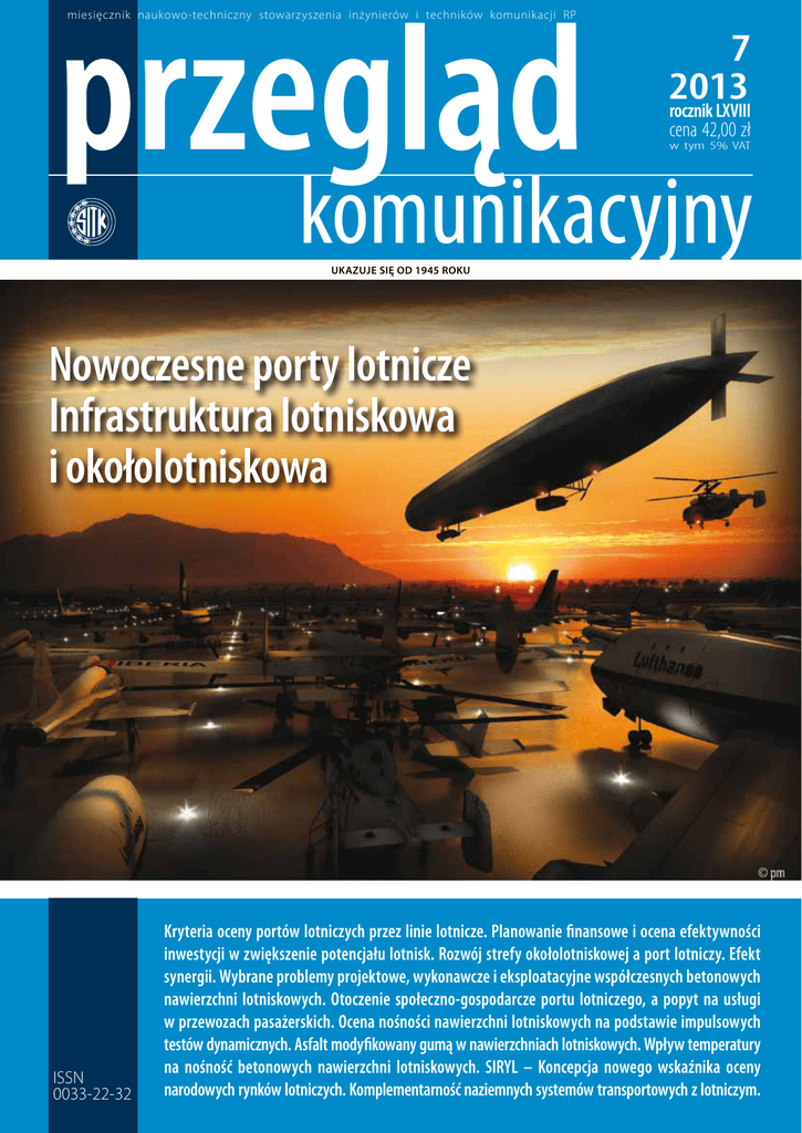 przegląd miesięcznik naukowo-techniczny stowarzyszenia inżynierów i techników komunikacji RP 7 2013 rocznik LXVIII cena 42,00 zł w tym 5% VAT komunikacyjny UKAZUJE SIĘ OD 1945 ROKU Nowoczesne porty lotnicze Infrastruktura lotniskowa i okołolotniskowa ISSN 0033-22-32 Kryteria oceny portów lotniczych przez linie lotnicze. Planowanie finansowe i ocena efektywności inwestycji w zwiększenie potencjału lotnisk. Rozwój strefy okołolotniskowej a port lotniczy. Efekt synergii. Wybrane problemy projektowe, wykonawcze i eksploatacyjne współczesnych betonowych nawierzchni lotniskowych. Otoczenie społeczno-gospodarcze portu lotniczego, a popyt na usługi w przewozach pasażerskich. Ocena nośności nawierzchni lotniskowych na podstawie impulsowych testów dynamicznych. Asfalt modyfikowany gumą w nawierzchniach lotniskowych. Wpływ temperatury na nośność betonowych nawierzchni lotniskowych. SIRYL – Koncepcja nowego wskaźnika oceny narodowych rynków lotniczych. Komplementarność naziemnych systemów transportowych z lotniczym. Podstawowe informacje dla Autorów artykułów „Przegląd Komunikacyjny” publikuje artykuły związane z szeroko rozumianym transportem oraz infrastrukturą transportu. Obejmuje to zagadnienia techniczne, ekonomiczne i prawne. Akceptowane są także materiały związane z geografią, historią i socjologią transportu. Artykuły publikowane w „Przeglądzie Komunikacyjnym” dzielimy na: „wnoszące wkład naukowy w dziedzinę transportu i infrastruktury transportu” i „pozostałe”. Prosimy Autorów o deklarację, do której grupy zaliczyć ich prace. Materiały do publikacji należy przesyłać w formie elektronicznej na adres redakcji: [email protected] Pierwszym krokiem jest przesłanie ZGŁOSZENIA PUBLIKACJI (do pobrania ze strony: przeglad.komunikacyjny.pwr.wroc.pl). W zgłoszeniu należy podać: imię i nazwisko autora, adres mailowy oraz adres do tradycyjnej korespondencji, miejsce zatrudnienia, zdjęcie (w przypadku większej liczby autorów konieczne są dane o wszystkich osobach oraz wskazanie autora korespondencyjnego), tytuł artykułu oraz streszczenie i słowa kluczowe (te informacje także w języku angielskim). Konieczna jest także deklaracja, czy artykuł ma być zaliczony do grupy „wnoszących wkład naukowy...”, czy „pozostałe”. Artykuły mogą być napisane w języku angielskim. Możliwe jest przesłanie od razu całego artykułu (zgłoszenie + artykuł + oświadczenie Autora, opracowanych według zasad jak niżej). Na podstawie ZGŁOSZENIA PUBLIKACJI Kolegium Redakcyjne podejmuje decyzję odnośnie zaproszenia Autora do nadesłania artykułu lub sugeruje przesłanie do innego czasopisma. W celu usprawnienia i przyspieszenia procesu publikacji prosimy o zastosowanie się do poniższych wymagań dotyczących nadsyłanego materiału: 1. Tekst artykułu powinien być napisany w jednym z ogólnodostępnych programów (na przykład Microsoft Word). Wzory i opisy wzorów powinny być wkomponowane w tekst. Tabele należy zestawić po zakończeniu tekstu. Ilustracje (rysunki, fotografie, wykresy) najlepiej dołączyć jako oddzielne pliki. Można je także wstawić do pliku z tekstem. Możliwe jest oznaczenie miejsc w tekście, w których autor sugeruje wstawienie stosownej ilustracji lub tabeli. Obowiązuje odrębna numeracja ilustracji (bez rozróżniania na rysunki, fotografie itp.) oraz tabel. 2. Całość materiału nie powinna przekraczać 12 stron w formacie Word (zalecane jest 8 stron). Do limitu stron wlicza się ilustracje załączane w odrębnych plikach (przy założeniu że 1 ilustracja = ½ strony). 3. Format tekstu powinien być jak najprostszy (nie stosować zróżnicowanych styli, justowania, dzielenia wyrazów, podwójnych i wielokrotnych spacji itp.). Dopuszczalne jest pogrubienie, podkreślenie i oznaczenie kursywą istotnych części tekstu, a także indeksy górne i dolne. Nie stosować przypisów. 4. Nawiązania do pozycji zewnętrznych - cytaty (dotyczy również podpisów ilustracji i tabel) oznacza się numeracją w nawiasach kwadratowych [...]. Numeracja odpowiada zestawieniu na końcu artykułu (oznaczonego jako „Materiały źródłowe”). Zestawienie powinno być ułożone alfabetycznie. Nie należy zamieszczać informacji o materiałach źródłowych w przypisach. 5. Jeżeli Autor wykorzystuje materiały objęte nie swoim prawem autorskim, powinien uzyskać pisemną zgodę właściciela tych praw do publikacji (niezależnie od podania źródła). Kopie takiej zgody należy przesłać Redakcji. Po akceptacji ZGŁOSZENIA PUBLIKACJI należy dosłać: artykuł (bez danych identyfikujących autora) z materiałami dodatkowymi, takimi jak tabele, ilustracje (wkomponowane w tekst lub w oddzielnych plikach) oraz „Oświadczenie Autora korespondencyjnego”. Do przygotowania załączników można wykorzystać pliki (do pobrania ze strony: przeglad.komunikacyjny.pwr.wroc.pl): • „Wzór artykułu” – plik edytora Word, który może być podstawą formatowania własnego artykułu; • „Oświadczenie Autora korespondencyjnego”. Dodatkowo można skorzystać z następujących plików: • "Przyład zgłoszenia artykułu" i „Przykładowy artykuł w wersji nadesłanej przez Autora” – prosimy o przygotowanie własnego materiału w zbliżonej formie; • „Przykładowy artykuł w wersji publikowanej w Przeglądzie Komunikacyjnym” – jest to ta sama pozycja jak w pliku wyżej, z tym że już po składzie i druku, prosimy o porównanie obu wersji. Uwaga! Duże rozbieżności pomiędzy nadesłanym materiałem, a powyższymi wymaganiami spowodują odesłanie całości do autorów z prośbą o autokorektę. W przypadku pytań prosimy o kontakt: [email protected] Artykuły wnoszące wkład naukowy podlegają rozbudowanym procedurom recenzji merytorycznych zgodnie z wytycznymi MNiSW, co pozwala zaliczyć je, po opublikowaniu, do dorobku naukowego (z punktacją przyznawaną w toku oceny czasopism
