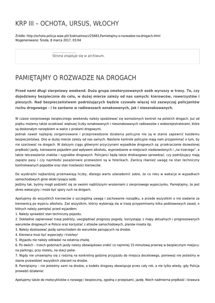 KRP III – OCHOTA, URSUS, WŁOCHY Źródło: http://ochota.policja.waw.pl/r3/aktualnosci/25683,Pamietajmy-o-rozwadze-na-drogach.html Wygenerowano: Środa, 8 marca 2017, 03:04 Strona znajduje się w archiwum. PAMIĘTAJMY O ROZWADZE NA DROGACH Przed nami długi sierpniowy weekend. Duża grupa zmotoryzowanych osób wyruszy w trasy. To, czy dojedziemy bezpiecznie do celu, w dużej mierze zależy od nas samych: kierowców, rowerzystów i pieszych. Nad bezpieczeństwem podróżujących będzie czuwało więcej niż zazwyczaj policjantów ruchu drogowego - i to zarówno w radiowozach oznakowanych, jak i nieoznakowanych. W czasie sierpniowego świątecznego weekendu należy spodziewać się wzmożonych kontroli na polskich drogach. Już od piątku możemy także oczekiwać większej liczby oznakowanych i nieoznakowanych radiowozów z wideorejestratorami, które są doskonałym narzędziem w walce z piratami drogowymi. Jednak nawet najlepiej zorganizowane i przeprowadzone działania policyjne nie są w stanie zapewnić każdemu bezpieczeństwa. Ono w dużej mierze zależy od nas samych. Nasilone kontrole policyjne mają nam przypominać o tym, by nie szarżować na drogach. W dalszym ciągu głównymi przyczynami wypadków drogowych są: przekraczanie dozwolonej prędkości jazdy, kierowanie pojazdem pod wpływem alkoholu, wyprzedzanie w miejscach niedozwolonych i „na trzeciego”, a także lekceważenie znaków i sygnałów drogowych. Policjanci będą także drobiazgowo sprawdzać, czy podróżujący mają zapięte pasy i czy najmłodsi pasażerowie przewożeni są w fotelikach. Zwrócą również uwagę na stan techniczny kontrolowanych pojazdów oraz stan trzeźwości kierowców. Do wyobraźni najbardziej przemawiają liczby, dlatego warto uświadomić sobie, że co roku w wakacje w wypadkach samochodowych ginie około tysiąca osób. Jedźmy tak, byśmy mogli podzielić się ze swoimi najbliższymi wrażeniami z sierpniowego wypoczynku. Pamiętajmy, że jest okres wakacyjny i może być spory ruch na drogach. Apelujemy do wszystkich kierowców o szczególną uwagę i zachowanie rozsądku, a przede wszystkim o nie siadanie za kierownicą po wypiciu alkoholu. Zaś wszystkim, którzy wybierają się w trasę przypominamy kilka podstawowych zasad, o których należy pamiętać przed wyjazdem: 1. Należy sprawdzić stan techniczny pojazdu. 2. Dokładnie zaplanować trasę podróży, uwzględniać prognozy pogody, korzystając z mapy aktualnych i prognozowanych warunków drogowych w Polsce oraz korzystać z atlasów samochodowych, planów miasta itp. 3. Należy dostosować jazdę samochodem do warunków panujących na drodze. 4. Kierowca musi być wypoczęty i trzeźwy! 5. Wyjazdu nie należy odkładać na ostatnią chwilę. 6. Po dwóch – trzech godzinach jazdy należy obowiązkowo zrobić co najmniej 15-minutową przerwę w bezpiecznym miejscu: na parkingu, przy motelu, na stacji paliw. 7. Nigdy nie umawiajmy się z rodziną na konkretną godzinę przyjazdu do miejsca docelowego, ponieważ nie jesteśmy w stanie przewidzieć wszystkich zdarzeń na drodze. 8. Pamiętajmy – nie jesteśmy sami na drodze, a kodeks drogowy obowiązuje przez cały rok, a nie tylko wtedy, gdy Policja prowadzi działania! Apelujemy także do motocyklistów o rozwagę i bezpieczną, zgodną z przepisami, jazdę. Niech nadmierna prędkość i brawura nie staną się przyczyną kolejnej tragedii. opr. KGP Ocena: 0/5 (0) Tweetnij