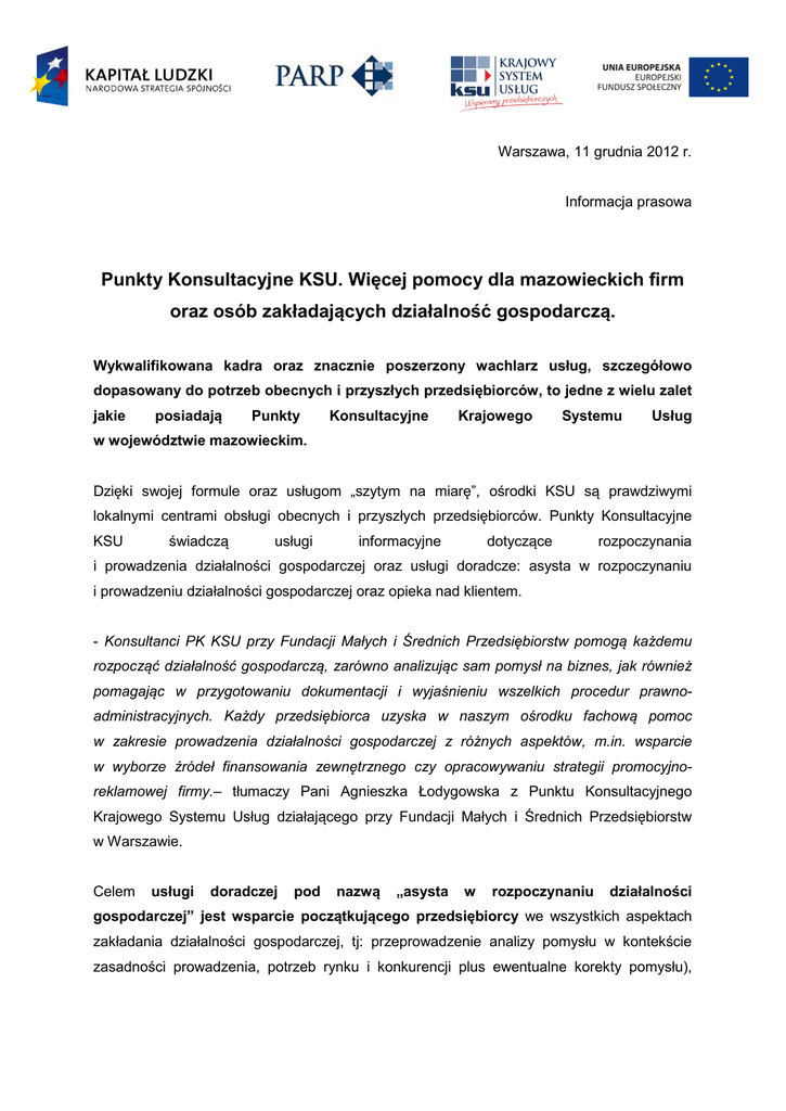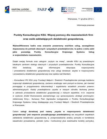 Warszawa, 11 grudnia 2012 r. Informacja prasowa Punkty Konsultacyjne KSU. Więcej pomocy dla mazowieckich firm oraz osób zakładających działalność gospodarczą. Wykwalifikowana kadra oraz znacznie poszerzony wachlarz usług, szczegółowo dopasowany do potrzeb obecnych i przyszłych przedsiębiorców, to jedne z wielu zalet jakie posiadają Punkty Konsultacyjne Krajowego Systemu Usług w województwie mazowieckim. Dzięki swojej formule oraz usługom „szytym na miarę”, ośrodki KSU są prawdziwymi lokalnymi centrami obsługi obecnych i przyszłych przedsiębiorców. Punkty Konsultacyjne KSU świadczą usługi informacyjne dotyczące rozpoczynania i prowadzenia działalności gospodarczej oraz usługi doradcze: asysta w rozpoczynaniu i prowadzeniu działalności gospodarczej oraz opieka nad klientem. - Konsultanci PK KSU przy Fundacji Małych i Średnich Przedsiębiorstw pomogą każdemu rozpocząć działalność gospodarczą, zarówno analizując sam pomysł na biznes, jak również pomagając w przygotowaniu dokumentacji i wyjaśnieniu wszelkich procedur prawnoadministracyjnych. Każdy przedsiębiorca uzyska w naszym ośrodku fachową pomoc w zakresie prowadzenia działalności gospodarczej z różnych aspektów, m.in. wsparcie w wyborze źródeł finansowania zewnętrznego czy opracowywaniu strategii promocyjnoreklamowej firmy.– tłumaczy Pani Agnieszka Łodygowska z Punktu Konsultacyjnego Krajowego Systemu Usług działającego przy Fundacji Małych i Średnich Przedsiębiorstw w Warszawie. Celem usługi doradczej pod nazwą „asysta w rozpoczynaniu działalności gospodarczej” jest wsparcie początkującego przedsiębiorcy we wszystkich aspektach zakładania działalności gospodarczej, tj: przeprowadzenie analizy pomysłu w kontekście zasadności prowadzenia, potrzeb rynku i konkurencji plus ewentualne korekty pomysłu), pomocy w przygotowaniu biznesplanu przedsięwzięcia i dokumentów niezbędnych do jego rejestracji.. Druga usługa doradcza, skierowana do już działających przedsiębiorców to asysta w prowadzeniu działalności gospodarczej. Obejmuje ona doradztwo w 4 podstawowych obszarach działalności firmy tj.: formalno-prawne obowiązki związane z prowadzeniem firmy, marketing, organizacja oraz finansowanie przedsiębiorstwa. I w końcu usługa informacyjna „opieka nad klientem”, obejmująca pomoc przedsiębiorcy w znalezieniu partnera odpowiadającego specjalistycznym potrzebom przedsiębiorcy tj.: usługi doradcze, szkoleniowe czy finansowe. Zadaniem PK KSU jest również pomoc w zaaranżowaniu spotkania z usługodawcą specjalistycznym, oraz dalszy monitoring losów klienta w procesie korzystania z tej usługi. - Usługi świadczone są przede wszystkim w formie indywidualnych spotkań z klientem w siedzibie ośrodka, w tym przypadku Fundacji MSP, jak również drogą telefoniczną oraz drogą elektroniczną. Ponadto każdy ośrodek z mazowieckiej sieci PK KSU prowadzi dyżury w mniejszych miejscowościach – Fundacja MSP w Kobyłce, Sulejówku, Wołominie i Grodzisku Mazowieckim. Jesteśmy przekonani, że profesjonalizm naszych konsultantów oraz zrozumienie potrzeb przedsiębiorców zostaną docenione przez naszych klientów – zachęca Pani Agnieszka Łodygowska. Usługi informacyjne świadczone przez PK KSU są bezpłatne. Z kolei usługi doradcze są dofinansowane aż w 90% ze środków Unii Europejskiej oraz budżetu państwa. Obecnie Punkty Konsultacyjne KSU w województwie mazowieckim prowadzą: Fundacja Małych i Średnich Przedsiębiorstw, ul. Smocza 27, Warszawa Akademickie Inkubatory Przedsiębiorczości, ul. Piękna 68, Warszawa Fundacja Gospodarcza im. Karola Marcinkowskiego, ul. Małgorzacka 8, Ciechanów Stowarzyszenie Rozwoju Aktywności Społecznej „Triada”, ul. Andriollego 8/1, Otwock Stowarzyszenie Rozwoju Aktywności Społecznej „Triada”, ul. Pułaskiego 23, Siedlce Zachęcamy również do skorzystania z infolinii pod numerem: 022 432 89 91 do 93; 0 801 33 22 02 Bądź do wysłania maila: [email protected] .