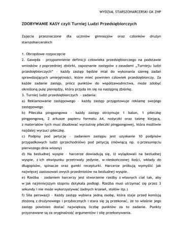 WYDZIAŁ STARSZOHARCERSKI GK ZHP ZDOBYWANIE KASY czyli Turniej Ludzi Przedsiębiorczych Zajęcia przeznaczone dla uczniów gimnazjów oraz członków drużyn starszoharcerskich 1. Obrzędowe rozpoczęcie 2. Gawęda – przypomnienie definicji człowieka przedsiębiorczego na podstawie wniosków z poprzedniej zbiórki, zapoznanie zastępów z zasadami „Turnieju ludzi przedsiębiorczych” – każdy zastęp będzie miał do wykonania szereg zadań sprawdzających umiejętności, które mieć powinien człowiek przedsiębiorczy. Za każde zadanie zastęp, prócz punktów do współzawodnictwa, może zdobyć określoną pulę pieniędzy, która przyda im się na następną zbiórkę. 3. Turniej ludzi przedsiębiorczych - zadania: a) Reklamowanie zastępowego – każdy zastęp przygotowuje reklamę swojego zastępowego b) Piłeczka pingpongowa – każdy zastęp otrzymuje 1 balon, 1 piłeczkę pingpongową, 2 arkusze papieru formatu A4, nożyczki oraz taśmę klejącą. z materiałów tych musi zbudować wyrzutnię piłeczki pingpongowej, która możliwie najdalej wyrzuci piłeczkę. c) Podpisy pod petycję – zadaniem zastępu jest uzyskanie 10 podpisów przypadkowych ludzi (przechodniów) pod petycją (mówiącą np. o przesunięciu pierwszego dnia wiosny) d) Na bezludnej wyspie – harcerze dowiadują się, iż wylądowali na bezludnej wyspie, z ich ekwipunku przetrwały jedynie, w nieskończonej ilości, wkłady do długopisów, spinacze oraz gumki recepturki. Harcerze próbują wymyślić jak najwięcej zastosowań owych przedmiotów na bezludnej wyspie. e) Rzeźba – zadaniem harcerzy jest stworzenie rzeźby z własnych ciał tak, aby w jak najmniejszym stopniu dotykała podłogi. Rzeźba musi utrzymać się przez 3 sekundy i nie może wykorzystywać żadnych krzeseł, stołów itp.) f) Siła perswazji - Każdy zastęp wybiera jedną osobę, która staje przed komisją złożoną z drużynowego i przybocznych i stara się ją przekonać, że to właśnie jego zastęp powinien dostać największą liczbę punktów za to zadanie. Punkty przyznawane są za oryginalność argumentów i siłę przekonywania. WYDZIAŁ STARSZOHARCERSKI GK ZHP g) Akcje zarobkowe – każdy zastęp stara się wymyślić jak najwięcej realnych sposobów zarobienia pieniędzy przez drużynę. h) Wieża z papieru – zadaniem zastępów jest zbudowanie jak największej wieży z papieru. Mają do dyspozycji papier A4 oraz taśmę klejącą. i) Dopasowywanie cen do produktów – zastęp otrzymuje spis 10 produktów codziennego użytku; jego zadaniem jest wypisanie potencjalnych cen – im bliżej prawdy, tym więcej punktów 4. Nauka piosenki „W dal, w dal” 5. Podsumowanie turnieju – przyznanie punktów i „pieniędzy 6. Podsumowanie zbiórki 7. Obrzędowe zakończenie UWAGA: Jeżeli pogoda na to pozwala powyższą zbiórkę można z powodzeniem przeprowadzić w formie gry terenowej. Załączniki: Lista przykładowych produktów do zadania „Dopasowywanie cen” 1 litr mleka paczka kredek ołówkowych – 12 kolorów 1 kg mąki chleb 1 kg jabłek słoik dżemu ryza papieru ksero A4 1,5 litra wody mineralnej 1 kg ziemniaków paczka zapałek Wzór petycji do zbierania podpisów PETYCJA o przesunięcie pierwszego dnia wiosny!!! WYDZIAŁ STARSZOHARCERSKI GK ZHP Podpisy: L.p. 1. 2. 3. 4. 5. 6. 7. 8. 9. 10. Podpis