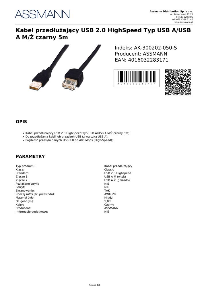Karta produktu: Kabel przedłużający USB 2.0 HighSpeed Typ USB