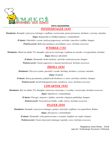 DIETA CAŁODZIENNA PONIEDZIAŁEK 16/01 Śniadanie: Kanapki z pieczywa żytniego z wędliną i warzywami, pasta jarzynowa, herbata z cytryną i miodem Zupa: Kapuśniak ze słodkiej kapusty z ziemniakami II danie: Naleśniki z serem i polewą jogurtową, surówka z marchwi i jabłka, kompot Podwieczorek: Bułeczka maślana z powidłami, owoc, herbata owocowa WTOREK 17/01 Śniadanie: Musli na mleku 2%, kanapki z pieczywa razowego z jajkiem na twardo i szczypiorkiem, herbata Zupa: Barszcz ukraiński II danie: Ziemniaki, kotlet mielony, surówka wielowarzywna, kompot Podwieczorek: Ciasto jogurtowe z musem morelowym, herbata owocowa ŚRODA 18/01 Śniadanie: Pieczywo żytnie, parówki z szynki, ketchup, herbata z cytryną i miodem Zupa: Krupnik II danie: Kasza jęczmienna, polędwiczki drobiowe w sosie, surówka colesław, kompot Podwieczorek: Serek homogenizowany waniliowy, owoc, herbata owocowa CZWARTEK 19/01 Śniadanie: Ryż na mleku 2%, Kanapki z pieczywa razowego z z szynką i warzywami, herbata owocowa Zupa: Ogórkowa z ziemniakami II danie: Pierogi z mięsem z indyka, surówka z kapusty pekińskiej, kompot Podwieczorek: Twarożek na słodko, wafle ryżowe, herbata owocowa PIĄTEK 20/01 Śniadanie: Kanapki z pieczywa żytniego z pastą z tuńczyka z jajkiem i szczypiorkiem, Kakao Zupa: Jarzynowa z ziemniakami II danie: Ziemniaki, ryba panierowana w sezamie, kalafior na ciepło, kompot Podwieczorek: Ciasto murzynek własnego wypieku, owoc, herbata owocowa Magdalena Anna Dobaj – Zerek mgr inż. Technologii Żywności i Dietetyk DIETA BEZMLECZNA PONIEDZIAŁEK 16/01 Śniadanie: Kanapki z pieczywa żytniego z wędliną i warzywami, pasta jarzynowa, herbata z cytryną i miodem Zupa: Kapuśniak ze słodkiej kapusty z ziemniakami II danie: Ryż, Potrawka z kurczaka, surówka z marchwi i jabłka, kompot Podwieczorek: Wafle ryżowe, owoc, herbata owocowa WTOREK 17/01 Śniadanie: Kanapki z pieczywa razowego z wędliną z warzywami, herbata Zupa: Barszcz ukraiński niezabielany II danie: Ziemniaki, kotlet mielony, surówka wielowarzywna, kompot Podwieczorek: Ryż z jabłuszkiem prażonym, herbata owocowa ŚRODA 18/01 Śniadanie: Pieczywo żytnie, parówki z szynki, ketchup, herbata z cytryną i miodem Zupa: Krupnik II danie: Kasza jęczmienna, polędwiczki drobiowe w sosie, surówka colesław, kompot Podwieczorek: Serek sojowy waniliowy, owoc, herbata owocowa CZWARTEK 19/01 Śniadanie: Kanapki z pieczywa razowego z szynką i warzywami, herbata owocowa Zupa: Ogórkowa z ziemniakami niezabielana II danie: Pierogi z mięsem z indyka, surówka z kapusty pekińskiej, kompot Podwieczorek: Kisiel owocowy, wafle ryżowe, herbata owocowa PIĄTEK 20/01 Śniadanie: Kanapki z pieczywa żytniego z pastą z tuńczyka ze szczypiorkiem, Wędlina drobiowa, Herbata owocowa Zupa: Jarzynowa z ziemniakami niezabielana II danie: Ziemniaki, ryba panierowana w sezamie, kalafior na ciepło, kompot Podwieczorek: Sałatka owocowa, herbata owocowa Magdalena Anna Dobaj – Zerek mgr inż. Technologii Żywności i Dietetyk DIETA BEZGLUTENOWA PONIEDZIAŁEK 16/01 Śniadanie: Kanapki z pieczywa kukurydzianego z wędliną i warzywami, pasta jarzynowa, herbata z cytryną i miodem Zupa: Kapuśniak ze słodkiej kapusty z ziemniakami II danie: Ryż, Potrawka z kurczaka, surówka z marchwi i jabłka, kompot Podwieczorek: Wafle ryżowe, owoc, herbata owocowa WTOREK 17/01 Śniadanie: Kanapki z pieczywa kukurydzianego z wędliną z warzywami, herbata Zupa: Barszcz ukraiński niezabielany II danie: Ziemniaki, kotlet mielony, surówka wielowarzywna, kompot Podwieczorek: Ryż z jabłuszkiem prażonym, herbata owocowa ŚRODA 18/01 Śniadanie: Pieczywo kukurydziane, wędlina drobiowa z warzywami, herbata z cytryną i miodem Zupa: ziemniaczana II danie: Ryż, polędwiczki drobiowe w sosie, surówka colesław, kompot Podwieczorek: Serek sojowy waniliowy, owoc, herbata owocowa CZWARTEK 19/01 Śniadanie: Kanapki z pieczywa kukurydzianego z szynką i warzywami, herbata owocowa Zupa: Ogórkowa z ziemniakami niezabielana II danie: Pierogi bezglutenowe z mięsem z indyka, surówka z kapusty pekińskiej, kompot Podwieczorek: Kisiel owocowy bezglutenowy, wafle ryżowe, herbata owocowa PIĄTEK 20/01 Śniadanie: Kanapki z pieczywa kukurydzianego z pastą z tuńczyka ze szczypiorkiem, Wędlina drobiowa, Herbata owocowa Zupa: Jarzynowa z ziemniakami niezabielana II danie: Ziemniaki, ryba panierowana, kalafior na ciepło, kompot Podwieczorek: Sałatka owocowa, herbata owocowa Magdalena Anna Dobaj – Zerek mgr inż. Technologii Żywności i Dietetyk