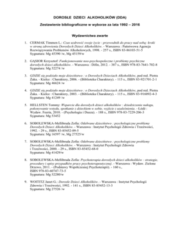 DOROSŁE DZIECI ALKOHOLIKÓW (DDA) Zestawienie bibliograficzne w wyborze za lata 1992 – 2016 Wydawnictwa zwarte 1. CERMAK Timmen L.: Czas uzdrowić swoje życie : przewodnik do pracy nad sobą: kroki w stronę zdrowienia Dorosłych Dzieci Alkoholików. - Warszawa : Państwowa Agencja Rozwiązywania Problemów Alkoholowych, 1998. - 257 s., ISBN 83-86103-51-5 Sygnatura: Mg 45390 /w, Mg 45159/w 2. GĄSIOR Krzysztof: Funkcjonowanie noo-psychospołeczne i problemy psychiczne dorosłych dzieci alkoholików. - Warszawa : Difin, 2012. - 387 s., ISBN 978-83-7641-702-8 Sygnatura: Mg 52274 /w 3. GDZIE się podziało moje dzieciństwo : o Dorosłych Dzieciach Alkoholików, pod red. Piotra Żaka. - Kielce : Charaktery, 2006. - (Biblioteka Charaktery). - 115 s., ISBN 83-921701-2-1 Sygnatura: Mg 46624 /w 4. GDZIE się podziało moje dzieciństwo : o Dorosłych Dzieciach Alkoholików, pod red. Piotra Żaka. - Kielce : Charaktery, 2003. - (Biblioteka Charaktery). - 115 s., ISBN 83-916092-4-3 Sygnatura: Mg 41249 /w 5. HELLSTEN Tommy: Wsparcie dla dorosłych dzieci alkoholików : dziedziczenie nałogu, pokonywanie wstydu, spotkanie z dzieckiem w sobie, wyjście z uzależnienia. - Łódź : Wydaw. Feeria, 2010. - (Psychologia i Dusza). - 188 s., ISBN 978-83-7229-206-3 Sygnatura: Mg 53452 6. SOBOLEWSKA-Mellibruda Zofia: Odebrane dzieciństwo : psychologiczne problemy Dorosłych Dzieci Alkoholików. - Warszawa : Instytut Psychologii Zdrowia i Trzeźwości, 1992. - 29 s., ISBN 83-85452-09-5 Sygnatura: Mg 16597 /w, Mg 27525/w 7. SOBOLEWSKA-Mellibruda Zofia: Odebrane dzieciństwo : psychologiczne problemy Dorosłych Dzieci Alkoholików. - Warszawa : Instytut Psychologii Zdrowia i Trzeźwości, 2000. - 29 s., ISBN 83-85452-68-0 Sygnatura: Mg 41429/w 8. SOBOLEWSKA-Mellibruda Zofia: Psychoterapia dorosłych dzieci alkoholików : strategie, procedury i opisy przypadków pracy psychoterapeutycznej. - Warszawa : Wydaw. Zielone Drzewo, 2011. - (Podstawy Współczesnej Psychoterapii). - 160 s., ISBN 978-83-60747-73-5 Sygnatura: Mg 52280/w 9. WOITITZ Janet G.: Dorosłe Dzieci Alkoholików. - Warszawa : Instytut Psychologii Zdrowia i Trzeźwości, 1992. - 141 s., ISBN 83-85452-13-3 Sygnatura: Mg 27526 /w Artykuły z czasopism 1. CERMAK Timmen L., Rutzky Jacques: DDA: czas na wyleczenie. W: Charaktery. - 2010, nr 10, s. 108-[113] 2. CERMAK Timmen L: DDA, czyli historia osobista. W: Charaktery. - 2010, nr 12, s. 88-90 3. CERMAK Timmen L: Podróż po uzdrowienie. W: Charaktery. - 2010, nr 9, s. 110-113 4. CHAŃKO Anna: Miłość współuzależniona : postawy wobec miłości Dorosłych Dzieci Alkoholików. W: Opieka, Wychowanie, Terapia. - 2011, nr 1/2, s. 13-16 5. CHODKIEWICZ Jan, Wilska Agata: Stan zdrowia, wsparcie społeczne i zadowolenie z życia Dorosłych Dzieci Alkoholików (DDA) korzystających z pomocy terapeutycznej. W: Alkoholizm i Narkomania. - 2008, nr 2, s. 135-152 6. CHODKIEWICZ Jan, Wilska Agata: Stan zdrowia, wsparcie społeczne i zadowolenie z życia Dorosłych Dzieci Alkoholików (DDA) korzystających z pomocy terapeutycznej. W: Alkoholizm i Narkomania. - 2008, nr 2, s. 135-152 7. DEMBNA Joanna, Zaleciło Ewelina: DDA - Dążyć Do Aktywności. W: Remedium. 2008, nr 1, s. 30-31 8. DYJAKON Dorota: Spostrzeganie rodziców przez dorosłe dzieci alkoholików w trakcie terapii. W: Świat Problemów. - 2015, nr 2, s. 28-32 9. DYJAKON Dorota: Świat według DDA. W: Świat Problemów. - 2012, nr 2, s. 15-19 10. GĄSIOR Krzysztof: Dorośli, dzieci alkoholików : kim są i czy potrzebują terapii? W: Świat Problemów. - 2010, nr 6, s. 5-8 11. HEBENSTREIT-Maruszewska Anna: Miłość, która boli - seksualność dorosłych dzieci alkoholików. W: Świat Problemów. - 2015, nr 2, s. 37-41 12. KOŁODZIEJCZYK Katarzyna: Alkoholowe dziedzictwo. W: Wychowanie na Co Dzień. - 2001, nr 10-11, s. 43 13. KRAWCZYK - BOCIAN Amelia: Trzy oblicza dorosłych dzieci alkoholików. W: Świat Problemów. - 2005, nr 4, s. 31-33 14. KUCIŃSKA Marzenna: Bliskość w zasięgu ręki. W: Charaktery. - 2011, nr 4, s. 88-90 15. KUCIŃSKA Marzenna: Lepsza niż matka, nieobecny jak ojciec. W: Charaktery. - 2011, nr 12, s. 74-77 16. KUCIŃSKA Marzenna: Mapa pomocy dla DDA. W: Charaktery. - 2011, nr 8, s. 78-81 17. KUCIŃSKA Marzenna: Niszczyciele własnych marzeń. W: Charaktery. - 2009, nr 4, s. 88-90 18. KUCIŃSKA Marzenna: Powtórka z samotności. W: Charaktery. - 2012, nr 8, s. 82-85 19. MARCZAK Monika: Intymność w związkach DDA w kontekście teorii przywiązania. W: Remedium. - 2009, nr 7/8, s. 11-13 20. MELLIBRUDA Jerzy: Trzy miliony DDA. W: Charaktery. - 2011, nr 2, s. 74-77 21. MELLIBRUDA Jerzy: Życie po traumie. W: Charaktery. - 2011, nr 5, s. 76-79 22. PETRIKOWSKA Katarzyna R.: Dorosłe Dzieci Alkoholika :zaburzenia lękowe czy już zespół stresu pourazowego? W: Świat Problemów. - 2012, nr 2, s. 23-26 23. PŁACHCIŃSKA Grażyna: DDA – trudna droga do uleczenia ran . W: Świat Problemów. - 2007, nr 1, s. 9-10 24. PŁACHCIŃSKA Grażyna: DDA - trudna droga do uleczenia ran. W: Świat Problemów. 2007, nr 1, s. 9-10 25. SEWERTYŃSKA Anna Maria: Nietypowy kryzys . W: Świat Problemów. - 1999, nr 3, s. 40-45 26. SIWY-HUDOWSKA Anna: Satysfakcja z życia i nasilenie objawów depresyjnych u Dorosłych Dzieci Alkoholików. W: Alkoholizm i Narkomania. - 2010, nr 2, s. 127-140 27. SKRĘTOWSKA Honorata: Problemy w tworzeniu bliskich związków u DDA. W: Świat Problemów. - 2008, nr 7, s. 4-8 28. SOBOLEWSKA-Mellibruda Zofia: Co trzyma Dorosłe Dzieci Alkoholików w pokoju dziecięcym? W: Świat Problemów. - 2007, nr 11, s. 32-34 29. SZCZUKIEWICZ Piotr: Mężczyźni DDA w swoich rodzinach. W: Świat Problemów. 1999, nr 6, s. 42-45 30. WARDZYŃSKA Teresa: Doświadczenia DDA w rodzinie pochodzenia a relacje między rodzeństwem w dorosłości. W: Świat Problemów. - 2015, nr 2, s. 33-36 31. WAWAERSKA-KUS Joanna: Psychoterapia dla DDA – grupowo, indywidualnie, a może wcale? W: Świat Problemów. - 2010, nr 6, s. 14-16 32. WAWERSKA-