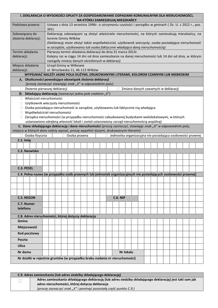 I. DEKLARACJA O WYSOKOŚCI OPŁATY ZA GOSPODAROWANIE ODPADAMI KOMUNALNYMI DLA NIERUCHOMOŚCI, NA KTÓREJ ZAMIESZKUJĄ MIESZKAŃCY Podstawa prawna: Ustawa z dnia 13 września 1996r. o utrzymaniu czystości i porządku w gminach ( Dz. U. z 2012 r., poz. 391) Zobowiązany do Deklarację zobowiązani są złożyć właściciele nieruchomości, na których zamieszkują mieszkańcy, na złożenia deklaracji: terenie Gminy Wilków (Deklarację może złożyć także współwłaściciel, użytkownik wieczysty, osoba posiadająca nieruchomość w zarządzie, użytkowaniu lub osoba faktycznie władająca daną nieruchomością) Termin składania Pierwszy termin składania deklaracji do dnia 31 marca 2013r. deklaracji: Kolejny raz w ciągu 14 dni od dnia zamieszkania na danej nieruchomości lub 14 dni od dnia, w którym nastąpiły zmiany danych określonych w deklaracji Miejsce składania Urząd Gminy w Wilkowie deklaracji: ul. Wrocławska 11, 46-113 Wilków WYPEŁNIAĆ NALEŻY JASNE POLA DUŻYMI, DRUKOWANYMI LITERAMI, KOLOREM CZARNYM LUB NIEBIESKIM Okoliczności powodujące obowiązek złożenia deklaracji (proszę zaznaczyć stawiając znak „X” w odpowiednim polu) Złożenie pierwszej deklaracji Zmiana danych zawartych w deklaracji Składający deklarację (zaznaczyć jedno pole znakiem „X”) Właściciel nieruchomości Użytkownik wieczysty nieruchomości Osoba posiadająca nieruchomość w zarządzie, użytkowaniu lub faktycznie nią władająca Współwłaściciel nieruchomości Zarządca nieruchomości (w przypadku nieruchomości zabudowanej budynkami wielolokalowymi, w których ustanowiono odrębną własność lokali i został ustanowiony zarząd nieruchomością wspólną) C. Dane składającego deklarację i dane nieruchomości (proszę zaznaczyć, stawiając znak „X” w odpowiednim polu, miejsca w których dane należy wpisać, proszę wypełnić dużymi, drukowanymi literami) Osoba fizyczna Osoba prawna Jednostka organizacyjna nie posiadająca osobowości prawnej C.1. Imię C.2. Nazwisko C.3. PESEL C.4. Pełna nazwa (w przypadku osób prawnych lub jednostek organizacyjnych nie posiadających osobowości prawnej) C.5. REGON C.6. NIP C.7. Numer telefonu C.8. Adres nieruchomości, której dotyczy deklaracja Gmina Miejscowość Kod pocztowy Poczta Ulica Nr domu Nr lokalu Nr działki w rejestrze gruntów (w przypadku braku nadania nr nieruchomości) C.9. Adres zamieszkania (lub adres siedziby składającego deklarację) Adres zamieszkania składającego deklarację (lub adres siedziby składającego deklarację) jest taki sam jak adres nieruchomości, której dotyczy deklaracja (proszę zaznaczyć znak „X” i pominąć pozostałą część punktu C.9.) Gmina Miejscowość Kod pocztowy Poczta Ulica Nr domu Nr lokalu D. Dane na temat sposobu zbierania i magazynowania odpadów D.1. Sposób zbierania odpadów Odpady komunalne będą zbierane w sposób Odpady komunalne nie będą zbierane selektywny zgodnie z regulaminem w sposób selektywny utrzymania czystości i porządku na terenie gminy Wilków D.2. Sposób magazynowania odpadów Pojemniki przeznaczone wyłącznie dla nie więcej niż dwóch lokali mieszkalnych (np. budynki jednorodzinne) Boks śmietnikowy, altana śmietnikowa, plac (np. budynki wielorodzinne) Adres, lokalizacja boksu, altany, placu E. Opłata za gospodarowanie odpadami komunalnymi (zaznaczyć znakiem „X” lub w przypadku większej ilości osób niż 5, wpisać cyframi w kratkach) E.1. Deklaruję następującą trzy pięć ilość osób zamieszkujących* jedna dwie cztery nieruchomość, której dotyczy Więcej niż 5 osób, tj. deklaracja * miejscem zamieszkiwania, jest nieruchomość, w której osoba przebywa z zamiarem stałego pobytu (ponad 3 miesiące), niezależnie od miejsca zameldowania. E.2. Prowadzenie kompostownika na nieruchomości proszę zaznaczyć, stawiając znak „X” w odpowiednim polu) Deklaruję, że na terenie nieruchomości, której dotyczy deklaracja, prowadzić będę kompostownik E.3. Wysokość opłaty od jednego mieszkańca Dla odpadów komunalnych zbieranych w sposób selektywny, stawka opłaty od 1 mieszkańca za 1 miesiąc wynosi: 10,00 zł Dla odpadów komunalnych nie zbieranych w sposób selektywny, stawka opłaty od 1 mieszkańca za 1 miesiąc wynosi: 15,00 zł E.4. Obliczenie stawki opłaty miesięcznej dla nieruchomości, na której zamieszkują mieszkańcy (kwotę należy podać w złotych polskich z dokładnością do dwóch miejsc po przecinku) Stawka opłaty z pkt. E.3. Ilość osób zamieszkujących = x nieruchomość z pkt. E.1. Wysokość opłaty za gospodarowanie odpadami komunalnymi (opłata do zapłaty) obliczona samodzielnie przez właściciela nieruchomości, zgodnie ze złożoną deklaracją, ponoszona będzie zgodnie z uchwałą Rady Gminy z dn. ……………… o terminie, częstotliwości i trybie uiszczania opłaty od mieszkańców – uchwała nr ……………….. F. Deklaracja zapotrzebowania na pojemniki i worki dla poszczególnych rodzajów odpadów: F.1. Zabudowa jednorodzinna Deklaruję następującą ilość 60l Deklaruję następującą ilość 120 l pojemników przeznaczonych worków przeznaczonych do do zbierania zmieszanych zbierania papieru 120l odpadów komunalnych i makulatury (częstotliwość opróżniania 1 (częstotliwość opróżniania 1 240l raz w ciągu dwóch tygodni) raz w ciągu miesiąca) Deklaruję następującą ilość 120 l Deklaruję następującą ilość 120 l worków przeznaczonych do worków przeznaczonych do zbierania tworzyw sztucznych zbierania szkła (częstotliwość opróżniania 1 (częstotliwość opróżniania 1 raz w ciągu miesiąca) raz w ciągu miesiąca) Deklaruję następującą ilość worków przeznaczonych do zbierania odpadów zielonych 120 l (częstotliwość opróżniania 1 raz na dwa tygodnie w okresie od 1 kwietnia do 30 listopada) F.2. Zabudowa wielorodzinna Deklaruję następującą ilość 120l Deklaruję następującą ilość pojemników 