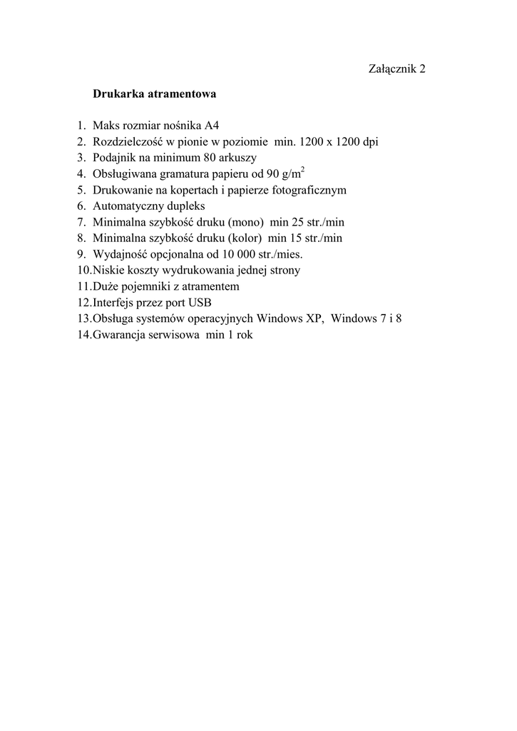 Załącznik 2 Drukarka atramentowa 1. Maks rozmiar nośnika A4 2. Rozdzielczość w pionie w poziomie min. 1200 x 1200 dpi 3. Podajnik na minimum 80 arkuszy 4. Obsługiwana gramatura papieru od 90 g/m2 5. Drukowanie na kopertach i papierze fotograficznym 6. Automatyczny dupleks 7. Minimalna szybkość druku (mono) min 25 str./min 8. Minimalna szybkość druku (kolor) min 15 str./min 9. Wydajność opcjonalna od 10 000 str./mies. 10.Niskie koszty wydrukowania jednej strony 11.Duże pojemniki z atramentem 12.Interfejs przez port USB 13.Obsługa systemów operacyjnych Windows XP, Windows 7 i 8 14.Gwarancja serwisowa min 1 rok