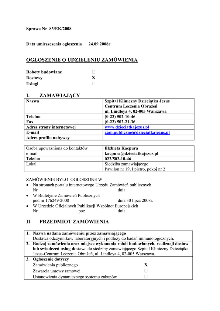 OGŁOSZENIE O UDZIELENIU ZAMÓWIENIA X I. ZAMAWIAJĄCY II