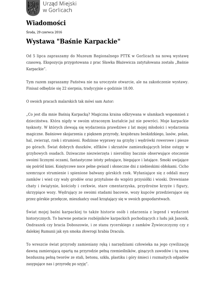Wiadomości Środa, 29 czerwca 2016 Wystawa "Baśnie Karpackie" Od 5 lipca zapraszamy do Muzeum Regionalnego PTTK w Gorlicach na nową wystawę czasową. Ekspozycja przygotowana z prac Sławka Błażewicza zatytułowana została „Baśnie Karpackie”. Tym razem zapraszamy Państwa nie na uroczyste otwarcie, ale na zakończenie wystawy. Finisaż odbędzie się 22 sierpnia, tradycyjnie o godzinie 18.00. O swoich pracach malarskich tak mówi sam Autor: „Co jest dla mnie Baśnią Karpacką? Magiczna kraina odkrywana w ułamkach wspomnień z dzieciństwa. Która nigdy w swoim utraconym kształcie już nie powróci. Moje karpackie tęsknoty. W których zlewają się wydarzenia prawdziwe z lat mojej młodości i wydarzenia magiczne. Baśniowe skojarzenia z pięknem przyrody, krajobrazu beskidzkiego, lasów, polan, hal, zwierząt, rzek i strumieni. Rodzinne wyprawy na grzyby i wędrówki rowerowe i piesze po górach. Świat dobrych duszków, elfików i skrzatów zamieszkujących leśne ostępy w grzybowych osadach. Dziwaczne niezwierzęta i nierośliny bacznie obserwujące otoczenie swoimi licznymi oczami, fantastyczne istoty pełzające, biegające i latające. Smoki uwijające się pośród kniei. Księżycowe noce pełne gwiazd i słoneczne dni z niebieskimi obłokami. Cicho szemrzące strumienie i spienione bałwany górskich rzek. Wyłaniające się z oddali mury zamków i wież czy wały grodów oraz przytulone do wzgórz przysiółki i wioski. Drewniane chaty i świątynie, kościoły i cerkwie, stare cmentarzyska, przydrożne krzyże i figury, skrzypiące wozy. Wędrujący ze swoimi stadami bacowie, wozy kupców przedzierające się przez górskie przełęcze, mieszkańcy osad krzątający się w swoich gospodarstwach. Świat mojej baśni karpackiej to także historie osób i zdarzenia z legend i wydarzeń historycznych. To barwne postacie rozbójników karpackich pochodzących z ludu jak Janosik, Ondraszek czy bracia Doboszowie, i ze stanu rycerskiego z zamków Żywieczczyzny czy z dalekiej Rumunii jak syn smoka złowrogi hrabia Dracula. To wreszcie świat przyrody zamieniany ręką i narzędziami człowieka na jego cywilizację dawną zamierającą opartą na przyrodzie pełną rzemieślników, ginących zawodów i tą nową bezduszną pełną tworów ze stali, betonu, szkła, plastiku i góry śmieci i rozmaitych odpadów zasypujące nas i przyrodę po szyję”.