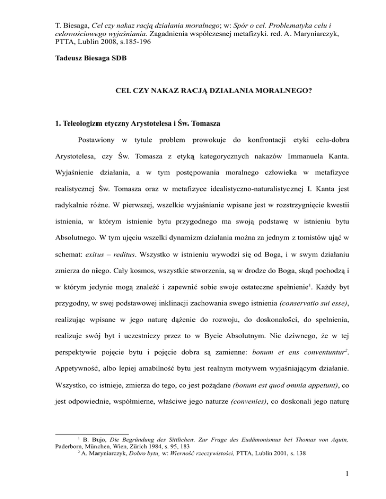 T. Biesaga, Cel czy nakaz racją działania moralnego; w: Spór o cel. Problematyka celu i celowościowego wyjaśniania. Zagadnienia współczesnej metafizyki. red. A. Maryniarczyk, PTTA, Lublin 2008, s.185-196 Tadeusz Biesaga SDB CEL CZY NAKAZ RACJĄ DZIAŁANIA MORALNEGO? 1. Teleologizm etyczny Arystotelesa i Św. Tomasza Postawiony w tytule problem prowokuje do konfrontacji etyki celu-dobra Arystotelesa, czy Św. Tomasza z etyką kategorycznych nakazów Immanuela Kanta. Wyjaśnienie działania, a w tym postępowania moralnego człowieka w metafizyce realistycznej Św. Tomasza oraz w metafizyce idealistyczno-naturalistycznej I. Kanta jest radykalnie różne. W pierwszej, wszelkie wyjaśnianie wpisane jest w rozstrzygnięcie kwestii istnienia, w którym istnienie bytu przygodnego ma swoją podstawę w istnieniu bytu Absolutnego. W tym ujęciu wszelki dynamizm działania można za jednym z tomistów ująć w schemat: exitus – reditus. Wszystko w istnieniu wywodzi się od Boga, i w swym działaniu zmierza do niego. Cały kosmos, wszystkie stworzenia, są w drodze do Boga, skąd pochodzą i w którym jedynie mogą znaleźć i zapewnić sobie swoje ostateczne spełnienie1. Każdy byt przygodny, w swej podstawowej inklinacji zachowania swego istnienia (conservatio sui esse), realizując wpisane w jego naturę dążenie do rozwoju, do doskonałości, do spełnienia, realizuje swój byt i uczestniczy przez to w Bycie Absolutnym. Nic dziwnego, że w tej perspektywie pojęcie bytu i pojęcie dobra są zamienne: bonum et ens conventuntur2. Appetywność, albo lepiej amabilność bytu jest realnym motywem wyjaśniającym działanie. Wszystko, co istnieje, zmierza do tego, co jest pożądane (bonum est quod omnia appetunt), co jest odpowiednie, współmierne, właściwe jego naturze (convenies), co doskonali jego naturę 1 B. Bujo, Die Begründung des Sittlichen. Zur Frage des Eudämonismus bei Thomas von Aquin, Paderborn, München, Wien, Zürich 1984, s. 95, 183 2 A. Maryniarczyk, Dobro bytu¸ w: Wierność rzeczywistości, PTTA, Lublin 2001, s. 138 1 T. Biesaga, Cel czy nakaz racją działania moralnego; w: Spór o cel. Problematyka celu i celowościowego wyjaśniania. Zagadnienia współczesnej metafizyki. red. A. Maryniarczyk, PTTA, Lublin 2008, s.185-196 (perficiens), co posiada tę doskonałość w sobie (perfectum)3. W ten sposób Św. Tomasz, wychodząc od podmiotowej, subiektywnej strony dobra, takiej która wprost nam się narzuca, doszedł do obiektywnego uzasadnienia, dlaczego dobro jest dla nas appetywne, amabilne. Desiderium naturale niejako samo prowadzi byty nieświadome do celu. W przypadku człowieka dzieje się to w sposób świadomy i wolny. Człowiek poznaje celowość tendencji swojej natury osobowej, rozpoznaje cele pośrednie oraz cel ostateczny i swoje czyny świadomie wpisuje w jego realizację. Dobro-cel, racja wszelkiego działania, nie jest tu konstruowana przez człowieka, ale zastana przez niego wraz z realnym zaistnieniem, wraz z posiadaniem natury bytu osobowego. Omnes agens agit proter finem, czy też omnes agens agit propter bonum. Każdy, w tym również człowiek, działa dla celu, który jest dobrem dlatego, że mając doskonałość w sobie, doskonali naturę człowieka, odpowiada tej naturze i jest przez nią pożądany i kochany4. Etyka teleologiczna Arystotelesa jest głównie etyką agatologiczno-aretologiczną. Wymaga ona rozpoznania dobra-celu i nabycia odpowiednich sprawności, czyli cnót, które ułatwiają osiągnięcie tego dobra. Nakazy spełniają w niej rolę wtórną. Naprowadzają one na dobro, ale to ono i sprawności moralne, czyli cnoty mają decydującą rolę w jego realizacji. Nakazy czy obowiązki odgrywają rolę pośrednią, mogą pomagać w nabywaniu cnót. Przy osiągnięciu jednak względnej integracji osobowościowej, po nabyciu jakiegoś stopnia cnót, stają się one mniej natarczywe, mniej widoczne, gdyż samo dobro jako takie, pobudza do jego realizacji, a dzięki cnotom jest bardziej miłowane i łatwiej realizowane. Dobro dla człowieka cnotliwego jest zarówno pociągające, łatwe do realizacji, jak też uszczęśliwiające5. 3 Św. Tomasz, STh I q. 5 a. 1 i q. 5 a. 3 ad 2. A. Maryniarczyk, Dobro bytu, dz. cyt., s. 140nn 5 T. Biesaga, Spór o normę moralności, WN PAT, Kraków 1998, s. 271nn 4 2 T. Biesaga, Cel czy nakaz racją działania moralnego; w: Spór o cel. Problematyka celu i celowościowego wyjaśniania. Zagadnienia współczesnej metafizyki. red. A. Maryniarczyk, PTTA, Lublin 2008, s.185-196 Inaczej jest w etyce I. Kanta, która nie jest teorią dobra, ale teorią obrony własnej autonomii, przed napierającymi na nią wszelkimi impulsami i motywami. Najważniejsze dla niej jest nie to, co czynię, ale jak to czynię, by nie utracić autonomii czystego podmiotu. Stąd pierwszeństwo w tej teorii będą mieć samonakazy, imperatywy potwierdzające ciągle autonomiczny podmiot. 2. Autonomizm etyczny Immanuela Kanta Immanuel Kant, uwikłany w spór nowożytnego racjonalizmu z empiryzmem, nie tyle go przezwyciężył, co pogłębił dychotomię: empiryzm-aprioryzm. Uczynił to przez radykalne oddzielenie sfery empirycznej od apriorycznej i umieszczenie metafizyki i etyki w tej ostatniej. Radykalnie oddzielił on od siebie dwa światy: mundus intelligibilis i mundus sensibilis, świat noumenów i świat fenomenów, świat czystego podmiotu, czystej wolności (homo noumenon) i świat cielesności człowieka (homo phenomenon). Filozofię, a w tym etykę, potraktował jako naukę aprioryczną, dostarczającą nam zasad kategorycznych, w odróżnieniu od nauk empirycznych, które dostarczają nam jedynie wiedzy hipotetycznej. Centralną ideą aprioryczną, wokół której Kant zbudował swoją metafizykę moralności, jest przyjęta przez niego idea wolności, idea autonomii czystego podmiotu, czystego rozumu praktycznego, czystej woli. Wolności woli nie da się jego zdaniem udowodnić, ale należy ją z góry przyją