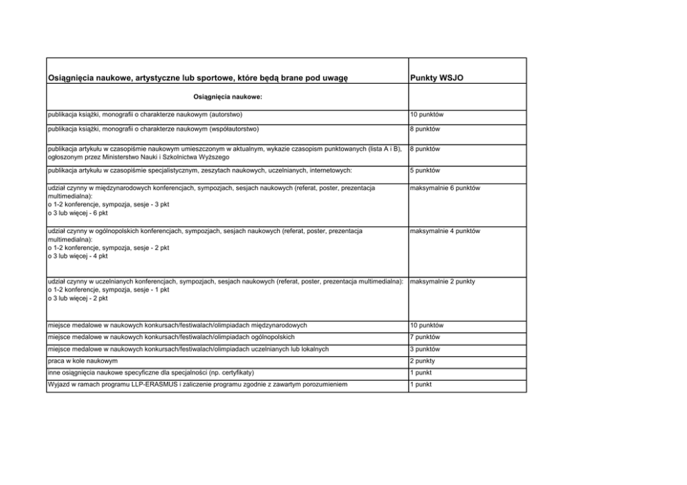 Osiągnięcia naukowe, artystyczne lub sportowe, które będą brane pod uwagę Punkty WSJO Osiągnięcia naukowe: publikacja książki, monografii o charakterze naukowym (autorstwo) 10 punktów publikacja książki, monografii o charakterze naukowym (współautorstwo) 8 punktów publikacja artykułu w czasopiśmie naukowym umieszczonym w aktualnym, wykazie czasopism punktowanych (lista A i B), ogłoszonym przez Ministerstwo Nauki i Szkolnictwa Wyższego 8 punktów publikacja artykułu w czasopiśmie specjalistycznym, zeszytach naukowych, uczelnianych, internetowych: 5 punktów udział czynny w międzynarodowych konferencjach, sympozjach, sesjach naukowych (referat, poster, prezentacja multimedialna): o 1-2 konferencje, sympozja, sesje - 3 pkt o 3 lub więcej - 6 pkt maksymalnie 6 punktów udział czynny w ogólnopolskich konferencjach, sympozjach, sesjach naukowych (referat, poster, prezentacja multimedialna): o 1-2 konferencje, sympozja, sesje - 2 pkt o 3 lub więcej - 4 pkt maksymalnie 4 punktów udział czynny w uczelnianych konferencjach, sympozjach, sesjach naukowych (referat, poster, prezentacja multimedialna): o 1-2 konferencje, sympozja, sesje - 1 pkt o 3 lub więcej - 2 pkt maksymalnie 2 punkty miejsce medalowe w naukowych konkursach/festiwalach/olimpiadach międzynarodowych 10 punktów miejsce medalowe w naukowych konkursach/festiwalach/olimpiadach ogólnopolskich 7 punktów miejsce medalowe w naukowych konkursach/festiwalach/olimpiadach uczelnianych lub lokalnych 3 punktów praca w kole naukowym 2 punkty inne osiągnięcia naukowe specyficzne dla specjalności (np. certyfikaty) 1 punkt Wyjazd w ramach programu LLP-ERASMUS i zaliczenie programu zgodnie z zawartym porozumieniem 1 punkt Osiągnięcia artystyczne: indywidualna publikacja dzieł artystycznych (np.: album, płyta); wystawa autorskich prac itp. 10 punktów zamieszczenie dzieła artystycznego w publikacji zbiorowej, prezentacja prac artystycznych - wystawa zbiorowa; 2 punkty miejsce medalowe w artystycznych konkursach/festiwalach/olimpiadach międzynarodowych 10 punktów miejsce medalowe w artystycznych konkursach/festiwalach/olimpiadach ogólnopolskich 7 punktów miejsce medalowe w artystycznych konkursach/festiwalach/olimpiadach/uczelnianych lub lokalnych 3 punkty Osiągnięcia sportowe: zajęcie medalowego miejsca w zawodach rangi Mistrzostw Kontynentu lub Świata 10 punktów zajęcie medalowego miejsca w Mistrzostwach Polski 8 punktów posiadanie statusu członka kadry narodowej 9 punktów zajęcie medalowego miejsca w Akademickich Mistrzostwach Polski 6 punktów zajęcie medalowego miejsca w masowych imprezach ogólnopolskich (np. Poznań Maraton) 3 punkty