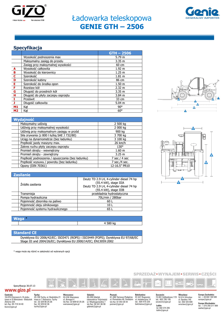 Ładowarka teleskopowa GENIE GTH – 2506 Specyfikacja GTH – 2506 A B C D E F G H I J M1 M2 Wysokość podnoszenia max Maksymalny zasięg do przodu Zasięg przy maksymalnej wysokości Wysokość całkowita Wysokość do kierownicy Szerokość Szerokość kabiny Szerokość do środka opon Rozstaw kół Długość do przednich kół Długość do płyty zaczepu osprzętu Prześwit Długość całkowita Kąt Kąt 5.79 m 3.35 m 60 cm 1.92 m 1.25 m 1.81 m 86 cm 1.50 m 2.32 m 3.35 m 3.84 m 33 cm 5.04 m 90° 60° Wydajność Maksymalny udźwig Udźwig przy maksymalnej wysokości Udźwig przy maksymalnym zasięgu w przód Siła zrywania (z 800 l łyżką SAE J 732/80) Uciąg na dynamometrze (bez ładunku) Prędkość jazdy maszyny max. Zakres ruchu płyty zaczepu osprzętu Promień skrętu - wewnętrzny Promień skrętu - zewnętrzny Prędkość podnoszenia / opuszczania (bez ładunku) Prędkość wysuwu / powrotu (bez ładunku) Opony (DIN 70361) 2 500 kg 2 000 kg 900 kg 3 700 kg 3 100 kg 26 km/h 130° 1.60 m 3.25 m 7 sec / 4 sec 7 sec./4 sec. 12-16.5” PR10 Zasilanie Źródło zasilania Transmisja Pompa hydrauliczna Pojemność zbiornika na paliwo Pojemność oleju silnikowego Pojemność systemu hydraulicznego Deutz TD 2.9 L4, 4-cylinder diesel 74 hp (55.4 kW), stage IIIA Deutz TD 2.9 L4, 4-cylinder diesel 74 hp (55.4 kW), stage IIIB przekładnia hydrostatyczna 70L/min / 280bar 60 L 10 L 65 L Waga * 4 580 kg Standard CE Dyrektywa EU 2006/42/EC; ISO3471 (ROPS) i ISO3449 (FOPS); Dyrektywa EU 97/68/EC Stage III and 2004/26/EC; Dyrektywa EU 2000/14/EC; EN13059:2002 * waga może się różnić w zależności od wybranych opcji Specyfikacja 30.07.13 Ładowarka teleskopowa GENIE GTH – 2506 CHARAKTERYSTYKA Standardowe wyposażenie Opcje dodatkowe Wymiary GTH - 2506 - klimatyzacja - 5.79 m – wysokość podnoszenia - główna linia elektryczna na wysięgniku - do 2 500 kg udźwigu 3.35 m - maksymalny zasięg do przodu - dodatkowa linia hydrauliczna na wysięgniku hydrauliczne szybkozłącze dla osprzętu Wyposażenie - regulowany reflektor na wysięgniku i kabinie - 4x4 - siatka ochronna przedniej szyby - 3 opcje sterowania: - szyba na dachu kabiny - skrętne koła przednie, 6 t hak holowniczy paliwo zimowe -22 ° C chłodnica oleju hydraulicznego biodegradowalny olej hydrauliczny specjalny filtr powietrza - 4 koła skrętne - - linia hydrauliczna na ramieniu - opony 12-16.5” PR10 - wspomaganie kierownicy - opony 340/65 R18 XP27 - przekładnia hydrostatyczna - koło zapasowe 12-16.5” PR10 - 2-biegowa skrzynia mechaniczna - koło zapasowe, wypełnione, 12-16.5” PR10 - elektro-proporcjonalny 4x1 joystick - niebrudzące opony 12-16.5 "PR10 - przedni dyferencjał z ograniczeniem poślizgu - 500/800 L – łyżka - przyłącze do osprzętu z mechanicznym zamknięciem - widły FEM 2 z ręcznym przesuwem - dwuczęściowe drzwi (szklane w części górnej, stalowe w części dolnej) - FEM 2 widły z hydraulicznym przesuwem bocznym (+ / -100 mm) - wskaźnik kąta nachylenia ramienia oraz długości wysuwu ramienia wskazujący wartości opisane w specyfikacji zakresu roboczego wysięgnika - pojemnik na beton 500 L stały hak na płycie, 2500 kg żuraw 2000 kg - regulowane amortyzowane siedzenie z czujnikiem obecności operatora przełącznik odłączenia akumulatora - widły L 1200 mm, rozmiar 100x40 mm kosz do cegieł mieszadło do betonu 250 L - kierownica o dużym promieniu - wycieraczki przedniej i tylnej szyby - zasłona przedniej szyby przed promieniami słonecznymi - krata zabezpieczająca dach kabiny - obustronne wsteczne lusterka - przednie i tylne światła - silnik montowany z boku dla łatwego dostępu do jego komponentów olejowe wielotarczowe samoregulujące się hamulce na obu osiach - samo aktywujący się hamulec postojowy zwalniany hydraulicznie - zamykany zbiornik paliwa - wzdłużny system kontroli stabilności: - ledowy wskaźnik wagi przenoszonego elementu, - skrętne koła tylne, - skoordynowane sterowanie 4kół w tym samym kierunku - alarm dźwiękowy, - automatyczna blokada wysuwu i opuszczania ramienia Zasilanie - Deutz diesel 74 hp (55.4 kW), stage IIIA Deutz diesel 74 hp (55.4 kW), stage IIIB Koła - 12-16.5’’ PR10. tarcza koła 8 otworów (DIN 70361) Ładowarka teleskopowa GENIE GTH – 2506 Z WIDŁAMI Z ŻURAWIEM Z HAKIEM Z ŁYŻKĄ Ładowarka teleskopowa GENIE GTH – 2506 nr serii opis udźwig szerokość długość wysokość waga 55.0750.0059 widły 2 500 kg 1 285 mm 1 545 mm 940 mm 260 kg 55.0750.0000 widły FEM 2 z przesuwem ręcznym 2 250 kg 1 235 mm 1 490 mm 970 mm 260 kg 59.0601.5001 widły FEM 2 z przesuwem hydraulicznym 2 500 kg 1 350 mm 1 560 mm 960 mm 355 kg 59.0201.9002 łyżka, 500 l 2 036 mm 980 mm 810 mm 355 kg 59.0201.9003 łyżka, 800 l 2 036 mm 1 175 mm 940 mm 420 kg 59.0400.0000 pojemnik na beton 500l (zrzut ręczny) 1 110 mm 1 110 mm 1 320 mm 230 kg 59.0400.1000 pojemnik na beton 500l (zrzut hydrauliczny) 1 110 mm 1 110 mm 1 320 mm 244 kg 59.0401.2003 mieszadło do betonu 250 l 1 506 mm 795 mm 840 mm 460 kg 59.0400.7000 kosz do cegieł 800 mm 1 110 mm 1 150 mm 120 kg 59.0700.9004 stały hak na płycie 2 500 kg 2 500 kg 1 335 mm 830 mm 734/1 022 mm 120 kg 59.0802.3007 żuraw 2 m / 1 250 kg 1 250 kg 1 335 mm 2 290 mm 800/1 080 mm 255 kg