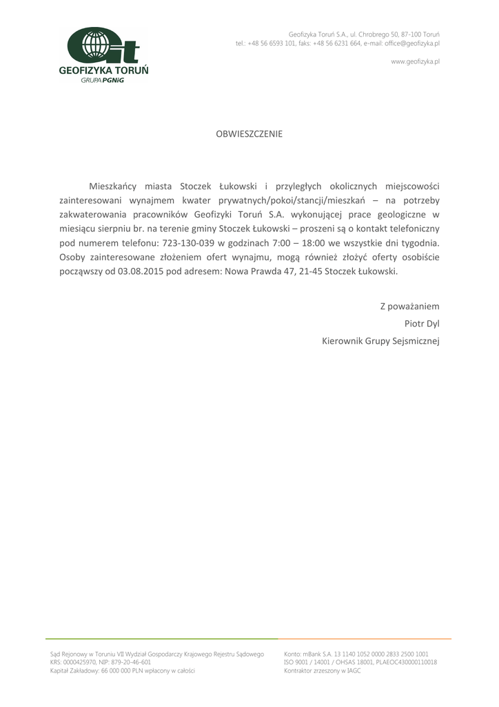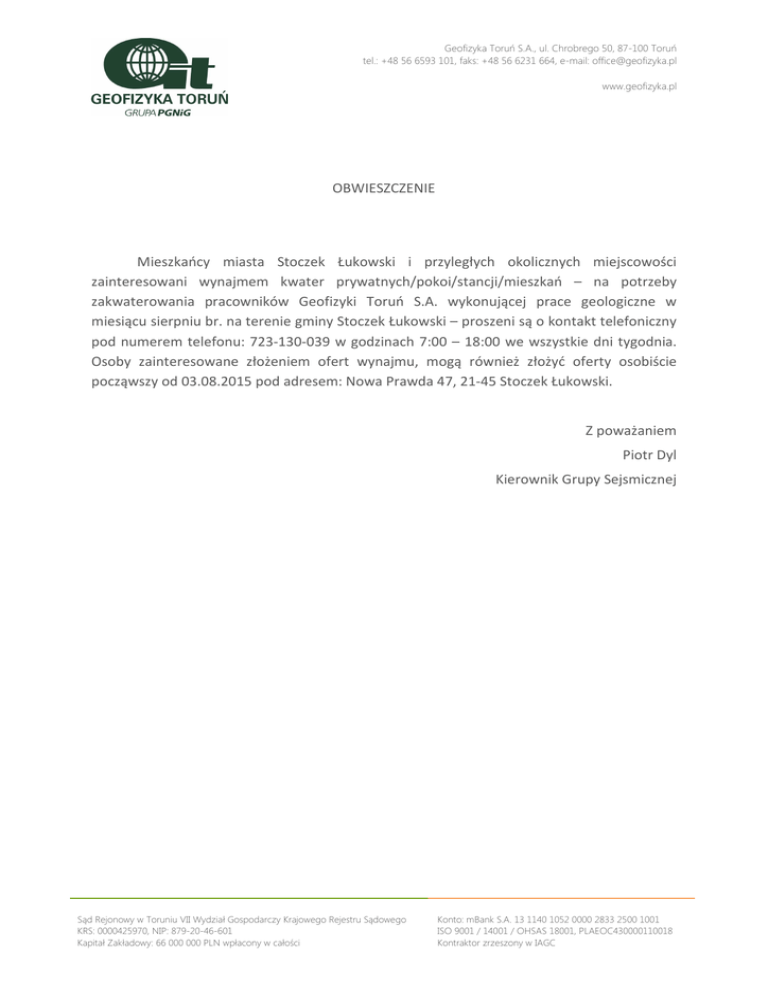 Geofizyka Toruń S.A., ul. Chrobrego 50, 87-100 Toruń tel.: +48 56 6593 101, faks: +48 56 6231 664, e-mail: [email protected] www.geofizyka.pl OBWIESZCZENIE Mieszkańcy miasta Stoczek Łukowski i przyległych okolicznych miejscowości zainteresowani wynajmem kwater prywatnych/pokoi/stancji/mieszkań – na potrzeby zakwaterowania pracowników Geofizyki Toruń S.A. wykonującej prace geologiczne w miesiącu sierpniu br. na terenie gminy Stoczek Łukowski – proszeni są o kontakt telefoniczny pod numerem telefonu: 723-130-039 w godzinach 7:00 – 18:00 we wszystkie dni tygodnia. Osoby zainteresowane złożeniem ofert wynajmu, mogą również złożyć oferty osobiście począwszy od 03.08.2015 pod adresem: Nowa Prawda 47, 21-45 Stoczek Łukowski. Z poważaniem Piotr Dyl Kierownik Grupy Sejsmicznej Sąd Rejonowy w Toruniu VII Wydział Gospodarczy Krajowego Rejestru Sądowego KRS: 0000425970, NIP: 879-20-46-601 Kapitał Zakładowy: 66 000 000 PLN wpłacony w całości Konto: mBank S.A. 13 1140 1052 0000 2833 2500 1001 ISO 9001 / 14001 / OHSAS 18001, PLAEOC430000110018 Kontraktor zrzeszony w IAGC