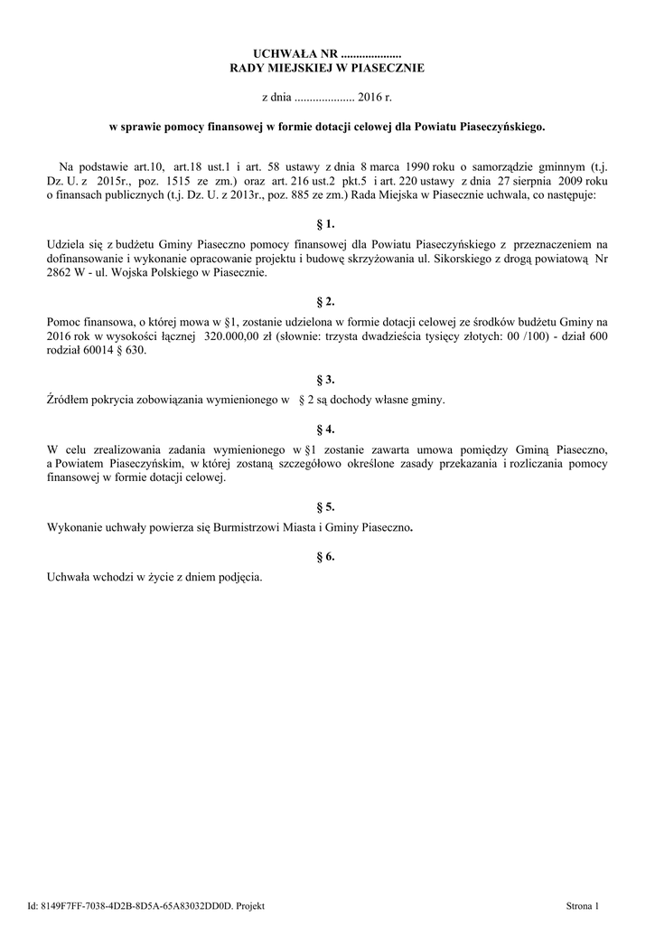 UCHWAŁA NR .................... RADY MIEJSKIEJ W PIASECZNIE z dnia .................... 2016 r. w sprawie pomocy finansowej w formie dotacji celowej dla Powiatu Piaseczyńskiego. Na podstawie art.10, art.18 ust.1 i art. 58 ustawy z dnia 8 marca 1990 roku o samorządzie gminnym (t.j. Dz. U. z 2015r., poz. 1515 ze zm.) oraz art. 216 ust.2 pkt.5 i art. 220 ustawy z dnia 27 sierpnia 2009 roku o finansach publicznych (t.j. Dz. U. z 2013r., poz. 885 ze zm.) Rada Miejska w Piasecznie uchwala, co następuje: § 1. Udziela się z budżetu Gminy Piaseczno pomocy finansowej dla Powiatu Piaseczyńskiego z przeznaczeniem na dofinansowanie i wykonanie opracowanie projektu i budowę skrzyżowania ul. Sikorskiego z drogą powiatową Nr 2862 W - ul. Wojska Polskiego w Piasecznie. § 2. Pomoc finansowa, o której mowa w §1, zostanie udzielona w formie dotacji celowej ze środków budżetu Gminy na 2016 rok w wysokości łącznej 320.000,00 zł (słownie: trzysta dwadzieścia tysięcy złotych: 00 /100) - dział 600 rodział 60014 § 630. § 3. Źródłem pokrycia zobowiązania wymienionego w § 2 są dochody własne gminy. § 4. W celu zrealizowania zadania wymienionego w §1 zostanie zawarta umowa pomiędzy Gminą Piaseczno, a Powiatem Piaseczyńskim, w której zostaną szczegółowo określone zasady przekazania i rozliczania pomocy finansowej w formie dotacji celowej. § 5. Wykonanie uchwały powierza się Burmistrzowi Miasta i Gminy Piaseczno. § 6. Uchwała wchodzi w życie z dniem podjęcia. Id: 8149F7FF-7038-4D2B-8D5A-65A83032DD0D. Projekt Strona 1 Uzasadnienie Z budżetu jednostek samorządu terytorialnego może być udzielona innym jednostkom samorządu terytorialnego pomoc finansowa w formie dotacji celowej lub pomoc rzeczowa. Pomoc finansowa w formie dotacji celowej dla Powiatu Piaseczyńskiego będzie udzielona z budżetu Gminy Piaseczno na rok 2016 z przeznaczeniem na dofinansowanie i wykonanie opracowanie projektu i budowę skrzyżowania ul. Sikorskiego z drogą powiatową - ul. Wojska Polskiego w Piasecznie. Powiat Piaseczyński w budżecie na 2016 rok posiada środki finansowe na przebudowę drogi powiatowej Nr 2862 W - ul. Wojska Polskiego w Piasecznie natomiast Gmina Piaseczno w budżecie na 2016 rok posiada środki finansowe na wykonanie projektu i budowę skrzyżowania ul. Sikorskiego z ul. Wojska Polskiego w Piasecznie. W związku z faktem, że Powiat będzie realizował przebudowę drogi 2862W, to w ramach tego zadania może zrelizować skrzyżowanie z ul. Sikorskiego jako zarządca drogi wyższej kategorii. Zatem zasadnym staje sie udzielenie pomocy finansowej Powiatowi Piaseczyńskiemu na wykonanie w/w zadania. Pozytywna decyzja Rady Miejskiej w Piasecznie w sprawie udzielenia pomocy Powiatowi Piaseczyńskiemu, pozwoli na podpisanie przez Burmistrza Miasta i Gminy Piaseczno stosownej umowy z Powiatem Piaseczyńskiemu w przedmiotowej sprawie. Id: 8149F7FF-7038-4D2B-8D5A-65A83032DD0D. Projekt Strona 2