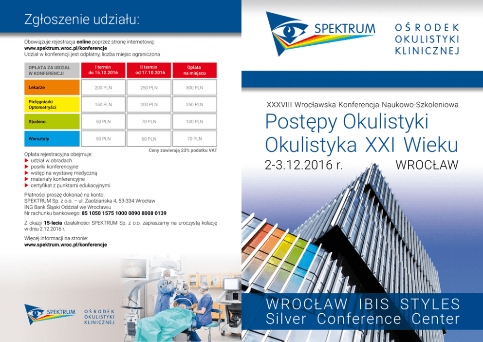 Zgłoszenie udziału: Obowiązuje rejestracja online poprzez stronę internetową: www.spektrum.wroc.pl/konferencje Udział w konferencji jest odpłatny, liczba miejsc ograniczona I termin do 16.10.2016 II termin od 17.10.2016 Opłata na miejscu Lekarze 200 PLN 250 PLN 300 PLN Pielęgniarki Optometryści 150 PLN 200 PLN 250 PLN Studenci 50 PLN 70 PLN 100 PLN Warsztaty 50 PLN 60 PLN 70 PLN OPŁATA ZA UDZIAŁ W KONFERENCJI Opłata rejestracyjna obejmuje: XX udział w obradach XX posiłki konferencyjne XX wstęp na wystawę medyczną XX materiały konferencyjne XX certyfikat z punktami edukacyjnymi Ceny zawierają 23% podatku VAT XXXVIII Wrocławska Konferencja Naukowo-Szkoleniowa Postępy Okulistyki Okulistyka XXI Wieku 2-3.12.2016 r. WROCŁAW Płatności proszę dokonać na konto: SPEKTRUM Sp. z o.o. – ul. Zaolziańska 4, 53-334 Wrocław ING Bank Śląski Oddział we Wrocławiu Nr rachunku bankowego: 85 1050 1575 1000 0090 8008 0139 Z okazji 15-lecia działalności SPEKTRUM Sp. z o.o. zapraszamy na uroczystą kolację w dniu 2.12.2016 r. Więcej informacji na stronie: www.spektrum.wroc.pl/konferencje W R O C Ł AW IB IS ST Y L E S Silver Conference Center Szanowni Państwo, Koleżanki i Koledzy! Serdecznie zapraszamy do udziału w XXXVIII Konferencji Naukowo-Szkoleniowej we Wrocławiu, która w tym roku będzie miała szczególny charakter związany z 15-leciem działalności Ośrodka Okulistyki Klinicznej SPEKTRUM. SESJA DLA OPTOMETRYSTÓW SESJA PIELĘGNIARSKA Dwudniowy program Konferencji „Postępy okulistyki. Okulistyka XXI wieku” organizowanej w dniach 2-3 grudnia 2016, obejmuje najnowsze trendy w rozwoju całego spektrum naszej specjalności przedstawiane w formie wykładów, kursów i warsztatów, prowadzonych zarówno przez współpracowników OOK SPEKTRUM, jak i przez zaproszonych wybitnych specjalistów. Tematy główne wykładów: XX Pomoce optyczne XX Dlaczego pacjent czuje się bezpieczny w Ośrodku Okulistyki Klinicznej SPEKTRUM Lokalizacja obrad w nowoczesnym Centrum Konferencyjnym, położonym w samym sercu miasta, pozwoli Państwu nie tylko wygodnie korzystać z bogatego programu Konferencji, ale także ułatwi poznawanie piękna Wrocławia i korzystanie z bogatej oferty Europejskiej Stolicy Kultury 2016 r. Do zobaczenia na XXXVIII Konferencji Naukowo-Szkoleniowej SPEKTRUM we Wrocławiu. XX Badanie refrakcji XX Soczewki kontaktowe XX Procedury diagnostyczne w badaniach klinicznych Kursy / Warsztaty: XX Badanie ostrości wzroku na foropterze XX Pomoce optyczne Tematy główne wykładów: XX Higiena brzegów powiek jako element przygotowania przed zabiegiem operacyjnym XX Urazy gałek ocznych u dzieci – rola pielęgniarki XX Higiena rąk jako podstawowa metoda zapobiegania zakażeniom szpitalnym XX Diagnostyka okulistyczna Prof. dr hab. Maria Hanna Niżankowska ze Współpracownikami TEMATY GŁÓWNE: KURSY / WARSZTATY: XX Laseroterapia XX Chirurgia refrakcyjna rogówki i soczewki XX USG oka XX Jaskra, małoinwazyjna chirurgia jaskry XX Diagnostyka i leczenie stożka rogówki XX Diagnostyka i leczenie chorób rogówki XX Zabiegi na drogach łzowych XX Postępy w chirurgii witreoretinalnej XX Foropter w praktyce okulisty XX Suche zwyrodnienie plamki związane z wiekiem XX Warsztaty prawnicze – leczenie okulistyczne w świetle paragrafu XX Nowe preparaty i wskazania do iniekcji doszklistkowych XX Komunikacja z Pacjentem XX Wybrane zagadnienia okulistyki dziecięcej XX Pozycja prawna pielęgniarek TERMIN: 2-3 grudnia 2016 r. MIEJSCE OBRAD: WROCŁAW IBIS STYLES Silver Conference Center ul. Plac Konstytucji 3 Maja nr 3 50-083 Wrocław ORGANIZATOR: Ośrodek Okulistyki Klinicznej SPEKTRUM ul. Zaolziańska 4, 53-334 Wrocław Biuro Zarządu / Sekretariat: 71 345 31 41 www.spektrum.wroc.pl InspireCongress Sp. z o.o. ul. Nowowiejska 38, 50-315 Wrocław tel.: +48 71 780 90 52 faks: +48 71 780 90 54 www.inspirecongress.pl BIURO ORGANIZATORA: