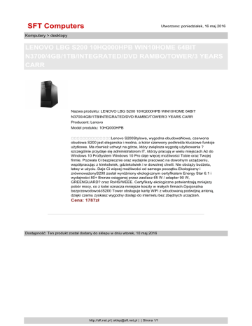 SFT Computers Utworzono: poniedziałek, 16 maj 2016 Komputery > desktopy LENOVO LBG S200 10HQ000HPB WIN10HOME 64BIT N3700/4GB/1TB/INTEGRATED/DVD RAMBO/TOWER/3 YEARS CARR Nazwa produktu: LENOVO LBG S200 10HQ000HPB WIN10HOME 64BIT N3700/4GB/1TB/INTEGRATED/DVD RAMBO/TOWER/3 YEARS CARR Producent: Lenovo Model produktu: 10HQ000HPB Lenovo S200Stylowa, wygodna obudowaNowa, czerwona obudowa S200 jest elegancka i modna, a kolor czerwony podkreśla kluczowe funkcje użytkowe. Ma również uchwyt na górze, który zwiększa wygodę użytkowania ? szczególnie przydaje się administratorom IT, którzy pracują w wielu miejscach.Aż do Windows 10 ProSystem Windows 10 Pro daje więcej możliwości Tobie oraz Twojej firmie. Pozwala Ci bezpiecznie oraz wydajnie pracować na dowolnym urządzeniu, współpracując z kimkolwiek, gdziekolwiek i w dowolnej chwili. Nie obciąży budżetu, łatwy w użyciu. Daje Ci więcej możliwości od samego początku.Ekologiczny i zrównoważonyS200 został wyróżniony ekologicznym certyfikatem Energy Star 6.1 i wydajności 80+ Bronze osiąganej przez zasilacz 65 W / adapter 90 W, GREENGUARD? oraz RoHS/WEEE. Certyfikaty ekologiczne potwierdzają mniejszy pobór mocy, co z kolei oznacza mniejsze koszty w małych firmach.Opcjonalna bezprzewodowośćS200 Tower obsługuje kartę WiFi z wbudowaną podwójną anteną, dzięki czemu zyskasz wygodny dostęp do internetu bez zbędnych urządzeń. Cena: 1787zł Dostępność: Ten produkt został dodany do sklepu w dniu wtorek, 10 maj 2016 http://sft.net.pl | [email protected] | | Strona 1/1
