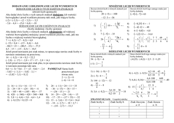 DODAWANIE I ODEJMOWANIE LICZB WYMIERNYCH DODAWANIE LICZB O TYCH SAMYCH ZNAKACH (dwóch liczb ujemnych) Aby dodać dwie liczby o tych samych znakach dodajemy ich wartości bezwzględne i przed wynikiem piszemy taki znak, jaki mają te liczby. (-2) + (-3,5) = - (2 + 3,5) = - 5,5 - 5,6 – 4,4 = - (5,6 + 4,4) = -10 DODAWANIE LICZB O RÓŻNYCH ZNAKACH (liczby dodatniej i liczby ujemnej) Aby dodać dwie liczby o różnych znakach, odejmujemy od większej wartości bezwzględnej mniejszą i przed wynikiem piszemy znak, jaki ma liczba o większej wartości bezwzględnej. 7 + (- 0,2) = (7 – 0,2) = 6,8 (- 15) + 8,4 = - (15 – 8,4) = - 6,6 - 80,5 + 23 = - (80,5 – 23) = - 57,5 4,5 – 15 = - (15 – 4,5) = - 10,5 Jeżeli przed nawiasem jest znak minus, to opuszczając nawias znak liczby w nawiasie zmieniamy na przeciwny. 14 – (- 8,2) = 14 + 8,2 = 22,2 (- 2,9) – (- 17) = - 2,9 + 17 = 17 – 2,9 = 14,1 Jeżeli przed nawiasem jest znak plus, to po opuszczeniu nawiasu znak liczby w nawiasie pozostaje taki sam. 0,6 + (- 3) = 0,6 – 3 = -(3 – 0,6) = - 2,4 PAMIĘTAJ! Suma liczb - 5,02 + (- 3,1) = - 5,02 – 3,1 = przeciwnych jest = - (5,02 + 3,1) = 8,12 równa zeru. 2 + (- 2) = 0 (- 6) + 6 = 0 1) 2) 3) 4) 5) 6) 16 + (- 11) = 16 – 11 = 5 - 24 + 18 = - (24 – 18) = - 6 - 105 + 48 =- (105 – 48) = - 57 428 – (- 540) = 428 + 540 = 968 5,8 + (- 4,4) = 5,8 – 4,4 = 1,4 (- 0,125) + 0,125 = 0 24 – (- 11) = 24 + 11 = 35 - 36 – (- 15) = - 36 + 15 = = - (36 – 15 ) = - 21 9) 14 – 29 = - (29 – 14) = - 15 10) - 17 – 35 = - (17 + 35) = - 52 11) 13 – (- 3,4) = 13 +3,4 = 16,4 12) - 18 – (- 2,7) = - 18 + 2,7 = = - (18 – 2,7) = - 15,3 7) 8) MNOŻENIE LICZB WYMIERNYCH Iloczyn dwóch liczb o różnych znakach jest liczbą ujemną. Iloczyn dwóch liczb tego samego znaku jest liczbą dodatnią. 9 7 63 20 (5) 100 12 3 36 1 105 1 10 21 2 5 7 5 - 35 1) 2) 4) 5) 6) 7) 0,25 4 - 1 4 12 - 48 6 0,8 - 4,8 1,2 12 - 14,4 13 1 26 1 1 7 7 49 1 1 26 8) 8 3 2 = 42 6 2 3 2 3 6 4 1 13 3 =-6 9) 0 0 2 2 5 DZIELENIE LICZB WYMIERNYCH 3) Iloraz dwóch liczb o różnych znakach jest liczbą ujemną. 54 : (- 9) = -6 1 (-1) : 2 = 2 Iloraz dwóch liczb tego samego znaku jest liczbą dodatnią. (-0,25) : (-0,2) = 2,5 : 2 =1,25 1) (- 16) : (- 8) = 2 2 4,2 10 42 6) (- 4,2) : (- 0,5)= =8 5 5 0,5 10 5 2) (- 5) : 6 = 6 6,4 100 640 7) 6,4:(- 0,16)= == -40 3) 144 : (- 12) = - 12 16 0,16 100 32 4) -8 15 9 1 8) 15 : 2 : = 4 1 4 4 3,6 10 36 5 5) 3,6 : (- 0,2) = = 18 15 4 20 2 0,2 10 2 ===-6 1 93 3 3 SPRAWDŹ SIĘ SAM: Uzupełnij tabelkę: Znak liczby a + + - Znak liczby b + + Znak iloczynu a b Znak ilorazu a:b