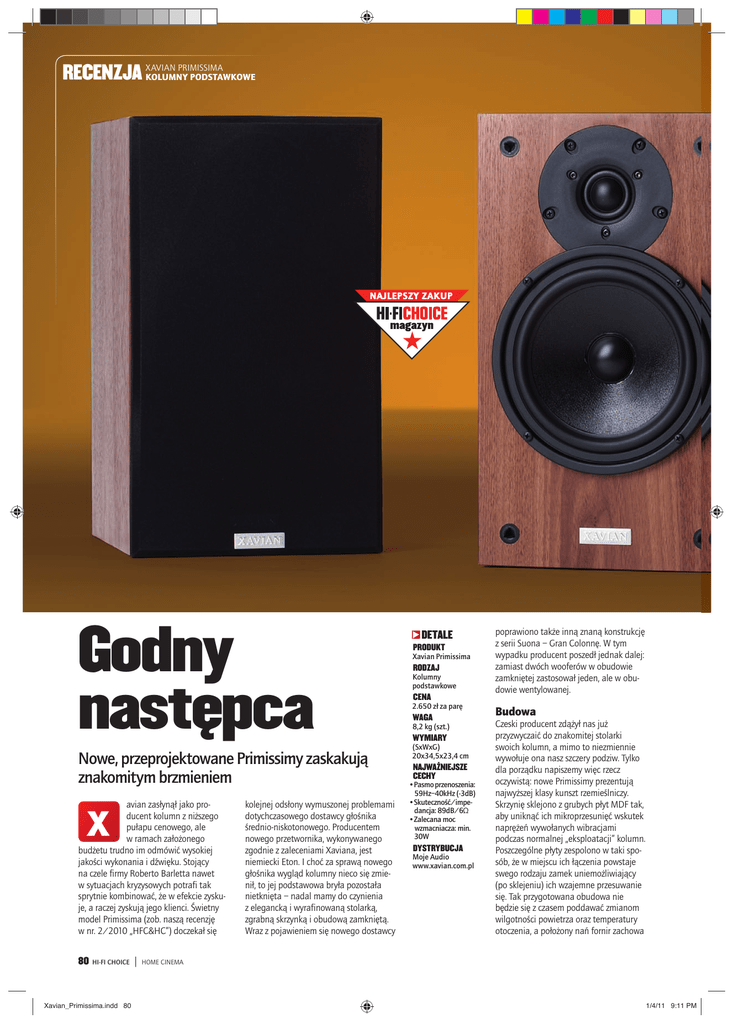 PRIMISSIMA RECENZJA XAVIAN KOLUMNY PODSTAWKOWE Godny następca Nowe, przeprojektowane Primissimy zaskakują znakomitym brzmieniem avian zasłynął jako producent kolumn z niższego pułapu cenowego, ale w ramach założonego budżetu trudno im odmówić wysokiej jakości wykonania i dźwięku. Stojący na czele firmy Roberto Barletta nawet w sytuacjach kryzysowych potrafi tak sprytnie kombinować, że w efekcie zyskuje, a raczej zyskują jego klienci. Świetny model Primissima (zob. naszą recenzję w nr. 2/2010 „HFC&HC”) doczekał się X 80 HI-FI CHOICE Xavian_Primissima.indd 80 | kolejnej odsłony wymuszonej problemami dotychczasowego dostawcy głośnika średnio-niskotonowego. Producentem nowego przetwornika, wykonywanego zgodnie z zaleceniami Xaviana, jest niemiecki Eton. I choć za sprawą nowego głośnika wygląd kolumny nieco się zmienił, to jej podstawowa bryła pozostała nietknięta – nadal mamy do czynienia z elegancką i wyrafinowaną stolarką, zgrabną skrzynką i obudową zamkniętą. Wraz z pojawieniem się nowego dostawcy DETALE PRODUKT Xavian Primissima RODZAJ Kolumny podstawkowe CENA 2.650 zł za parę WAGA 8,2 kg (szt.) WYMIARY (SxWxG) 20x34,5x23,4 cm NAJWAŻNIEJSZE CECHY •Pasmo przenoszenia: 59Hz–40kHz (-3dB) •Skuteczność/impedancja: 89dB/6Ω •Zalecana moc wzmacniacza: min. 30W DYSTRYBUCJA Moje Audio www.xavian.com.pl poprawiono także inną znaną konstrukcję z serii Suona – Gran Colonnę. W tym wypadku producent poszedł jednak dalej: zamiast dwóch wooferów w obudowie zamkniętej zastosował jeden, ale w obudowie wentylowanej. Budowa Czeski producent zdążył nas już przyzwyczaić do znakomitej stolarki swoich kolumn, a mimo to niezmiennie wywołuje ona nasz szczery podziw. Tylko dla porządku napiszemy więc rzecz oczywistą: nowe Primissimy prezentują najwyższej klasy kunszt rzemieślniczy. Skrzynię sklejono z grubych płyt MDF tak, aby uniknąć ich mikroprzesunięć wskutek naprężeń wywołanych wibracjami podczas normalnej „eksploatacji” kolumn. Poszczególne płyty zespolono w taki sposób, że w miejscu ich łączenia powstaje swego rodzaju zamek uniemożliwiający (po sklejeniu) ich wzajemne przesuwanie się. Tak przygotowana obudowa nie będzie się z czasem poddawać zmianom wilgotności powietrza oraz temperatury otoczenia, a położony nań fornir zachowa HOME CINEMA 1/4/11 9:11 PM XAVIAN PRIMISSIMA KOLUMNY PODSTAWKOWE Przeprojektowana zwrotnica wykorzystuje tzw. filtry progresywne o ściśle kształtowanej charakterystyce opadania aż do momentu przejścia sygnału z jednego przetwornika do drugiego, dzięki czemu obydwa głośniki pracują w dokładnie określonych punktach podziału bez nadmiernych zniekształceń. To według konstruktora pozwala uzyskać czystszą reprodukcję sceny dźwiękowej, a więc wierniejszą kreację wrażeń przestrzennych. Jakość dźwięku idealny wzór i będzie dobrze „trzymał” na wszystkich krawędziach skrzynek. Do wyboru mamy kilka wariantów wykończenia: wiśnia, dąb czy orzech, a także (na zamówienie) ekskluzywne wersje bianco i nero. Wnętrze wytłumiono gąbką pokrywającą każdą ze ścianek, a pod koszami głośników umieszczono specjalne podkładki pochłaniające drgania. Jak już wspomnieliśmy, w torze nisko-średniotonowym pracuje teraz wyprodukowany przez Etona 175mm woofer – jest to celulozowa konstrukcja oparta na blaszanym tłoczonym koszu ze specjalnymi otworami wentylacyjnymi pod dolnym resorem oraz miękką nakładką w centrum. Membrana jest impregnowana substancją usztywniającą. Z kolei tor wysokotonowy obsługuje znana z poprzedniej wersji, miękka 25mm tekstylna kopułka produkcji Vify/ Scan-Speaka. Nowy przetwornik stożkowy pracuje bardziej liniowo przy wyższym podziale częstotliwości, toteż konstruktor zdecydował się na filtr dzielący pasmo między głośnikami przy 2,6kHz, a więc znacznie wyżej niż poprzednio (1,9kHz). Te średniej wielkości monitory w obudowach zamkniętych są nieco łatwiejsze do napędzenia od swoich poprzedników. Choć różnice są niewielkie, to jednak zasilając nowe Primissimy włoskim wzmacniaczem Goldenote S1, odczuliśmy większą rezerwę zarówno w przetwarzaniu basu, jak i dynamice w obydwu kluczowych skalach. Nieco przyciemniona średnica odrobinę się otworzyła. Kulturalne brzmienie pozostało, co oznacza, że w całym paśmie dźwięk jest trzymany w ryzach i nie cechuje go nonszalancja, a mimo to jest całkiem żywiołowy. Nowe konstrukcje docenią przede wszystkim osoby o wyrobionym guście muzycznym, ale zachęcamy do ich wypróbowania również tych, którzy dopiero zaczynają przygodę z audio – jest to znakomita okazja do zaopatrzenia się od razu w wyjątkowe monitory. Nowe Primissimy są przede wszystkim rzetelne, wierne (w sensie przenoszenia dźwięku) i naturalne, a jednocześnie niepozbawione takich przyjemnych cech, jak delikatna subtelność w zakresie wysokich tonów czy gładkość w średnicy, dzięki czemu wokale są otwarte i nie czuje się nadmiernego zafałszowania ich barwy. Primissimy nie są jednak demonami basu, zresztą trudno byłoby je o to posądzać – nie dość, że są niewielkie, to jeszcze zastosowano obudowy zamknięte. Jednak poduszka powietrzna, na której pracuje membrana woofera, ma swoje zalety – po pierwsze tego typu konstrukcja błyskawicznie GORĄCY TEMAT Z bas-refleksem czy bez? Roberto Barletta w przypadku modelu Primissima zdecydował się na obudowę zamkniętą. Dzięki temu przyszły użytkownik tych niewielkich kolumn będzie mógł ustawić je blisko ścian bez obawy o dudnienie i buczenie basu. W przypadku zespołów głośnikowych wyposażonych w tunel rezonansowy, kwestia zachowania właściwych odległości kolumn od ścian jest bardzo ważna. Poprzez dosuwanie ich do ścian fale niskich tonów mogą wzbudzać się w różnych zakresach basu, co czasami jest wskazane jeśli zachodzi potrzeba na bardziej dobitny przekaz dolnego re
