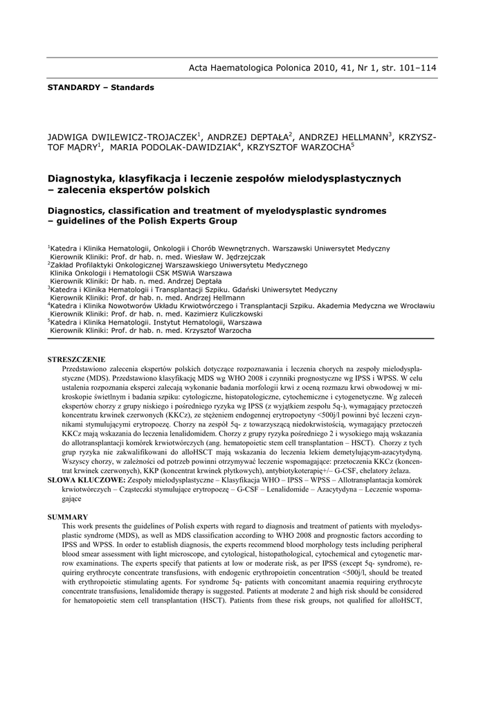 Acta Haematologica Polonica 2010, 41, Nr 1, str. 101–114 STANDARDY – Standards JADWIGA DWILEWICZ-TROJACZEK1, ANDRZEJ DEPTAŁA2, ANDRZEJ HELLMANN3, KRZYSZTOF MĄDRY1, MARIA PODOLAK-DAWIDZIAK4, KRZYSZTOF WARZOCHA5 Diagnostyka, klasyfikacja i leczenie zespołów mielodysplastycznych – zalecenia ekspertów polskich Diagnostics, classification and treatment of myelodysplastic syndromes – guidelines of the Polish Experts Group 1 Katedra i Klinika Hematologii, Onkologii i Chorób Wewnętrznych. Warszawski Uniwersytet Medyczny Kierownik Kliniki: Prof. dr hab. n. med. Wiesław W. Jędrzejczak 2 Zakład Profilaktyki Onkologicznej Warszawskiego Uniwersytetu Medycznego Klinika Onkologii i Hematologii CSK MSWiA Warszawa Kierownik Kliniki: Dr hab. n. med. Andrzej Deptała 3 Katedra i Klinika Hematologii i Transplantacji Szpiku. Gdański Uniwersytet Medyczny Kierownik Kliniki: Prof. dr hab. n. med. Andrzej Hellmann 4 Katedra i Klinika Nowotworów Układu Krwiotwórczego i Transplantacji Szpiku. Akademia Medyczna we Wrocławiu Kierownik Kliniki: Prof. dr hab. n. med. Kazimierz Kuliczkowski 5 Katedra i Klinika Hematologii. Instytut Hematologii, Warszawa Kierownik Kliniki: Prof. dr hab. n. med. Krzysztof Warzocha STRESZCZENIE Przedstawiono zalecenia ekspertów polskich dotyczące rozpoznawania i leczenia chorych na zespoły mielodysplastyczne (MDS). Przedstawiono klasyfikację MDS wg WHO 2008 i czynniki prognostyczne wg IPSS i WPSS. W celu ustalenia rozpoznania eksperci zalecają wykonanie badania morfologii krwi z oceną rozmazu krwi obwodowej w mikroskopie świetlnym i badania szpiku: cytologiczne, histopatologiczne, cytochemiczne i cytogenetyczne. Wg zaleceń ekspertów chorzy z grupy niskiego i pośredniego ryzyka wg IPSS (z wyjątkiem zespołu 5q-), wymagający przetoczeń koncentratu krwinek czerwonych (KKCz), ze stęŜeniem endogennej erytropoetyny <500j/l powinni być leczeni czynnikami stymulującymi erytropoezę. Chorzy na zespół 5q- z towarzyszącą niedokrwistością, wymagający przetoczeń KKCz mają wskazania do leczenia lenalidomidem. Chorzy z grupy ryzyka pośredniego 2 i wysokiego mają wskazania do allotransplantacji komórek krwiotwórczych (ang. hematopoietic stem cell transplantation – HSCT). Chorzy z tych grup ryzyka nie zakwalifikowani do alloHSCT mają wskazania do leczenia lekiem demetylującym-azacytydyną. Wszyscy chorzy, w zaleŜności od potrzeb powinni otrzymywać leczenie wspomagające: przetoczenia KKCz (koncentrat krwinek czerwonych), KKP (koncentrat krwinek płytkowych), antybiotykoterapię+/– G-CSF, chelatory Ŝelaza. SŁOWA KLUCZOWE: Zespoły mielodysplastyczne – Klasyfikacja WHO – IPSS – WPSS – Allotransplantacja komórek krwiotwórczych – Cząsteczki stymulujące erytropoezę – G-CSF – Lenalidomide – Azacytydyna – Leczenie wspomagające SUMMARY This work presents the guidelines of Polish experts with regard to diagnosis and treatment of patients with myelodysplastic syndrome (MDS), as well as MDS classification according to WHO 2008 and prognostic factors according to IPSS and WPSS. In order to establish diagnosis, the experts recommend blood morphology tests including peripheral blood smear assessment with light microscope, and cytological, histopathological, cytochemical and cytogenetic marrow examinations. The experts specify that patients at low or moderate risk, as per IPSS (except 5q- syndrome), requiring erythrocyte concentrate transfusions, with endogenic erythropoietin concentration <500j/l, should be treated with erythropoietic stimulating agents. For syndrome 5q- patients with concomitant anaemia requiring erythrocyte concentrate transfusions, lenalidomide therapy is suggested. Patients at moderate 2 and high risk should be considered for hematopoietic stem cell transplantation (HSCT). Patients from these risk groups, not qualified for alloHSCT, J. DWILEWICZ-TROJACZEK i wsp. 102 should receive a demetylating drug – azacitidine. In all patients, supportive treatment should be instituted as needed: erythrocyte concentrate transfusion, platelet concentrate, antibiotic therapy +/– G-CSF, iron chelators. KEY WORDS: Myelodysplastic syndromes – Classification WHO – IPSS – WPSS – Allohematopoietic stem cell transplantation – Erythropoietic stimulating agents (ESA) – G-CSF – Lenalidomide – Azacitidine – Supportive care WSTĘP Zespoły mielodysplastyczne (MDS) są heterogenną grupą klonalnych chorób komórki macierzystej hematopoezy charakteryzujących się nieefektywną hematopoezą, czyli nieprawidłowym róŜnicowaniem i dojrzewaniem komórek szpiku (jednej lub kilku linii komórkowych), cytopeniami krwi obwodowej oraz zwiększonym ryzykiem rozwoju ostrej białaczki szpikowej (OBSZ). Biorąc pod uwagę etiologię MDS naleŜy wyróŜnić pierwotny MDS oraz wtórny – poprzedzony znanym mutagennym czynnikiem (najczęściej chemioterapią lub radioterapią – therapy related MDS, tMDS). Cytostatyki, które najczęściej są odpowiedzialne za tMDS to leki alkilujące i inhibitory topoizomerazy II. Częstość zachorowań na MDS wynosi 4 przypadki/100 000/rok. U osób powyŜej 60–70 r.Ŝ. częstość zachorowań wzrasta i wynosi 15–50/100 000/rok. Mediana wieku zachorowań na zespoły mielodysplastyczne wynosi 60–70 lat. 80% wszystkich MDS rozwija się u osób >60 r. Ŝ. Na tMDS chorują ludzie młodsi o 10 lat w porównaniu z chorującymi na zespoły pierwotne. Kryteria rozpoznania MDS Ustalenie rozpoznania MDS nierzadko jest trudne i wymaga wykluczenia innych jednostek chorobowych. W tabeli 1 przedstawiono minimalne kryteria rozpoznania MDS. Dla rozpoznania MDS niezbędne jest spełnienie obydwu kryteriów wstępnych oraz co najmniej jednego z kryteriów swoistych dla MDS [1]. W tabeli 2 przedstawiono najbardziej charakterystyczne cechy dysplazji poszczególnych linii komórkowych. Tabela 1. Mninimalne kryteria rozpoznania MDS Table 1. Minimal diagnostic criteria in MDS A. B. C. Kryteria wstępne 1. Ut