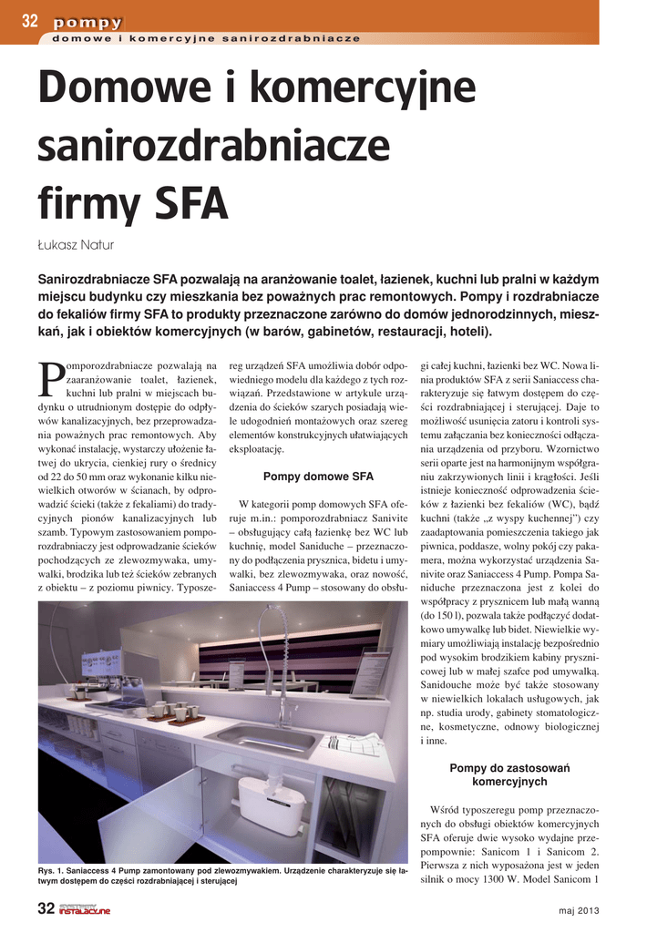 32 domowe i komercyjne sanirozdrabniacze Domowe i komercyjne sanirozdrabniacze firmy SFA Łukasz Natur Sanirozdrabniacze SFA pozwalajπ na aranøowanie toalet, ≥azienek, kuchni lub pralni w kaødym miejscu budynku czy mieszkania bez powaønych prac remontowych. Pompy i rozdrabniacze do fekaliÛw firmy SFA to produkty przeznaczone zarÛwno do domÛw jednorodzinnych, mieszkaÒ, jak i obiektÛw komercyjnych (w barÛw, gabinetÛw, restauracji, hoteli). P omporozdrabniacze pozwalajπ na zaaranøowanie toalet, ≥azienek, kuchni lub pralni w miejscach budynku o utrudnionym dostÍpie do odp≥ywÛw kanalizacyjnych, bez przeprowadzania powaønych prac remontowych. Aby wykonaÊ instalacjÍ, wystarczy u≥oøenie ≥atwej do ukrycia, cienkiej rury o úrednicy od 22 do 50 mm oraz wykonanie kilku niewielkich otworÛw w úcianach, by odprowadziÊ úcieki (takøe z fekaliami) do tradycyjnych pionÛw kanalizacyjnych lub szamb. Typowym zastosowaniem pomporozdrabniaczy jest odprowadzanie úciekÛw pochodzπcych ze zlewozmywaka, umywalki, brodzika lub teø úciekÛw zebranych z obiektu ñ z poziomu piwnicy. Typosze- reg urzπdzeÒ SFA umoøliwia dobÛr odpowiedniego modelu dla kaødego z tych rozwiπzaÒ. Przedstawione w artykule urzπdzenia do úciekÛw szarych posiadajπ wiele udogodnieÒ montaøowych oraz szereg elementÛw konstrukcyjnych u≥atwiajπcych eksploatacjÍ. Pompy domowe SFA W kategorii pomp domowych SFA oferuje m.in.: pomporozdrabniacz Sanivite ñ obs≥ugujπcy ca≥π ≥azienkÍ bez WC lub kuchniÍ, model Saniduche ñ przeznaczony do pod≥πczenia prysznica, bidetu i umywalki, bez zlewozmywaka, oraz nowoúÊ, Saniaccess 4 Pump ñ stosowany do obs≥u- gi ca≥ej kuchni, ≥azienki bez WC. Nowa linia produktÛw SFA z serii Saniaccess charakteryzuje siÍ ≥atwym dostÍpem do czÍúci rozdrabniajπcej i sterujπcej. Daje to moøliwoúÊ usuniÍcia zatoru i kontroli systemu za≥πczania bez koniecznoúci od≥πczania urzπdzenia od przyboru. Wzornictwo serii oparte jest na harmonijnym wspÛ≥graniu zakrzywionych linii i krπg≥oúci. Jeúli istnieje koniecznoúÊ odprowadzenia úciekÛw z ≥azienki bez fekaliÛw (WC), bπdü kuchni (takøe Ñz wyspy kuchennejî) czy zaadaptowania pomieszczenia takiego jak piwnica, poddasze, wolny pokÛj czy pakamera, moøna wykorzystaÊ urzπdzenia Sanivite oraz Saniaccess 4 Pump. Pompa Saniduche przeznaczona jest z kolei do wspÛ≥pracy z prysznicem lub ma≥π wannπ (do 150 l), pozwala takøe pod≥πczyÊ dodatkowo umywalkÍ lub bidet. Niewielkie wymiary umoøliwiajπ instalacjÍ bezpoúrednio pod wysokim brodzikiem kabiny prysznicowej lub w ma≥ej szafce pod umywalkπ. Sanidouche moøe byÊ takøe stosowany w niewielkich lokalach us≥ugowych, jak np. studia urody, gabinety stomatologiczne, kosmetyczne, odnowy biologicznej i inne. Pompy do zastosowaÒ komercyjnych Rys. 1. Saniaccess 4 Pump zamontowany pod zlewozmywakiem. Urzπdzenie charakteryzuje siÍ ≥atwym dostÍpem do czÍúci rozdrabniajπcej i sterujπcej 32 WúrÛd typoszeregu pomp przeznaczonych do obs≥ugi obiektÛw komercyjnych SFA oferuje dwie wysoko wydajne przepompownie: Sanicom 1 i Sanicom 2. Pierwsza z nich wyposaøona jest w jeden silnik o mocy 1300 W. Model Sanicom 1 maj 2013 33 domowe i komercyjne sanirozdrabniacze Rys. 2. Pompa Saniduche przeznaczona jest do wspÛ≥pracy z prysznicem lub ma≥π wannπ moøe przepompowaÊ úcieki na wysokoúÊ 10 m oraz przetransportowaÊ je na odleg≥oúÊ 100 m w poziomie. DziÍki duøej wydajnoúci urzπdzenie bez problemu moøe usuwaÊ úcieki z restauracji, barÛw i innych miejsc publicznych. Model posiada dodatkowo moøliwoúÊ pod≥πczenia zewnÍtrznego alarmu (úwiat≥o, sygnalizator düwiÍkowy). System alarmowy ma za zadanie informowaÊ uøytkownika o ciπg≥ej pracy silnika (czas d≥uøszy niø 5 minut) i zapobiegaÊ w ten sposÛb uszkodzeniu urzπdzenia, informujπc o nieprawid≥owym dzia≥aniu pompy. Model Sanicom 1 nadaje siÍ do montaøu w obiektach przemys≥owych, gdzie trzeba przepompowaÊ duøe iloúci wody na dalsze odleg≥oúci. W przypadku zapotrzebowania na wiÍkszπ moc SFA oferuje wersjÍ Sanicom 2. Pompa ta wyposaøona jest w dwa silniki o duøej mocy ñ kaødy po 1500 W. Pozwala to odprowadziÊ Ñbrudnπ wodÍî na maksymalnπ wysokoúÊ 11 m w pionie i na odleg≥oúÊ 110 m w poziomie. Urzπdzenie ma cztery wejúcia, 40 mm lub 50 mm, oraz odprowadzenie do kanalizacji rurπ o úrednicy 50 mm. WydajnoúÊ dwÛch pomp to oko≥o 340 l/min. Pozwala to przepompowaÊ úcieki z terenÛw przemys≥owych bπdü z duøych obiektÛw gastronomicznych, gdzie pod≥πczonych jest wiele punktÛw odbiorczych: zlewozmywakÛw, zmywarek, lodÛwek ch≥odniczych itd. SFA posiada rÛwnieø w swojej ofercie urzπdzenia przeznaczone do obiektÛw ko- mercyjnych z moøliwoúciπ rozdrabniania i przepompowywania úciekÛw fekalnych, takie jak pomporozdrabniacze z serii Sanicubic. Informacje dodatkowe Szeroka gama produktÛw zapewnia moøliwoúÊ doboru odpowiedniego urzπdzenia w zaleønoúci od potrzeby oraz moøliwoúci adaptacyjnych danego obiektu. Firma oferuje bezp≥atne doradztwo w zakresie projektowania i przerÛbek instalacji. Dodatkowo dostÍpne sπ bezp≥atne aplikacje na smartfony (system Android i iOS) pozwalajπce w ≥atwy sposÛb dobraÊ odpowiedni produkt. RozwiniÍta sieÊ serwisowa w ca≥ym kraju zapewnia szybkπ reakcjÍ w przypadku awarii ñ serwisanci dojeødøajπ do miejsca zamontowania urzπdzenia. £ukasz Natur Autor jest pracownikiem firmy SFA SFA Poland Sp. z o.o 05-092 £omianki/Warszawa ul.Kolejowa 33 tel. (22) 732 00 31 fax (22) 751 35 16 Rys. 3. Model Sanicom 1 posiada silnik o mocy 1300 W. Bez problemu moøe usuwaÊ úcieki z restauracji, barÛw i innych miejsc publicznych e-mail: [email protected] www.sfapoland.pl 33