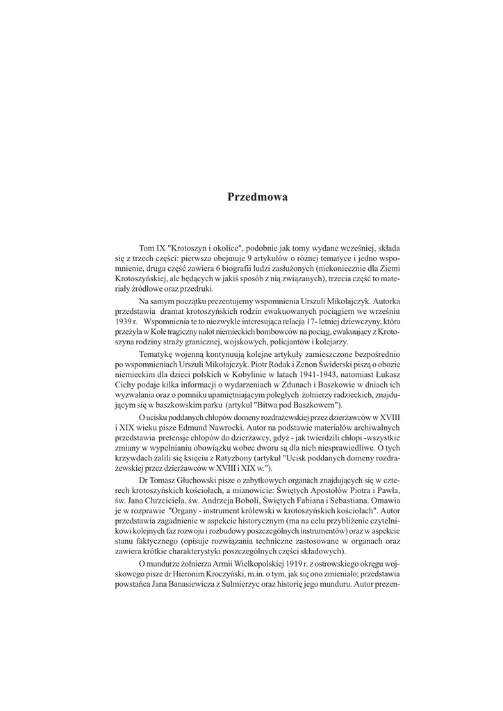 Przedmowa009 Przedmowa Tom IX "Krotoszyn i okolice", podobnie jak tomy wydane wczeniej, sk³ada siê z trzech czêci: pierwsza obejmuje 9 artyku³ów o ró¿nej tematyce i jedno wspomnienie, druga czêæ zawiera 6 biografii ludzi zas³u¿onych (niekoniecznie dla Ziemi Krotoszyñskiej, ale bêd¹cych w jaki sposób z ni¹ zwi¹zanych), trzecia czêæ to materia³y ród³owe oraz przedruki. Na samym pocz¹tku prezentujemy wspomnienia Urszuli Miko³ajczyk. Autorka przedstawia dramat krotoszyñskich rodzin ewakuowanych poci¹giem we wrzeniu 1939 r. Wspomnienia te to niezwykle interesuj¹ca relacja 17- letniej dziewczyny, która prze¿y³a w Kole tragiczny nalot niemieckich bombowców na poci¹g, ewakuuj¹cy z Krotoszyna rodziny stra¿y granicznej, wojskowych, policjantów i kolejarzy. Tematykê wojenn¹ kontynuuj¹ kolejne artyku³y zamieszczone bezporednio po wspomnieniach Urszuli Miko³ajczyk. Piotr Rodak i Zenon widerski pisz¹ o obozie niemieckim dla dzieci polskich w Kobylinie w latach 1941-1943, natomiast £ukasz Cichy podaje kilka informacji o wydarzeniach w Zdunach i Baszkowie w dniach ich wyzwalania oraz o pomniku upamiêtniaj¹cym poleg³ych ¿o³nierzy radzieckich, znajduj¹cym siê w baszkowskim parku (artyku³ "Bitwa pod Baszkowem"). O ucisku poddanych ch³opów domeny rozdra¿ewskiej przez dzier¿awców w XVIII i XIX wieku pisze Edmund Nawrocki. Autor na podstawie materia³ów archiwalnych przedstawia pretensje ch³opów do dzier¿awcy, gdy¿ - jak twierdzili ch³opi -wszystkie zmiany w wype³nianiu obowi¹zku wobec dworu s¹ dla nich niesprawiedliwe. O tych krzywdach ¿alili siê ksiêciu z Ratyzbony (artyku³ "Ucisk poddanych domeny rozdra¿ewskiej przez dzier¿awców w XVIII i XIX w."). Dr Tomasz G³uchowski pisze o zabytkowych organach znajduj¹cych siê w czterech krotoszyñskich kocio³ach, a mianowicie: wiêtych Aposto³ów Piotra i Paw³a, w. Jana Chrzciciela, w. Andrzeja Boboli, wiêtych Fabiana i Sebastiana. Omawia je w rozprawie "Organy - instrument królewski w krotoszyñskich kocio³ach". Autor przedstawia zagadnienie w aspekcie historycznym (ma na celu przybli¿enie czytelnikowi kolejnych faz rozwoju i rozbudowy poszczególnych instrumentów) oraz w aspekcie stanu faktycznego (opisuje rozwi¹zania techniczne zastosowane w organach oraz zawiera krótkie charakterystyki poszczególnych czêci sk³adowych). O mundurze ¿o³nierza Armii Wielkopolskiej 1919 r. z ostrowskiego okrêgu wojskowego pisze dr Hieronim Kroczyñski, m.in. o tym, jak siê ono zmienia³o; przedstawia powstañca Jana Banasiewicza z Sulmierzyc oraz historiê jego munduru. Autor prezen- 10000Przedmowa tuje zestaw ubioru, tak¿e oporz¹dzenia i uzbrojenia, który jest - jak okrela autor "unikatowy w muzealnictwie polskim" (artyku³ "Mundur ¿o³nierza Armii Wielkopolskiej 1919 r. z ostrowskiego okrêgu wojskowego"). Wiedzê o wydarzeniach z ostatnich lat miêdzywojnia wzbogaca artyku³ Jana Grzywaczewskiego zatytu³owany "Obóz Zjednoczenia Narodowego w powiecie krotoszyñskim 1937-1939".Autor informuje czytelnika o Obozie Zjednoczenia Narodowego - politycznej organizacji sanacyjnej prawicy i o niektórych wydarzeniach w powiecie krotoszyñskim tu¿ przed wybuchem II wojny wiatowej. Artyku³ Zenona widerskiego "Amatorskie przedstawienia teatralne w Kobylinie" pokazuje szeroko rozwiniêty ruch teatralny w tym miecie w okresie II Rzeczpospolitej oraz w Polsce Ludowej do lat siedemdziesi¹tych, organizowany przez stowarzyszenia i organizacje spo³eczne. O dawnych nazwach lasów i pól w Sulmierzycach, które funkcjonowa³y - byæ mo¿e - przez kilka wieków, a obecnie wielu mieszkañcom s¹ nieznane, pisze Stanis³aw Gierszewicz, zapewne ratuj¹c je w ten sposób przed ca³kowitym wymarciem (artyku³ "Dawne nazwy lasów i pól w Sulmierzycach"). Dzia³ pierwszy zamyka artyku³ Grzegorza nieciñskiego pt. "Dzia³alnoæ Towarzystwa Mi³oników i Badaczy Ziemi Krotoszyñskiej w latach 2009-2013", napisany z okazji 20-lecia Towarzystwa. (Dzia³alnoæ Towarzystwa w latach 1993-2009 G. niecinski przedstawi³ w tomie V, 2009). W czêci drugiej prezentujemy biografie 6 osób (w kolejnoci alfabetycznej). S¹ to: pu³kownik Jan Budziszowski (1786-1854), [tekst ten jest uzupe³nieniem biografii opublikowanej w tomie VIII], Franciszek Che³kowski (1830-1893), ksi¹dz Onufry Jaworski (1855-1916), ksi¹dz Antoni Stanis³aw Kinowski (1847-1923), Wojciech Kozal (1891-1920) i Leon Pi¹tek (1912-1978). Autorami biografii s¹: £ukasz Cichy, ks. Alojzy Piszczek, Zenon widerski, Andrzej Retig i Stanis³aw Gierszewicz. W czêci trzeciej zamieszczamy 5 materia³ów, z których 2 najstarsze to: Wyimki z podró¿y malowniczej po Wielkiej - Polsce. Krotoszyn. Kobylin. "Przyjaciel Ludu", nry 43 i 44, rok 1838 (opracowa³ Seweryn Grobelny) oraz fragmenty Dziennika Urzêdowego Królewskiej Rejencji w Poznaniu za rok 1842 (wyjête fragmenty dotycz¹ powiatu krotoszyñskiego, opracowa³ Józef Zdunek). Kolejnym publikowanym materia³em ród³owym jest konspiracyjne pismo "Akacje" - Biuletyn Kompanii Rycerskiej Armii Krajowej nr 1 z dnia 21 maja 1945 r. Pismo przeciwstawia³o siê bolszewizacji Polski. Ukaza³o siê prawdopodobnie 8 numerów (opracowa³a Izabela nieciñska). W tym dziale zamiecilimy te¿ "Protokó³ z zebrania pracowników firmy Tartak Pañstwowy i Obróbka Drewna w Krotoszynie" z dnia 3 padziernika 1945 r.; dokument ten informuje o sprawach personalnych kierownictwa zak³adu w 1945 r. (opracowa³ Grzegorz niecinski). Ostatnim prezentowanym materia³em jest "Sprawozdanie z dzia³alnoci krotoszyñskiego Hufca Harcerzy" z dnia 24 marca 1949 r. (opracowa³a Izabela nieciñska). Józef Zdunek