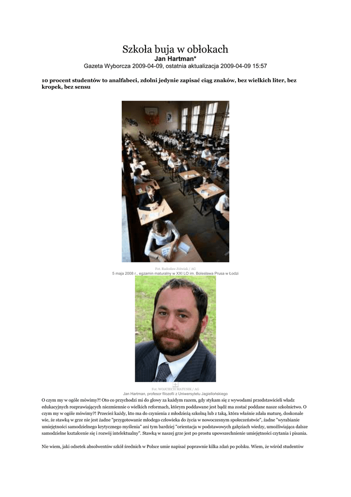 Szkoła buja w obłokach Jan Hartman* Gazeta Wyborcza 2009-04-09, ostatnia aktualizacja 2009-04-09 15:57 10 procent studentów to analfabeci, zdolni jedynie zapisać ciąg znaków, bez wielkich liter, bez kropek, bez sensu Fot. Radosław Jóźwiak / AG 5 maja 2008 r., egzamin maturalny w XXI LO im. Bolesława Prusa w Łodzi Fot. WOJCIECH MATUSIK / AG Jan Hartman, profesor filozofii z Uniwersytetu Jagiellońskiego O czym my w ogóle mówimy?! Oto co przychodzi mi do głowy za każdym razem, gdy stykam się z wywodami przedstawicieli władz edukacyjnych rozprawiających niezmiennie o wielkich reformach, którym poddawane jest bądź ma zostać poddane nasze szkolnictwo. O czym my w ogóle mówimy?! Przecież każdy, kto ma do czynienia z młodzieżą szkolną lub z taką, która właśnie zdała maturę, doskonale wie, że stawką w grze nie jest żadne "przygotowanie młodego człowieka do życia w nowoczesnym społeczeństwie", żadne "wyrabianie umiejętności samodzielnego krytycznego myślenia" ani tym bardziej "orientacja w podstawowych gałęziach wiedzy, umożliwiająca dalsze samodzielne kształcenie się i rozwój intelektualny". Stawką w naszej grze jest po prostu upowszechnienie umiejętności czytania i pisania. Nie wiem, jaki odsetek absolwentów szkół średnich w Polsce umie napisać poprawnie kilka zdań po polsku. Wiem, że wśród studentów na pierwszych latach studiów jest to nieco ponad 50 proc. Wśród tych, którzy nie umieją pisać, większość po prostu nie zna ortografii, gramatyki i interpunkcji, ale od biedy może się wysłowić. Być może w fantasmagoriach w rodzaju "profil absolwenta szkoły podstawowej", śnionych przez specjalistów od metodyki nauczania, osoby te odpowiadają kandydatowi do gimnazjum, choć i w to wątpię. Oprócz półanalfabetów mamy jednak wśród studentów analfabetów prawdziwych. Jest ich z pewnością nie mniej niż 10 proc. Osoby te zdolne są jedynie zapisać ciąg kulfonów nieukładających się w zdania, ze szczątkową strukturą gramatyczną, bez wielkich liter i kropek, bez podmiotów i orzeczeń, bez sensu. Są to absolwenci polskich liceów i techników, posiadacze matur, starych bądź nowych, bez różnicy. Ściąga dobra na wszystko Wykładowcy szkół wyższych wiedzą doskonale, że większość studentów nie ma żadnej, najskromniejszej nawet, wiedzy na żaden temat, a część nie umie czytać (duka bez zrozumienia) ani pisać. Dlatego nie ma nawet mowy o tym, żeby jakiś wykładowca, na przykład nauczyciel matematyki na politechnice, poniechał wykładania najbardziej nawet elementarnej wiedzy, zakładając, że student już ją posiada. Wykłada się zawsze wszystko od zera. Gdy zaś przychodzi do zaliczeń, każdy wykładowca, wiedząc, że normalne zdawanie, zgodne z wymogami programu studiów i powagą uczelni oraz dyplomu, oznaczałoby odsiew większości studentów, musi pogodzić się z koniecznością udzielenia zaliczeń tym 70 procentom "studentów", którzy niczego bynajmniej nie studiują, w życiu nie przeczytali żadnej książki ani bynajmniej nie mają takiego zamiaru. Jak to zrobić, skoro w najcięższych przypadkach chodzi po prostu o analfabetów? Po pierwsze, trzeba wprowadzić zaliczenie na podstawie prac pisemnych, czyli tzw. referatów. W zdecydowanej większości (zdarzało mi się, że w 100 proc.) będą to plagiaty (ściągnięte z internetu bądź napisane na zamówienie), na co oczywiście należy przymknąć oko, aby swój cel - zaliczenie zajęć prawie wszystkim studentom - osiągnąć. Druga metoda to testy. Konstruuje się test w taki sposób, aby tylko niedorozwinięty umysłowo mógł go nie zdać. Test taki nie wymaga umiejętności pisania, a i sprawdza się szybciutko. Tak czy inaczej zaliczenia będą rozdane, a etat wykładowcy, na prywatnych uczelniach zagrożony w przypadku zbyt dużej liczby postawionych dwójek, uratowany. Wiem, wiem - są też inne licea i inne uczelnie. Ja jednak nie mówię dziś o poezji, lecz o prozie. Nie chodzi mi o "pełny obraz" ani "wielostronne ujęcie problemu", lecz o powiedzenie głośno prostej rzeczy: większość młodych posiadaczy polskiej matury, a w tym większość nowych studentów, kompletnie nic nie umie, a co gorsza - nauczona jest w szkole oszukiwania i ściągania. Kto pragnie ze mną polemizować, niechaj pamięta, jaka jest moja teza i na czym ją opieram. A opieram ją na wieloletnim doświadczeniu z uczeniem 19-latków, absolwentów liceów. Doświadczenie to jest coraz bardziej przygnębiające. Jeszcze dziesięć lat temu zadawałem studentom rozmaite pytania odnoszące się do podstawowej wiedzy szkolnej, a potem utyskiwałem na szkoły, że niczego nie uczą. A wyglądało to tak, że pytałem o coś, na przykład o prawo Ohma albo Archimedesa, albo o Austerlitz, albo o cokolwiek w tym stylu i zwykle na kilkanaście osób odpowiedź znana była jednej czy dwóm. Mówiłem wtedy z cierpkim uśmiechem: "Wprawdzie przeciętny absolwent nie umie nic, ale zbiorowa mądrość grupy studentów jest wielka". Otóż te czasy się skończyły. Dziś moje pytania kierowane do studentów I roku nie mogą już dotyczyć wiedzy szkolnej. Przypominają raczej quiz z pytaniami za 100 zł z "Milionerów". Po jakiemu mówi się w Argentynie? XII wiek - jaka to epoka? W jakim kraju leżą Ateny? Co to jest ZSRR? Kiedy była I wojna światowa? I znowu jest tak samo - ogromna większość nie wie, ale prawie zawsze znajdzie się w grupie ktoś, kto wie. Tylko że pytania się zmieniły "Heraklit żywił się trawom" Ja też muszę dawać zaliczenia. Też imam się wspomnianych metod, z wyjątkiem świadomego akceptowania plagiatów. Urządzam za to egzaminy pisemne. Polegają one na tym, że wytypowani studenci piszą ściągi, a reszta je przepisuje na egzaminie, nie bacząc specjalnie na treść pytania. Ściąga znaczna większość, jakkolwiek zwykle z dwóch, trzech wzorów. Dlatego w pracach egzaminacyjnych powtarzają 
