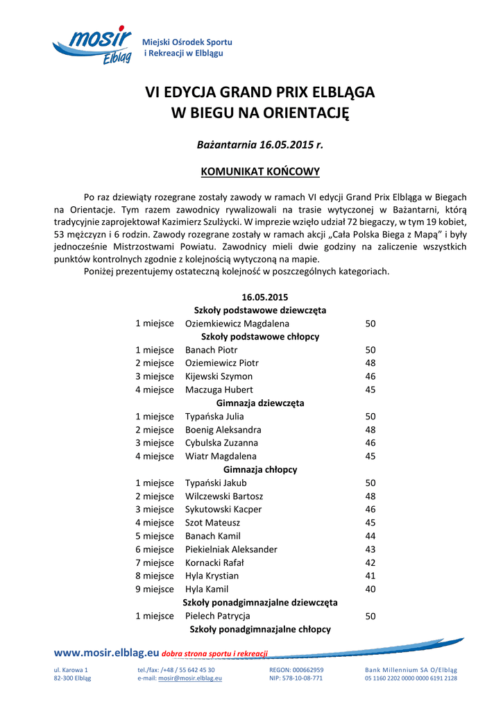 Miejski Ośrodek Sportu i Rekreacji w Elblągu VI EDYCJA GRAND PRIX ELBLĄGA W BIEGU NA ORIENTACJĘ Bażantarnia 16.05.2015 r. KOMUNIKAT KOŃCOWY Po raz dziewiąty rozegrane zostały zawody w ramach VI edycji Grand Prix Elbląga w Biegach na Orientacje. Tym razem zawodnicy rywalizowali na trasie wytyczonej w Bażantarni, którą tradycyjnie zaprojektował Kazimierz Szulżycki. W imprezie wzięło udział 72 biegaczy, w tym 19 kobiet, 53 mężczyzn i 6 rodzin. Zawody rozegrane zostały w ramach akcji „Cała Polska Biega z Mapą” i były jednocześnie Mistrzostwami Powiatu. Zawodnicy mieli dwie godziny na zaliczenie wszystkich punktów kontrolnych zgodnie z kolejnością wytyczoną na mapie. Poniżej prezentujemy ostateczną kolejność w poszczególnych kategoriach. 1 miejsce 1 miejsce 2 miejsce 3 miejsce 4 miejsce 1 miejsce 2 miejsce 3 miejsce 4 miejsce 1 miejsce 2 miejsce 3 miejsce 4 miejsce 5 miejsce 6 miejsce 7 miejsce 8 miejsce 9 miejsce 1 miejsce 16.05.2015 Szkoły podstawowe dziewczęta Oziemkiewicz Magdalena Szkoły podstawowe chłopcy Banach Piotr Oziemiewicz Piotr Kijewski Szymon Maczuga Hubert Gimnazja dziewczęta Typańska Julia Boenig Aleksandra Cybulska Zuzanna Wiatr Magdalena Gimnazja chłopcy Typański Jakub Wilczewski Bartosz Sykutowski Kacper Szot Mateusz Banach Kamil Piekielniak Aleksander Kornacki Rafał Hyla Krystian Hyla Kamil Szkoły ponadgimnazjalne dziewczęta Pielech Patrycja Szkoły ponadgimnazjalne chłopcy 50 50 48 46 45 50 48 46 45 50 48 46 45 44 43 42 41 40 50 www.mosir.elblag.eu dobra strona sportu i rekreacji ul. Karowa 1 82-300 Elbląg tel./fax: /+48 / 55 642 45 30 e-mail: [email protected] REGON: 000662959 NIP: 578-10-08-771 Bank Millennium SA O/Elbląg 05 1160 2202 0000 0000 6191 2128 1 miejsce 2 miejsce 3 miejsce 4 miejsce 5 miejsce 6 miejsce 1 miejsce 2 miejsce 3 miejsce 4 miejsce 5 miejsce 6 miejsce 7 miejsce 8 miejsce 9 miejsce 10 miejsce 11 miejsce 12 miejsce 13 miejsce 1 miejsce 2 miejsce 3 miejsce 4 miejsce 5 miejsce 6 miejsce 7 miejsce 8 miejsce 9 miejsce 10 miejsce 11 miejsce 12 miejsce 13 miejsce 14 miejsce 15 miejsce 14 miejsce 1 miejsce 2 miejsce 3 miejsce 4 miejsce Głębicki Marcin Mirys Rafał Mrozek Karol Rapacki Mateusz Szczepański Cezary Bagiński Tomasz OPEN - kobiety Kovalewa Olga Riazantceva Vera Klunder Joanna Banach Janina Chernysheva Tatiana Soloveva Elena Szost Sandra Raeva Aleksandra Miroshnichenko Elena Bundz Agnieszka Sobstel Paulina Typańska Monika Wąsicka Czesława OPEN - mężczyźni Czernow Sergei Światkowski Piotr Solovev Mikhail Gagjew Mateusz Ossowski Jakub Kuciński Łukasz Sokołowski Mirosław Tyszkowski Józef Zglejszewski Marek Bocoń Tomasz Kacner Tomasz Dziedziula Jarosław Szot Sławomir Masny Henryk Miroshnichenko Viktor Wąsicki Mariusz Kategoria rodzinna Rodzina Wąsickich Rodzina Oziemkiewiczów Rodzina Bagińskich Rodzina Sawickich 50 48 46 45 44 43 50 48 46 45 44 43 42 41 40 39 38 37 36 50 48 46 45 44 43 42 41 40 39 38 37 36 35 34 33 50 48 46 45 5 miejsce 6 miejsce Rodzina Stefaniaków Rodzina Hylów 44 43 Po zakończeniu rywalizacji sportowej odbyło się uroczyste wręczenie dyplomów, nagród i upominków. Wśród biegaczy zostały rozlosowane trzy zaproszenia do pizzerii La Capra, które otrzymali: Kacper Sykutowski, Sławomir Szot i Szymon Kijewski, a karnet do Fitness Clubu Calypso trafił w ręce rodziny Wąsickich. Rozlosowano także siedem wejściówek do rodzinnego parku rozgrywki Nowa Holandia, a szczęśliwymi ich posiadaczami stali się: Mateusz Gagjew, Jakub Ossowski, Sergei Czernow, Marcin Głębicki, Henryk Masny, Joanna Klunder oraz Kamil Banach. Były to ostatnie zawody klasyfikacyjne zaliczane do cyklu Grand Prix Elbląga. Przed uczestnikami już tylko Indywidualne Mistrzostwa Elbląga, które jednocześnie będą podsumowaniem tegorocznej edycji grand prix. Zawody rozegrane zostaną w sobotę 13 czerwca w Bażantarni. Biuro zawodów mieścić się będzie przy restauracji Myśliwska. Przyjmowanie zgłoszeń drogą mailową ([email protected], [email protected]) lub w dniu imprezy w biurze zawodów w godzinach 9:30-9:45. Start zaplanowano na godz. 10:00. Komplet wyników oraz galerie zdjęć dostępne są na stronie internetowej www.mosir.elblag.eu. Organizator Dział Organizacji Imprez MOSiR