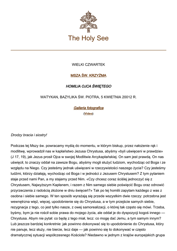The Holy See WIELKI CZWARTEK MSZA ŚW. KRZYŻMA HOMILIA OJCA ŚWIĘTEGO WATYKAN, BAZYLIKA ŚW. PIOTRA, 5 KWIETNIA 20012 R. Galleria fotografica (Video) Drodzy bracia i siostry! Podczas tej Mszy św. powracamy myślą do momentu, w którym biskup, przez nałożenie rąk i modlitwę, wprowadził nas w kapłaństwo Jezusa Chrystusa, abyśmy «byli uświęceni w prawdzie» (J 17, 19), jak Jezus prosił Ojca w swojej Modlitwie Arcykapłańskiej. On sam jest prawdą. On nas uświęcił, to znaczy oddał na zawsze Bogu, abyśmy mogli służyć ludziom, wychodząc od Boga i ze względu na Niego. Czy jesteśmy jednak uświęceni w rzeczywistości naszego życia? Czy jesteśmy ludźmi, którzy działają, wychodząc od Boga i w jedności z Jezusem Chrystusem? Z tym pytaniem staje przed nami Pan, a my stajemy przed Nim. «Czy chcesz coraz ściślej jednoczyć się z Chrystusem, Najwyższym Kapłanem, i razem z Nim samego siebie poświęcić Bogu oraz odnowić przyrzeczenia z radością złożone w dniu święceń?» Tak po tej homilii zapytam każdego z was z osobna i siebie samego. W ten sposób wyrażają się przede wszystkim dwie rzeczy: potrzebna jest wewnętrzna więź, więcej, upodobnienie się do Chrystusa, a w tym przejście samych siebie, rezygnacja z tego, co jest tylko nasze, z owej samorealizacji, o której tak często się mówi. Trzeba, byśmy, bym ja nie rościł sobie prawa do mojego życia, ale oddał je do dyspozycji kogoś innego — Chrystusa. Abym nie pytał: co będę z tego miał, lecz: co mogę dać Jemu, a tym samym innym? Lub jeszcze bardziej konkretnie: jak powinno dokonywać się to upodobnienie do Chrystusa, który nie panuje, lecz służy, nie bierze, lecz daje — jak powinno się to dokonywać w często dramatycznej sytuacji współczesnego Kościoła? Niedawno w jednym z krajów europejskich grupa 2 kapłanów opublikowała wezwanie do nieposłuszeństwa, pokazując jednocześnie na konkretnych przykładach, w jaki sposób owo nieposłuszeństwo ma się wyrażać, i mówiąc, że ma ono ignorować definitywne decyzje Magisterium Kościoła, dotyczące na przykład kwestii udzielania święceń kobietom. Odnośnie do tego bł. papież Jan Paweł II stwierdził w sposób nieodwołalny, że w tej kwestii Kościół nie otrzymał od Pana żadnego upoważnienia. Czy nieposłuszeństwo jest drogą do odnowy Kościoła? Pragniemy wierzyć autorom tego apelu, kiedy mówią, że powoduje nimi troska o Kościół, że są przekonani, iż powolności instytucji trzeba przeciwstawić się za pomocą drastycznych środków, żeby otworzyć nowe drogi — aby na nowo dostosować Kościół do potrzeb współczesności. Czyż jednak nieposłuszeństwo jest rzeczywiście drogą? Czy jest w tym coś z upodobnienia się do Chrystusa, które stanowi przesłankę każdej autentycznej odnowy, czy też raczej jedynie rozpaczliwa potrzeba, żeby coś zrobić, żeby przeobrazić Kościół zgodnie z naszymi życzeniami i ideami? Jednakże nie upraszczajmy zbytnio tego problemu. Czyż Chrystus nie korygował ludzkich tradycji, które mogły stanąć na przeszkodzie słowu i woli Boga? Tak, uczynił to, aby odnowić posłuszeństwo wobec autentycznej woli Bożej, Jego zawsze obowiązującego słowa. Zależało mu na prawdziwym posłuszeństwie, które jest przeciwieństwem samowoli człowieka. I nie zapominajmy: On był synem, obdarzonym wyjątkowym autorytetem i odpowiedzialnym za ujawnienie autentycznej woli Bożej, by w ten sposób otworzyć Słowu Bożemu drogę do świata pogan. I wreszcie: zrealizował On swoją misję poprzez swoje własne posłuszeństwo i pokorę aż po ofiarę krzyża, i w ten sposób ją uwiarygodnił. Nie moja, lecz Twoja wola niech się stanie: to jest słowo, które objawia nam Syna, Jego pokorę, a jednocześnie Jego bóstwo, i wskazuje nam drogę. Zapytajmy raz jeszcze: czy tego typu rozważania nie bronią w istocie bezruchu, skostnienia tradycji? Nie, ten kto przygląda się historii okresu posoborowego, może rozpoznać dynamikę prawdziwej odnowy, która przybierała często zaskakujące formy w ruchach pełnych życia, i dzięki której niemal namacalne stają się niewyczerpana żywotność świętego Kościoła, obecność i skuteczne działanie Ducha Świętego. A jeśli popatrzymy na ludzi, z których wypłynęły i wypływają te świeże strumienie życia, widzimy też, że aby wydać nowe owoce, trzeba być napełnionymi radością wiary, potrzeba radykalności posłuszeństwa, dynamiki nadziei i mocy miłości. Drodzy przyjaciele, jasne jest, że upodobnienie do Chrystusa jest przesłanką i podstawą wszelkiej odnowy. Być może jednak postać Jezusa Chrystusa wydaje się nam czasem zbyt wzniosła i zbyt wielka, abyśmy mogli się ośmielić czerpać z Niego wzór. Pan o tym wie, dlatego zatroszczył się o «wykładnie», których rząd wielkości jest bardziej dla nas dostępny i bliższy. Właśnie z tego powodu Paweł ośmielił się powiedzieć swoim wspólnotom: naśladujcie mnie, ale ja należę do Chrystusa. Był on dla swoich wiernych «wykładnią» stylu życia Chrystusa, którą mogli widzieć i którą mogli przyjąć. Począwszy od Pawła, przez całe dzieje takimi «wykładniami» drogi Jezusa były żywe postaci historyczne. Nam, kapłanom, przychodzi na myśl wielka rzesza świętych kapłanów, którzy nas poprzedzają, wskazując drogę: począwszy od Polikarpa ze Smyrny i Ignacego z Antiochii, poprzez wielkich duszpasterzy, jak Ambroży, Augustyn i Grzegorz Wielki, aż 3 po Ignacego z Loyoli, Karola Boromeusza i Jana Vianneya, i wreszcie po kapłanów-męczenników XX w. i na koniec po papieża Jana Pawła II, który w działaniu i cierpieniu upodobnienie do Chrystusa przeżywał jako «dar i tajemnicę». Święci pokazują nam, jak dokonuje się odnowa i jak możemy jej służyć. Pozwalają nam też zrozumieć, że Boga nie interesują wielkie liczby i sukcesy zewnętrzne, lecz znakiem odnoszonych przez Niego zwycięstw 