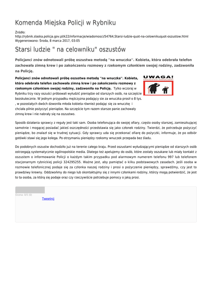 Komenda Miejska Policji w Rybniku Źródło: http://rybnik.slaska.policja.gov.pl/k22/informacje/wiadomosci/54764,Starsi-ludzie-quot-na-celownikuquot-oszustow.html Wygenerowano: Środa, 8 marca 2017, 03:05 Starsi ludzie " na celowniku" oszustów Policjanci znów odnotowali próbę oszustwa metodą ''na wnuczka''. Kobieta, która odebrała telefon zachowała zimną krew i po zakończeniu rozmowy z rzekomym członkiem swojej rodziny, zadzwoniła na Policję. Policjanci znów odnotowali próbę oszustwa metodą ''na wnuczka''. Kobieta, która odebrała telefon zachowała zimną krew i po zakończeniu rozmowy z rzekomym członkiem swojej rodziny, zadzwoniła na Policję. Tylko wczoraj w Rybniku trzy razy oszuści próbowali wyłudzić pieniądze od starszych osób, na szczęście bezskutecznie. W jednym przypadku mężczyzna podający sie za wnuczka prosił o 8 tys. , w pozostałych dwóch dzwoniła młoda kobieta również podając się za wnuczkę i chciała pilnie pożyczyć pieniądze. Na szczęście tym razem starsze panie zachowały zimną krew i nie nabrały się na oszustwo. Sposób działania sprawcy z reguły jest taki sam. Osoba telefonująca do swojej ofiary, często osoby starszej, zamieszkującej samotnie i mogącej posiadać jakieś oszczędności przedstawia się jako członek rodziny. Twierdzi, że potrzebuje pożyczyć pieniądze, bo znalazł się w trudnej sytuacji. Gdy sprawcy uda się przekonać ofiarę do pożyczki, informuje, że po odbiór gotówki stawi się jego kolega. Po otrzymaniu pieniędzy rzekomy wnuczek przepada bez śladu. Do podobnych oszustw dochodziło już na terenie całego kraju. Przed oszustami wyłudzającymi pieniądze od starszych osób ostrzegają systematycznie ogólnopolskie media. Dlatego też apelujemy do osób, które zostały oszukane lub miały kontakt z oszustem o informowanie Policji o każdym takim przypadku pod alarmowym numerem telefonu 997 lub telefonem stacjonarnym rybnickiej policji 324295255. Ważne jest, aby pamiętać o kilku podstawowych zasadach. Jeśli osoba w rozmowie telefonicznej podaje się za członka naszej rodziny i prosi o pożyczenie pieniędzy, sprawdźmy, czy jest to prawdziwy krewny. Oddzwońmy do niego lub skontaktujmy się z innymi członkami rodziny, którzy mogą potwierdzić, że jest to ta osoba, za którą się podaje oraz czy rzeczywiście potrzebuje pomocy o jaką prosi. Ocena: 0/5 (0) Tweetnij