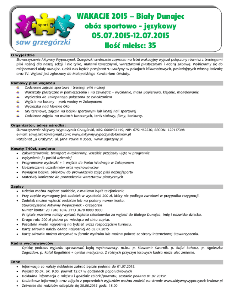 WAKACJE 2015 – Biały Dunajec obóz sportowo - językowy 05.07.2015-12.07.2015 Ilość miejsc: 35 O wyjeździe Stowarzyszenie Aktywny Wypoczynek Grzegórzki serdecznie zaprasza na letni wakacyjny wyjazd połączony również z treningami piłki nożnej dla naszej sekcji i nie tylko, matami tanecznymi, warsztatami plastycznymi i dobrą zabawą. Wybieramy się do miejscowości Biały Dunajec. Gościł nas będzie pensjonat ‘U Grażyny’ w pokojach kilkuosobowych, posiadających własną łazienkę oraz TV. Wyjazd jest zgłaszany do Małopolskiego Kuratorium Oświaty. Ramowy plan wyjazdu Codzienne zajęcia sportowe i treningi piłki nożnej Warsztaty plastyczne w pomieszczeniu i na zewnątrz – wycinanie, masa papierowa, klejenie, modelowanie Wycieczka do Zakopanego połączona ze zwiedzaniem Wyjście na baseny – park wodny w Zakopanem Wycieczka nad Morskie Oko Gry terenowe, zajęcia na boisku sportowym lub krytej hali sportowej Codzienne zajęcia na matach tanecznych, tenis stołowy, filmy, konkursy. Organizator, adres ośrodka: Stowarzyszenie Aktywny Wypoczynek-Grzegórzki, KRS: 0000431449; NIP: 6751462230; REGON: 122417398 e-mail: [email protected]; www.aktywnywypoczynek-krakow.pl Pensjonat „u Grażyny”, ul. Jana Pawła II 356a, www.ugrazyny.pl Koszty 740zł, zawiera: Zakwaterowanie, transport autokarowy, wszelkie przejazdy ujęte w programie Wyżywienie /3 posiłki dziennie/ Programowe wycieczki + 1 wejście do Parku Wodnego w Zakopanem Ubezpieczenie uczestników oraz wychowawców Wynajem boiska, obiektów do prowadzenia zajęć piłki nożnej/sportu Materiały konieczne do prowadzenia warsztatów plastycznych Zapisy Dziecko można zapisać osobiście, e-mailowo bądź telefonicznie Przy zapisie wymagany jest zadatek w wysokości 200 zł, który nie podlega zwrotowi w przypadku rezygnacji. Zadatek można wpłacić osobiście lub na podany numer konta: Stowarzyszenie Aktywny Wypoczynek - Grzegórzki Numer konta: 20 1940 1076 3113 3670 0000 0000 W tytule przelewu należy wpisać: Wpłata członkowska za wyjazd do Białego Dunajca, imię i nazwisko dziecka. Druga rata 200 zł płatna po miesiącu od dnia zapisu. Pozostała kwota najpóźniej na tydzień przez rozpoczęciem turnusu. Kartę zdrowia należy oddać najpóźniej do 03.07.2015 Kartę zdrowia można otrzymać w formie wydruku lub można pobrać ze strony internetowej Stowarzyszenia. Kadra wychowawców Opiekę podczas wyjazdu sprawować będą wychowawcy, m.in.: p. Sławomir Swornik, p. Rafał Bohacz, p. Agnieszka Zagozdon, p. Rafał Rogaliński + opieka medyczna. Z różnych przyczyn losowych kadra może ulec zmianie. Inne Informacja co należy dokładnie zabrać będzie podana do 01.07.2015. Wyjazd 05.07, ok. 9.00, powrót 12.07 w godzinach popołudniowych Dokładna informacja o miejscu i godzinie zbiórki/powrotu, zostanie podana 01.07.2015r. Dodatkowe informacje oraz zdjęcia z poprzednich wyjazdów można znaleźć na stronie www.aktywnywypoczynek-krakow.pl Zebranie dla rodziców odbędzie się 30.06.2015 godz. 18.00