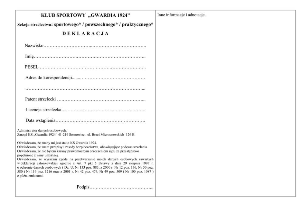 KLUB SPORTOWY „GWARDIA 1924” Sekcja strzelectwa: sportowego* / powszechnego* / praktycznego* DEKLARACJA Nazwisko…………………………..…………………………….. Imię……………………….………….………………………….. PESEL ……………………………………….………………….. Adres do korespondencji.......…………………………………… …………………………………………………………………... Patent strzelecki ….……………………………………………... Licencja strzelecka………………………………………..…….. Data wstąpienia…………………………………………………. Administrator danych osobowych: Zarząd KS „Gwardia 1924” 41-219 Sosnowiec, ul. Braci Mieroszewskich 126 B Oświadczam, że znany mi jest statut KS Gwardia 1924. Oświadczam, że znam przepisy i zasady bezpieczeństwa, obowiązujące podczas strzelania. Oświadczam, że nie byłem karany prawomocnym orzeczeniem sądu za przestępstwo popełnione z winy umyślnej. Oświadczam, że wyrażam zgodę na przetwarzanie moich danych osobowych zawartych w deklaracji członkowskiej zgodnie z Art. 7 pkt 5 Ustawy z dnia 29 sierpnia 1997 r. o ochronie danych osobowych ( Dz. U. Nr 133 poz. 883, z 2000 r. Nr 12 poz. 136, Nr 50 poz. 580 i Nr 116 poz. 1216 oraz z 2001 r. Nr 42 poz. 474, Nr 49 poz. 509 i Nr 100 poz. 1087 ) z późn. zmianami. Podpis…………………………………... Inne informacje i adnotacje.