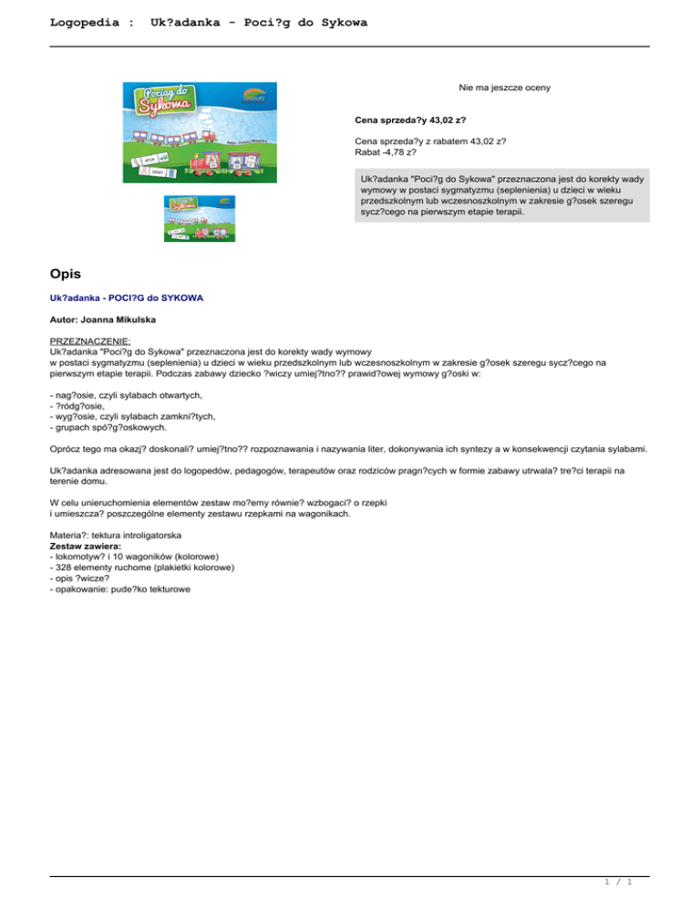 Logopedia : Uk?adanka - Poci?g do Sykowa Nie ma jeszcze oceny Cena sprzeda?y 43,02 z? Cena sprzeda?y z rabatem 43,02 z? Rabat -4,78 z? Uk?adanka "Poci?g do Sykowa" przeznaczona jest do korekty wady wymowy w postaci sygmatyzmu (seplenienia) u dzieci w wieku przedszkolnym lub wczesnoszkolnym w zakresie g?osek szeregu sycz?cego na pierwszym etapie terapii. Opis Uk?adanka - POCI?G do SYKOWA Autor: Joanna Mikulska PRZEZNACZENIE: Uk?adanka "Poci?g do Sykowa" przeznaczona jest do korekty wady wymowy w postaci sygmatyzmu (seplenienia) u dzieci w wieku przedszkolnym lub wczesnoszkolnym w zakresie g?osek szeregu sycz?cego na pierwszym etapie terapii. Podczas zabawy dziecko ?wiczy umiej?tno?? prawid?owej wymowy g?oski w: - nag?osie, czyli sylabach otwartych, - ?ródg?osie, - wyg?osie, czyli sylabach zamkni?tych, - grupach spó?g?oskowych. Oprócz tego ma okazj? doskonali? umiej?tno?? rozpoznawania i nazywania liter, dokonywania ich syntezy a w konsekwencji czytania sylabami. Uk?adanka adresowana jest do logopedów, pedagogów, terapeutów oraz rodziców pragn?cych w formie zabawy utrwala? tre?ci terapii na terenie domu. W celu unieruchomienia elementów zestaw mo?emy równie? wzbogaci? o rzepki i umieszcza? poszczególne elementy zestawu rzepkami na wagonikach. Materia?: tektura introligatorska Zestaw zawiera: - lokomotyw? i 10 wagoników (kolorowe) - 328 elementy ruchome (plakietki kolorowe) - opis ?wicze? - opakowanie: pude?ko tekturowe 1 / 1 Powered by TCPDF (www.tcpdf.org)