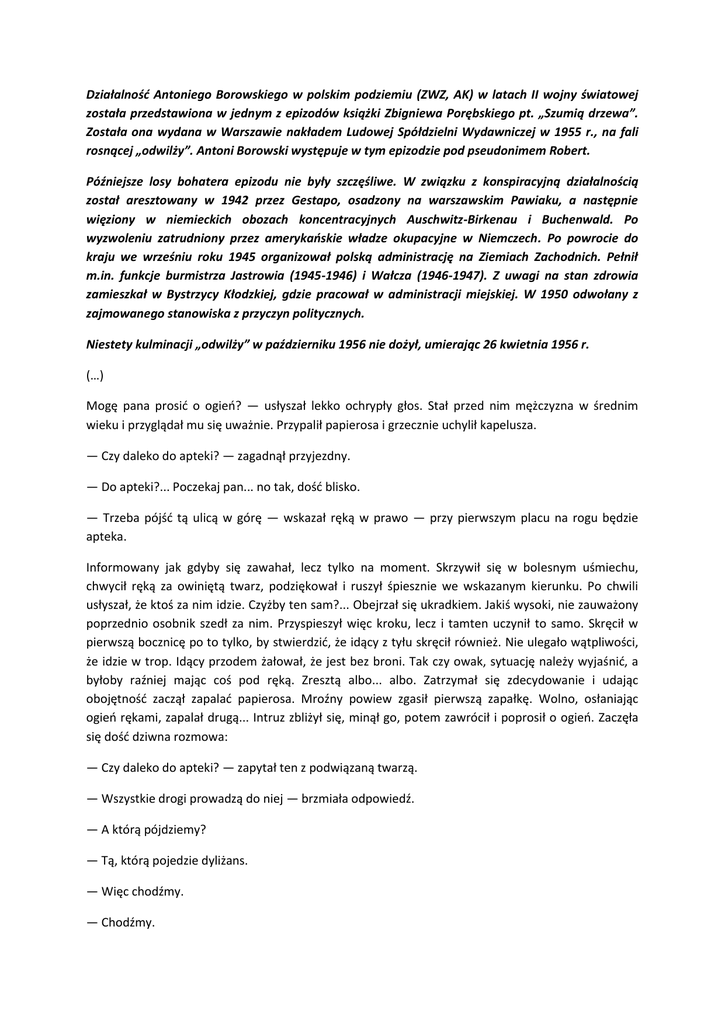Działalność Antoniego Borowskiego w polskim podziemiu (ZWZ, AK) w latach II wojny światowej została przedstawiona w jednym z epizodów książki Zbigniewa Porębskiego pt. „Szumią drzewa”. Została ona wydana w Warszawie nakładem Ludowej Spółdzielni Wydawniczej w 1955 r., na fali rosnącej „odwilży”. Antoni Borowski występuje w tym epizodzie pod pseudonimem Robert. Późniejsze losy bohatera epizodu nie były szczęśliwe. W związku z konspiracyjną działalnością został aresztowany w 1942 przez Gestapo, osadzony na warszawskim Pawiaku, a następnie więziony w niemieckich obozach koncentracyjnych Auschwitz-Birkenau i Buchenwald. Po wyzwoleniu zatrudniony przez amerykańskie władze okupacyjne w Niemczech. Po powrocie do kraju we wrześniu roku 1945 organizował polską administrację na Ziemiach Zachodnich. Pełnił m.in. funkcje burmistrza Jastrowia (1945-1946) i Wałcza (1946-1947). Z uwagi na stan zdrowia zamieszkał w Bystrzycy Kłodzkiej, gdzie pracował w administracji miejskiej. W 1950 odwołany z zajmowanego stanowiska z przyczyn politycznych. Niestety kulminacji „odwilży” w październiku 1956 nie dożył, umierając 26 kwietnia 1956 r. (…) Mogę pana prosić o ogień? — usłyszał lekko ochrypły głos. Stał przed nim mężczyzna w średnim wieku i przyglądał mu się uważnie. Przypalił papierosa i grzecznie uchylił kapelusza. — Czy daleko do apteki? — zagadnął przyjezdny. — Do apteki?... Poczekaj pan... no tak, dość blisko. — Trzeba pójść tą ulicą w górę — wskazał ręką w prawo — przy pierwszym placu na rogu będzie apteka. Informowany jak gdyby się zawahał, lecz tylko na moment. Skrzywił się w bolesnym uśmiechu, chwycił ręką za owiniętą twarz, podziękował i ruszył śpiesznie we wskazanym kierunku. Po chwili usłyszał, że ktoś za nim idzie. Czyżby ten sam?... Obejrzał się ukradkiem. Jakiś wysoki, nie zauważony poprzednio osobnik szedł za nim. Przyspieszył więc kroku, lecz i tamten uczynił to samo. Skręcił w pierwszą bocznicę po to tylko, by stwierdzić, że idący z tyłu skręcił również. Nie ulegało wątpliwości, że idzie w trop. Idący przodem żałował, że jest bez broni. Tak czy owak, sytuację należy wyjaśnić, a byłoby raźniej mając coś pod ręką. Zresztą albo... albo. Zatrzymał się zdecydowanie i udając obojętność zaczął zapalać papierosa. Mroźny powiew zgasił pierwszą zapałkę. Wolno, osłaniając ogień rękami, zapalał drugą... Intruz zbliżył się, minął go, potem zawrócił i poprosił o ogień. Zaczęła się dość dziwna rozmowa: — Czy daleko do apteki? — zapytał ten z podwiązaną twarzą. — Wszystkie drogi prowadzą do niej — brzmiała odpowiedź. — A którą pójdziemy? — Tą, którą pojedzie dyliżans. — Więc chodźmy. — Chodźmy. Uścisnęli sobie dłonie i poszli w mrok. Nieco dalej, na jednej z wąskich i pustych uliczek, ten, który przyjechał, zdjął chustkę z twarzy, wyprostował się i przestał kuleć. Od razu odmłodniał. — Dość maskarady — uśmiechnął się. — Zdziwiłby się zapewne poprzedni rozmówca, gdyby was teraz zobaczył. — Pomyślałby, że mi apteka, pomogła. Kto to był, szpicel? — Nie wiem, nie znam tej twarzy. Dlatego wolałem trzymać się początkowo z daleka, a dogonić was później. — A ja już myślałem, że jakaś wsypa. I jego, i was wziąłem za agentów. — Nie trudno się naciąć, psiakrew. . . — I ja też byłem ostrożny, bo, człowiek z owiniętą twarzą trafić się może niejeden. — I pytać się o aptekę? — To już logiczne. Kto jest chory, ten szuka apteki. — Tak, ale przyznacie, że musiałby to być szczególny zbieg, okoliczności. — Naturalnie. Ale splot okoliczności bywa niekiedy zdumiewająco niewiarogodny. Szli szybko. Mróz szczypał policzki i ciął w uszy. Buchali parą oddechów jak dymiące wrzątkiem garnki. — Wasz pseudonim „Szakal"? — spytał półgłosem prowadzący. — Tak jest. Niezbyt piękny, co?... — No; bohaterski to on nie jest, ale same lwy i orły nie wystarczą. Lisów nam trzeba, a nawet kretów. Szakal chętnie by się dowiedział, do jakiej kategorii należy jego towarzysz. Przyjrzał mu się dokładniej. Był to wysoki, smukły brunet lat około trzydziestu. Ubrany był w skromną, starą jesionkę i sportową czapkę, ale smagła o ostrych rysach twarz nie była pospolita. Chociaż wieczór nie był późny, przechodniów na ulicy spotykali niewielu. Zimno i obawa przed Niemcami zapędziły ludzi wcześnie do domów. Gdzieś na wieży stary zegar wydzwaniał ze zgrzytem godzinę. Ktoś zamykał głośno bramę na klucz. Na rogu w barze skrzypce zawodziły smętną, cygańską melodię. — Wstąpimy tutaj — rzekł przewodnik, kierując się w stronę knajpy. Przyzwyczajony nie dziwić się niczemu Szakal szedł za nim. posłusznie. Wraz z gorącym, zadymionym powietrzem buchnęło na nich wrzawą. Klientelę baru stanowili wojskowi Niemcy, kilku cywilów i kilka kobiet. Pijany skrzypek fałszował czardasza przy melancholijnym akompaniamencie garbatego pianisty i tęgiego, spoconego feldfebla, który uzupełniał „koncert" zachrypłym barytonem. Siedli w kącie sali, zamawiając wódkę i gorącą zakąskę. Stuknęli się szklankami. Wypili. Szakal, który nie jadł tego dnia wiele, poczuł w żołądku ciepło, a w głowie lekki szum. — Nie chciałbym się wstawić, póki nie załatwię sprawy — powiedział do towarzysza. — Sprawa jest już jakby załatwiona. - Poczekamy tutaj na kolegę, który was zaprowadzi na nocleg, a jutro rano dostaniecie dokładne instrukcje. Ja oczywiście również nie pragnę się upić, ale wiecie; całe popołudnie na mrozie. Pociąg wasz się spóźnił. Czekałem długo. Mój pseudonim — „Robert". Nie wiem na jak długo, bo tutaj często zmieniać trzeba. Wydaje mi się, że zobaczymy się niebawem w lesie i... miała czarne oczy — i nogi, mówię wa