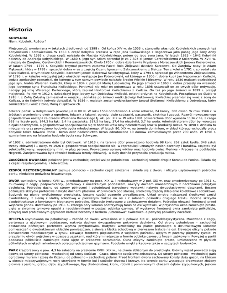 Historia KOBYLNIKI Niem. Kobelnik, Roβdorf Miejscowość wymieniana w tekstach źródłowych od 1398 r. Od końca XIV w. do 1553 r. stanowiła własność Kobielnickich zwanych też Kobylnickimi i Kotowieckimi. W 1553 r. część Kobylnik przeszła w ręce Jana Skaławskiego z Rogaczewa jako posag jego żony Anny Kobylnickiej. W 1563 r. druga część należała do Macieja Kobylnickiego, potem do jego syna Jana. W latach 1623 – 1642 Kobylniki należały do Andrzeja Kobylnickiego. W 1680 r. jego syn Adam sprzedał je za 7.825 zł Janowi Cerekwickiemu z Kokorzyna. W XVIII w. należały do Zarębów, Cerekwickich i Romaniszewskich. Około 1700 r. dobra dzierżawiła Krystyna z Moraczewskich Janowa Kozierowska. W latach 1744 – 1779 r. Kobylniki trzymał prawem zastawu Paweł Rola Zbijewski dziedzic Karczewa. Od Zarębów nabył je Adam Mąkowski, który w 1788 r. sprzedał dobra wraz z częścią Krzanu Ignacemu Zakrzewskiemu z Białcza. Ten z kolei w 1791 r. sprzedał cały klucz białecki, w tym także Kobylniki, baronowi Janowi Balcerowi Szlichtyngowi, który w 1794 r. sprzedał go Wincentemu Zbijewskiemu. W 1795 r. w księdze wieczystej jako właściciel występuje Jan Potworowski, od którego w 1806 r. dobra kupił Jan Nepomucen Kwilecki, sędzia apelacyjny poznański, do którego w tym samym powiecie należało Srocko Wielkie i Bieczyny. W roku 1830 majątek odziedziczył jego syn, hrabia Walerian Kwilecki, który w 1834 r. poślubił Marię Lubowiecką. Po jego śmierci w 1863 r. dobra przeszły na własność jego jedynego syna Franciszka Kwileckiego. Ponieważ nie miał on potomstwa w roku 1898 ustanowił on ze swych dóbr ordynację, nadając jej imię Walerego Kwileckiego, którą zapisał Hektorowi Kwileckiemu z Kwilcza. On też po jego śmierci w 1899 r. przejął majętność. Po nim w 1912 r. dziedziczył jego jedyny syn Dobiesław Kwilecki, ostatni ordynat na Kobylnikach. Początkowo po ślubie w 1918 r. z Zofią Załuską zamieszkał w majątku, jednakże po śmierci matki Jadwigi Hektorowej Kwileckiej przeniósł się wraz z żoną do Kwilcza, a do Kobylnik jedynie dojeżdżał. W 1936 r. majątek został wydzierżawiony Janowi Stefanowi Kwileckiemu z Dobrojewa, który zamieszkał tu wraz z żoną Marią z Lipkowskich. Folwark pański w Kobylnikach powstał już w XV w. W roku 1559 odnotowano 4 konie robocze, 24 krowy, 380 owiec. W roku 1566 r. w źródłach wymieniany dwór z ogrodem, folwark z łąkami, ogrody, dwie sadzawki, pastewnik, skotnica i zapust. Rozwój nowoczesnego gospodarstwa nastąpił za czasów Waleriana Kwileckiego tj. ok. poł. XIX w. W roku 1881 powierzchnia dóbr wynosiła 1134,2 ha, z czego 628 ha liczyły pola, 144,3 ha łąki, 3,4 ha pastwiska, 317,5 ha lasy, 37,4 ha nieużytki, 3,7 ha woda. Administratorem dóbr był wówczas niejaki Koszczyński, a gospodarstwo specjalizowało się w hodowli krów rasy holenderskiej oraz w produkcji mleka. W 1890 r. działała tu mleczarnia oraz prowadzono hodowlę bydła młodocianego. W latach 80. XIX w. na terenie dominium, w skład którego wchodziły prócz Kobylnik także folwarki Ponin i Krzan oraz nadleśnictwo Krzan odnotowano 19 domów zamieszkanych przez 209 osób. W 1896 r. wzmiankowano na folwarku hodowlę bydła rasy Schwyzer. W 1902 r. administratorem dóbr był Ostrowski. W 1913 r. na terenie dóbr prowadzono hodowlę 98 koni, 262 sztuk bydła, 348 sztuk trzody chlewnej i 1 owcy. W 1926 r. gospodarstwo specjalizowało się w reprodukcji uznanych nasion pszenicy i buraków. Majątek był zelektryfikowany, wyposażony m.in. w pług parowy. Prowadzono uprawę wikliny oraz hodowlę owiec Merinos – Precose na podkładzie Negretti. Zarejestrowana była również hodowla trzody chlewnej, a duży dochód przynosiła produkcja mleka. ZAŁOŻENIE DWORSKIE położone jest w zachodniej części wsi po południowo - zachodniej stronie drogi z Krzanu do Ponina. Składa się z części rezydencjonalnej i folwarcznej. ZESPÓŁ REZYDENCJONALNY zajmuje północno – zachodni część założenia i składa się z dworu i oficyny usytuowanych pośrodku parku, niedaleko podwórza folwarcznego. DWÓR wzniesiony w końcu XVIII w., przebudowany na pocz. XIX w. i rozbudowany w 2 poł. XIX w. oraz zmodernizowany po 1911 r., murowany z cegły, podpiwniczony, parterowy z mieszkalnym poddaszem, nakryty dachem mansardowym z naczółkami pokrytym dachówką. Pośrodku dachu od strony północnej i południowej trzyosiowe wystawki nakryte dwupołaciowymi daszkami. Boczne późniejsze skrzydła parterowe nakryte dachami płaskimi. W piwnicach pod starszą, środkową częścią sklepienie kolebkowe i odcinkowe. Budynek na planie wydłużonego prostokąta, boczne części pozornie zryzalitowane. Układ wnętrz najstarszej środkowej części dwutraktowy, z sienią z klatką schodową w pierwszym trakcie na osi i z salonem pośrodku drugiego traktu. Boczne skrzydła dwuipółtraktowe z korytarzem biegnącym pośrodku. Elewacje tynkowane z zachowanym detalem. Pośrodku elewacji frontowej przed wejściem ganek, dostawiony po 1911 r., którego pary kolumn podtrzymują taras na osi wystawki. W przyziemiu okna zamknięte prosto, ujęte w skromne tynkowe opaski z nadokiennikami w postaci odcinka gzymsu. W wystawce frontowej okna zamknięte półkoliście, powyżej nad profilowanym gzymsem kartusz herbowy z herbem „Szreniawa” Kwileckich, a powyżej półkolisty naczółek. OFICYNA usytuowana na południowy – zachód od dworu wzniesiona w 1 połowie XIX w., późnoklasycystyczna. Murowana z cegły, parterowa z użytkowym poddaszem, nakryta dachem dwuspadowym pokrytym dachówką. Od strony południowo – zachodniej dostawiona późniejsza parterowa węższa przybudówka. Budynek wzniesiony na planie prostokąta o dwutraktowym układzie pomieszczeń o dwutraktowym układzie pomieszczeń, z sienią z klatką schodową w pierwszym trakcie na osi. Elewacje oficyny pokryte boniowaniem modelowanym w tynku. Elewacja frontowa pięcioo