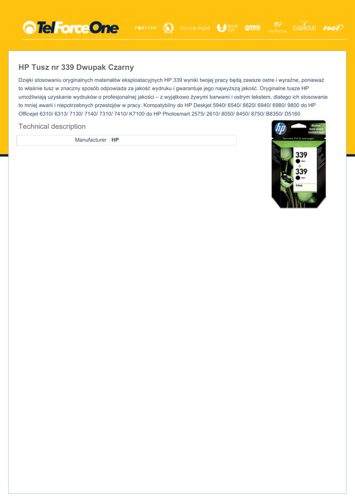 HP Tusz nr 339 Dwupak Czarny Dzięki stosowaniu oryginalnych materiałów eksploatacyjnych HP 339 wyniki twojej pracy będą zawsze ostre i wyraźne, ponieważ to właśnie tusz w znaczny sposób odpowiada za jakość wydruku i gwarantuje jego najwyższą jakość. Oryginalne tusze HP umożliwiają uzyskanie wydruków o profesjonalnej jakości – z wyjątkowo żywymi barwami i ostrym tekstem, dlatego ich stosowanie to mniej awarii i niepotrzebnych przestojów w pracy. Kompatybilny do HP Deskjet 5940/ 6540/ 6620/ 6940/ 6980/ 9800 do HP Officejet 6310/ 6313/ 7130/ 7140/ 7310/ 7410/ K7100 do HP Photosmart 2575/ 2610/ 8050/ 8450/ 8750/ B8350/ D5160 Technical description Manufacturer HP