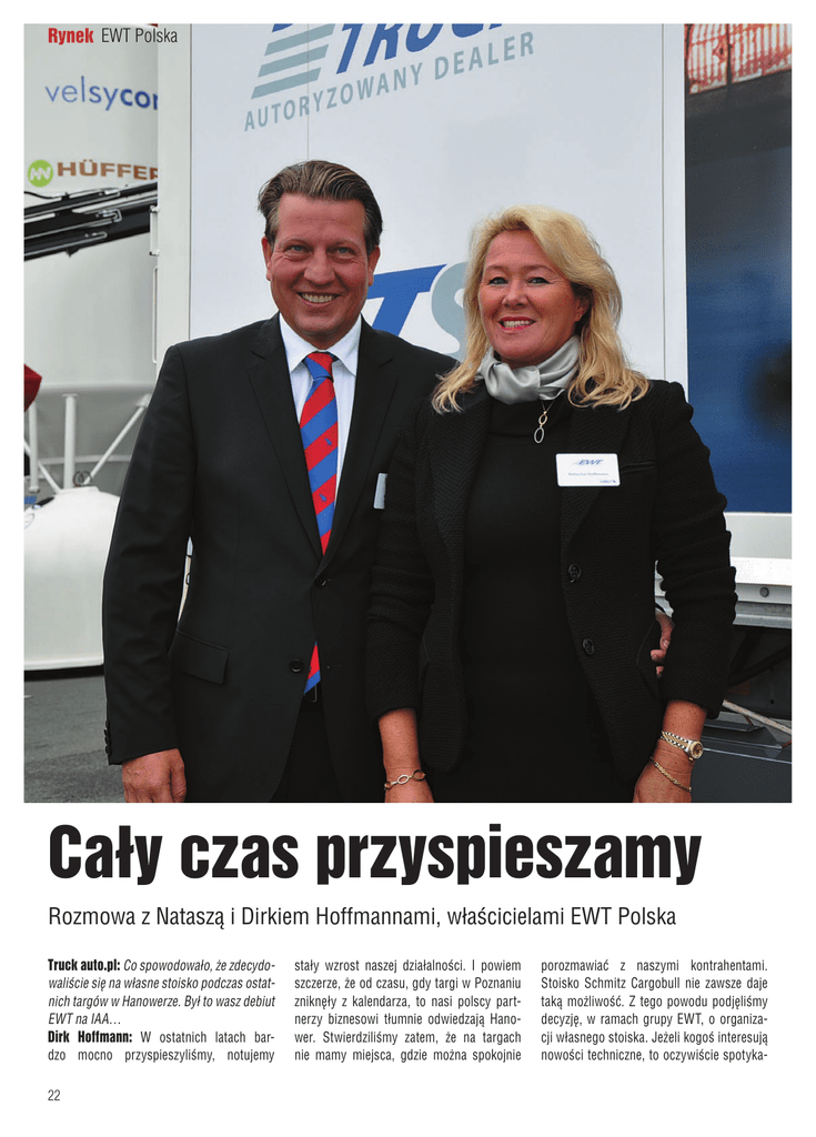 Rynek EWT Polska Cały czas przyspieszamy Rozmowa z Nataszą i Dirkiem Hoffmannami, właścicielami EWT Polska Truck auto.pl: Co spowodowało, że zdecydowaliście się na własne stoisko podczas ostatnich targów w Hanowerze. Był to wasz debiut EWT na IAA… Dirk Hoffmann: W ostatnich latach bardzo mocno przyspieszyliśmy, notujemy 22 stały wzrost naszej działalności. I powiem szczerze, że od czasu, gdy targi w Poznaniu zniknęły z kalendarza, to nasi polscy partnerzy biznesowi tłumnie odwiedzają Hanower. Stwierdziliśmy zatem, że na targach nie mamy miejsca, gdzie można spokojnie porozmawiać z naszymi kontrahentami. Stoisko Schmitz Cargobull nie zawsze daje taką możliwość. Z tego powodu podjęliśmy decyzję, w ramach grupy EWT, o organizacji własnego stoiska. Jeżeli kogoś interesują nowości techniczne, to oczywiście spotyka- liśmy się na stoisku Schmitza. Natomiast na rozmowy kuluarowe zapraszaliśmy na nasze własne stoisko. W bardziej nieformalnej atmosferze mogliśmy omówić wszystkie tematy, bez limitu czasu czy miejsca. A było o czym dyskutować, ponieważ sprzedajemy nie tylko naczepy, oferujemy również usługi serwisowe w bardzo szerokim zakresie. W ramach serwisu chcemy także współpracować z przewoźnikami rosyjskimi, białoruskimi. Dlatego tak ważna była organizacja własnego stoiska, aby w spokoju i przyjemnej atmosferze można było po prostu pomówić o współpracy. Dziś, z perspektywy kilku miesięcy, jesteśmy niezwykle zadowoleni z organizacji firmowego stoiska na IAA. Także i nasi partnerzy bardzo pozytywnie ocenili nasz debiut w Hanowerze. Truck auto.pl: Jakie plany macie na najbliższą przyszłość? Dirk Hoffmann: W najbliższym czasie chcemy zwiększyć naszą obecność na Śląsku. Obiekty EWT, wynajmowane w Gliwicach, są zbyt małe. Na pewno w tym regionie musimy rozbudować serwis. Tego wymagają nasi partnerzy biznesowi. Chcemy też udoskonalić model finansowania zakupu naszych pojazdów. Mam tu na myśli skonstruowanie lepszych, bardziej korzystnych propozycji kredytowych, leasingowych czy wynajmu pojazdów. Często nasze produkty finansowe to propozycje firmy-siostry Cargobull Finance, choć współpracujemy także z firmami zewnętrznymi. Wart podkreślenia jest jeden bardzo ważny fakt – bez względu na źródło i model finansowania zakupu naczepy, zawsze gwarantujemy korzystną cenę odkupu. Truck auto.pl: Jak oceniacie nowe rozwiązania Schmitza, mam tu na myśli podłużnice gięte z jednego profilu. Czy przyjmie się ono na polskim rynku? Dirk Hoffmann: Absolutnie tak, nowe podłużnice nie posiadają spawów a wiemy, że każdy spaw niesie ze sobą potencjalne ryzyko uszkodzenia. Technologia giętych podłużnic minimalizuje takie ryzyko. Powierzchnia zewnętrzna pozostaje ocynkowana. Naczepy nie tylko wyglądają lepiej, ale też są bardziej wytrzymałe na obciążenia mechaniczne, odporne są również na sól stosowaną do zimowego utrzymania dróg. Te cechy nowych naczep zdecydowanie docenią też przewoźnicy jeżdżący na Wschód. Sprzedaż naczep plandekowych w pierwszej połowie 2014 roku była rewelacyjnie dobra Truck auto.pl: Jesteście liderem w sprzedaży naczep chłodniczych. Czy odczuwacie recesję związaną z rosyjskim embargiem na unijne produkty spożywcze? Dirk Hoffmann: Oczywiście dostrzegamy spadek sprzedaży chłodni. Ten segment rynku skurczył się o ok. 25 proc. Wynika to w głównej mierze z konfliktu ukraińsko-rosyjskiego i obniżenia liczby transportów do Rosji wskutek embarga. Oczywiście chłodnie sprzedajemy dalej dla podmiotów wykonujących transport krajowy. Są to zarówno średni przewoźnicy, jak i duże sieci handlowe. Truck auto.pl: A jak sytuacja się przedstawia w przypadku naczep plandekowych? Dirk Hoffmann: Sprzedaż naczep plandekowych w pierwszej połowie 2014 roku była rewelacyjnie dobra. W Polsce notowano rejestrację ponad 800 naczep miesięcznie. W drugiej połowie roku nie było już tak dobrze, ale rynek naczep plandekowych jest stabilny i mniej uzależniony od sytuacji na rynku rosyjskim. Truck auto.pl: Wspomnieliście, że usługi serwisowe oferujecie także dla rosyjskich przewoźników. Jak oceniacie potencjał tej działalności? Dirk Hoffmann: Wielu rosyjskich przewoźników dokonuje napraw serwisowych w naszym punkcie w Strykowie. Atrakcyjność serwisu w Polsce wynika z ekonomii. W Rosji koszt części zamiennych jest wyższy ze względu na niemałe opłaty celne. Eksport usługi serwisowej fakturujemy bez VAT, co stanowi dodatkową atrakcyjność naszej oferty dla rosyjskich przewoźników. Ważne jest również to, że rosyjski kierowca jest obsługiwany w języku ojczystym. Truck auto.pl: Jak rozwija się pion sprzedaży naczep używanych? Dirk Hoffmann: Na potrzeby sprzedaży naczep używanych założyliśmy oddzielną firmę – TTS. Kieruje nią Matthias Lelke, posiadający bogate doświadczenie w obsłudze rynku pojazdów używanych. Chcemy tę działalność dalej profesjonalizować i koordynować ze sprzedażą nowych pojazdów w zakresie gwarancji odkupu po korzystnej cenie. Aby to zapewnić, specjalnie dla pojazdów 3-5letnich powołaliśmy oddzielną organizację z siedzibą w Strykowie, gdzie jest możliwość odpowiedniej ekspozycji oferowanych pojazdów używanych. Sprzedaż pojazdów używanych z biegiem lat będzie coraz ważniejsza. Ten segment rynku ma olbrzymi potencjał. Dlatego oferujemy bardzo korzystne ceny odkupu dla firm współpracujących z nami. Truck auto.pl: Jesteście na rynku od wielu lat. Jak dziś oceniacie polskich przewoźników? Dirk Hoffmann: Polski przewoźnik zawsze próbował dostosować się do rynku, szukał nowych możliwości, dróg i w tym się nie zmienił. Jeszcze przed kilkoma laty najważniejsza była cena zakupu, dziś w Polsce zwraca się uwagę na koszty eksploatacji. Przewoźnik bierze pod uwagę rzeczywiste koszty, a nie tylko cenę zakupu. Coraz częściej mamy pytania o kontrakty serwisowe